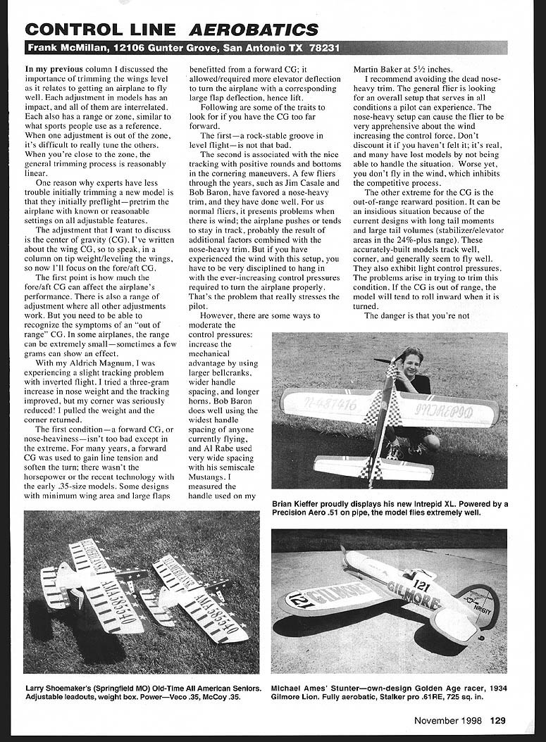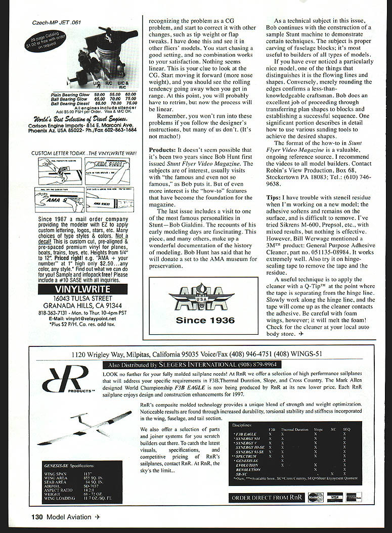 CONTROL LINE AEROBATICS U ~Ti1 n previous column discussed importance trimming wings level relates getting airplane fly well adjustment models has impact interrelated also has range zone similar what sports people use reference adjustment out zone its difficult really tune others youre close zone general trimming process reasonably linear reason experts have less trouble initially trimming new model initially preflightpretrim airplane known reasonable settings adjustable features adjustment want discuss center gravity CG Ive written about wing CC speak column tip weight/leveling wings now Ill focus fore/aft CC first point much fore/aft CC can affect airplanes performance also range adjustment other adjustments work need able recognize symptoms out range ome airplanes range can extremely smallsometimes few grams can show effect Aldrich Magnum experiencing slight tracking problem inverted flight tried three-gram increase nose weight tracking improved corner seriously reduced pulled weight corner returned first conditiona forward CC nose-heavinessisnt too bad except extreme years forward CC used gain line tension soften turn wasnt horsepower recent technology early 35-size models Some designs minimum wing area large flaps benefitted forward CC allowed/required elevator deflection turn airplane corresponding large flap deflection hence lift Following some traits look have CC too far forward firsta rock-stable groove level flightis bad second associated nice tracking positive rounds bottoms cornering maneuvers few fliers through years such Jim Casale Bob Baron have favored nose-heavy trim have done well us normal fliers presents problems wind airplane pushes tends stay track probably result additional factors combined nose-heavy trim have experienced wind setup have very disciplined hang ever-increasing control pressures required turn airplane properly Thats problem really stresses pilot However some ways moderate control pressures increase mechanical advantage using larger bellcranks wider handle spacing longer horns Bob Baron does well using widest handle spacing anyone currently flying Al Rabe used very wide spacing semiscale Mustangs measured handle used Martin Baker 5/2 inches recommend avoiding dead noseheavy trim general flier looking overall setup serves conditions pilot can experience nose-heavy setup can cause flier very apprehensive about wind increasing control force Dont discount havent felt its real have lost models being able handle situation Worse yet dont fly wind inhibits competitive process other extreme CC out-of-range rearward position can insidious situation because current designs long tail moments large tail volumes stabilizer/elevator areas 24%-plus range accurately-built models track well corner generally seem fly well also exhibit light control pressures problems arise trying trim condition CC out range model will tend roll inward turned danger youre Larry Shoemakers Springfield MO Old-Time American Seniors Michael Ames Stunterown-design Golden Age racer 1934 Adjustable leadouts weight box PowerVeco 35 McCoy 35 Gilmore Lion Fully aerobatic Stalker pro 61 RE 725 sq November 1998 129 Brian Kieffer proudly displays new Intrepid XL Powered Precision Aero 51 pipe model flies extremely well Czech-MP JET 061 Plain Bearing Glow500065006000 Ball Bearing Glow 650070007500 Ball Bearing Diesel 650070007500 engines include silencer Add $500 P&H per Order Vise & M/C OK 76Wd C4C Sddn ae4 Carison Engine Imports- 814 E Marconi Ave Phoenix Az USA 85022- Ph/Fax 602-863-1684 CUSTOM LETTER TODAY.THE VINYL WRITE WAY IXZIE7fl MM ages Since 1987 mail order company providing modeler EZ apply custom lettering logos stars etc choices type styles & colors decal custom cut pre-aligned & pre-spaced premium vinyl planes boats trains toys etc Heights 1/4 12 Priced right eg AMA er 1 high $250. color style Find out what can foryou S ample infopack free Please include #10 SASE inquiries 16043 TULSA STREET GRANADA HILLS CA 91344 818-363-7131 Mon Thur 1O-4pm PST E-Mail vinylrt@relaypointnet Plus $2 P/H Ca res add tax recognizing probtem CG problem start correct other changes such tip weight flap tweaks have done see other fliers models start chasing good setting no combination works satisfaction Nothing seems linear clue look CG Start moving forward nose weight shoutd see rolling tendency going away get range point will probably have retrim now process will linear Remember wont run problems follow designers instructions us dont Its macho Products It doesnt seem possible its two years since Bob Hunt first issued Stunt Flyer Video Magazine subjects interest usually visits famous famous Bob puts interest how-to features have become foundation magazine last issue includes visit famous personalities StuntBob Gialdini recounts early modeling days fascinating piece others make up wonderful documentation history modeling Bob Hunt has said will donate set AMA museum preservation As technical subject issue Bob continues construction sample Stunt machine demonstrate certain techniques subject proper carving fuselage blocks its useful builders types models have ever noticed particularly nice model things distinguishes flowing lines shapes Conversely merely rounding edges confirms less-thanknowledgeable craftsman Bob does excellent job proceeding through transferring plan shapes blocks establishing successful sequence significant portion describes detail use various sanding tools achieve desired shapes format how-to Stunt Flyer Video Magazine valuable ongoing reference source recommend videos model builders Contact Robins View Production Box 68 Stockertown PA 18083 Tel 610 7469638 Tips I have trouble stencil residue Im working new model adhesive softens remains surface difficult remove Ive tried Sikrens M-600 Prepsol etc mixed results nothing effective However Bill Werwage mentioned 3MTM product General Purpose Adhesive Cleaner part no051135-08984 works extremely well Also try hingesealing tape remove tape residue 