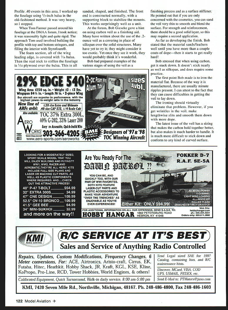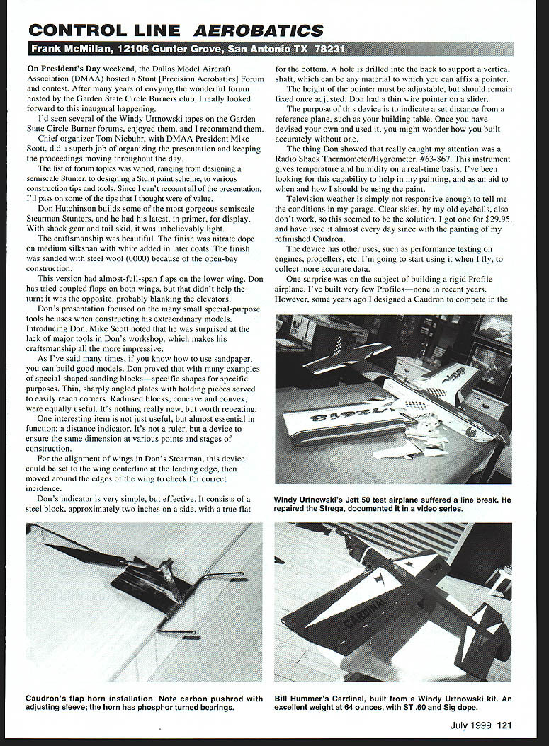 CONTROL LINE AEROBATICS ttd e fl r era EIUfl 111 rZJ JavA- tl W Presidents Day weekend Dallas Model Aircraft Association DMAA hosted Stunt [Precision Aerobatics] Forum contest After years envying wonderful forum hosted Garden State Circle Burners club really looked forward inaugural happening Id seen several Windy Urtnowski tapes Garden State Circle Burner forums enjoyed recommend Chief organizer Tom Niebuhr DMAA President Mike Scott did superb job organizing presentation keeping proceedings moving throughout day list forum topics varied ranging designing semiscale Stunter designing Stunt paint scheme various construction tips tools Since cant recount presentation Ill pass some tips thought value Don Hutchinson builds some gorgeous semiscale Stearman Stunters latest primer display shock gear tail skid unbelievably light craftsmanship beautiful finish nitrate dope medium silkspan white added later coats finish sanded steel wool 0000 because open-bay construction version almost-full-span flaps lower wing Don has tried coupled flaps both wings didnt help turn opposite probably blanking elevators Dons presentation focused small special-purpose tools uses constructing extraordinary models Introducing Don Mike Scott noted surprised lack major tools Dons workshop makes craftsmanship impressive As Ive said times know use sandpaper can build good models Don proved examples special-shaped sanding blocksspecific shapes specific purposes Thin sharply angled plates holding pieces served easily reach corners Radiused blocks concave convex equally useful Its nothing really new worth repeating interesting item just useful almost essential function distance indicator Its ruler device ensure same dimension various points stages construction alignment wings Dons Stearman device could set wing centerline leading edge moved around edges wing check correct incidence Dons indicator very simple effective consists steel block approximately two inches side true flat bottom hole drilled back support vertical shaft can material can affix pointer height pointer must adjustable should remain fixed once adjusted Don thin wire pointer slider purpose device indicate set distance reference plane such building table Once have devised own used might wonder built accurately thing Don showed really caught attention Radio Shack ThermometerlHygrometer #63-867 instrument gives temperature humidity real-time basis Ive looking capability help painting aid should using paint Television weather simply responsive enough tell conditions garage Clear skies old eyeballs also dont work seemed solution got $2995 have used almost day since painting refinished Caudron device has other uses such performance testing engines propellers etc Im going start using fly collect accurate data surprise subject building rigid Profile airplane Ive built very few Profilesnone recent years However some years ago designed Caudron compete July1999 121 Windy Urtnowskis Jett 50 test airplane suffered line break repaired Strega documented video series Caudrons flap horn installation Note carbon pushrod Bill Hummers Cardinal built Windy Urtnowski kit An adjusting sleeve horn has phosphor turned bearings excellent weight 64 ounces ST 60 Sig dope Profile 40 events area worked up fuselage using /2-inch balsa old-fashioned method very heavy stopped Tom Farmer passed around fuselage DMAA forum took notice reasonably light quite rigid approach Tom used involved building profile top bottom stringers filling interior Styrofoam foam section aft wing leading edge covered 1/16 balsa real trick stiffen fuselage 1/32 plywood over balsa sanded shaped finished front end constructed normally supporting block stabilize mounts works surprisingly well unit forum Bob Gieseke gave hint using carbon veil finishing aid have written about use 2ounce veil covering place silkspan over solid structures have yet try might consider too exotic Yet once see work would probably think its wonderful Bob prepared examples various stages using veil finishing process surface stiffener pointed out concerned cosmetics can sand veil very thin smooth blend surface strength reinforcement should good solid layer may require second application As far developing finish Bob stated material sands/feathers well until have couple coats dopethen starts get really hard Bob stressed using carbon get stuck down doesnt stick nearly well silkspan does require some practice first point Bob made iron material flat Because way manufactured usually minute ripples present can attest fact can cause difficulties getting veil lay down ironing should virtually eliminate problem However get wrinkles veil make lengthwise slits smooth down dope latest issue veil has sizing makes carbon hold together better also makes much harder handle much difficult stick down conform kind curved surface f/ RIC SERVICE AT ITS BEST /RAD~TROLSales Service Anything Radio Controlled KMI 7420 Seven Mile Rd Northville Michigan 48167 Ph 248-486-4800 Fax 248-486-1603 Repairs Updates Custom Modifications Frequency Changes 6 Send Legal sized SAE 1997 Meter conversions ACE Airtronics Aristo-craft Cirrus EK Catalog containing lists R/C maintenance hints Futaba Hitec Heathkit Hobby Shack JR Kraft KGL KSE Kline Discover MCard VISA COD KoPropo Pro-Line RCD Tower Hobbies World Engines & others UPS USMAIL FEDEX etc Calibrated Equipment Quick Turnaround Walk-in daily service 800 am-500 pm Send E-Mail PTWaters@junocom 122 Model Aviation Area 1250 sq Weight 12. 13 WIngspan 84 1/r th 76 ece aircraft superior performance highest power-to-weight ratio Industry New line ARFs avbl TOC 37% Extra 3081 ERO 40% G-202 33% Laser Assemble Quick-build kits Are Ready F YOU CAN BE AND QUICKLY TOO WITH OUR PAIR OF WWI FAVORITES BOTH KITS FEATURE LASER-CUT PARTS AND PLASTIC ACCESSORIES TO MAKE YOUR ADVENTURE OVERTHETRENCHES AS ENJOYABLE AS YOUVE EVER EXPERIENCED FOR ADDITIONAL INFORMATION ON ALL OUR OFFERINGS SEND SASE TO 1862 PETERSBURG ROAD HOBBY HANGAR HEBRON KY 41048 couple