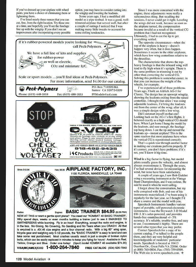 CONTROL LINE AEROBATICS havent written about trimming thought Id get very narrow subject can seriously affect other trim adjustments vertical center gravity CG think CC usually focus fore-and-aft CG does have big impact flight characteristics Having airplane vertical CG located line leadout exit will prevent achieving usual first step trim process leveling wings Before get too far Ill explain what Im considering airplane suspended leadouts displacement vertical CC line extension leadout exit intersects fuselage will force created will pull fuselage pull will attempt force vertical CC line leadouts model flying force working fuselage naturally affects wings displacement just little off wing cannot leveled properly As new airplane its good idea check vertical CC Its simple because things required way suspend masterpiece leadouts plumb bob idea look model hanging versus true vertical plumb bob line Somewhat surprisingly problem will show up quite vividly have decide CC what corrective action take important realize have fix problem have built popular design chances will ballpark constructed model according plans SV series Randy Smith calls centerline leadouts /s-inch below centerline tip rib Bill Werwage piped designs call leadouts similar relative position susceptible vertical CC problem pre-pipe era because lighter weight power systems although its still good idea check airplane Take situation looking front gear hangs down indicating CC below leadouts flight static weight would multiplied centrifugal force greatly accentuating offset circumstance forces inboard wing fly low wing true properly aligned dont recognize have vertical CC problem can wind up chasing impossible situation Ive done several times its no fun unusual situation lower portion model heavier bottom need think about fix situation have consider severity Before exploring necessity cut can lighten components Wheels big source weightespecially nicelooking commercial ones such Dave Brown brand very light wheels Tettra also favorite because beautiful turned aluminum hubs possible cut ounce Another area landing gear aluminum gear youre typically looking two ounces modem technology helpful supplier carbon replacement can get model nearly ounce lighter October1999 119 Jim Kosteckys Cutlass Classic-legal design early 1960s New version powered Aldrich-modified McCoy 40 Bill Werwage pull-tests Bob McDonalds smart originals Bear Bob Gieseke another Bear design lightweight 1997 F2B FAI CL Aerobatics team trials smallish roughly 650 sq 52 oz piped PA 60 youve dressed up airplane wheel pants have choice eliminating lightening Ive listed nearly three ounces can cut free right location Try time hopefully youll see fuselage lineup wingtip dont see improvement after incorporating possible option may have consider cutting wingtip lowering leadouts Some years ago modified 60 model pipe testbed good welltrimmed airplane served well after couple outings noticed making little tweaks account some rolling tendencies r its rubber-powered models youre looking call Peck-Polymers have full line kits supplies rubber-power/ well electric miniature R/C C02 Scale sport models ulI find ideas Peck-Polymers information send $400 catalog P0 Box 710399-MA w-uuuymesSantec CA 92072-0399 L Phone 619 448-1818Fax 619 488 1833PPModels@aolcom CHECK ITOH SREAL TIME ALL THE MEW TU o18volsneadId Mounts fuselage side cockpit easily seen place Plugs unused receiver channel Moving servos shows loaded battery voltage Helicopter version available enclosed plastic case 1it CkAIRPLANE VERSION $3995 HELIcoIrER VERSION $4495 You-p. VDLTAEi4C Products ~t 92,dTili OK 74133 53i5 c 915 492 9S7S Since concerned engine adjustments really subconscious thing recalling sessions never could get right Leveling wings did work because soon airplane tumed compensation became invalid result vertical CG problem recognized Ultimately cut tip get everything settled opposite circumstancewhen top airplane heavydoesnt happen very often does happen Sometimes occurs older airplanes have low wing centerlines relative thrustline characteristic shows topheavy fuselage inboard wing will tend fly high its upright same problem trimming out other correcting vertical CG Solving problem somewhat easier can increase weight wheels example Ive experienced problems Years ago built Aldrich AG-i Classic design has upswept wingtip showing leadouts exiting raised centerline thought since using adjustable leadouts Id bring leadouts out center wing after simple design low wing Did outsmart myself Looking back AG-is first flights behaved exactly high vertical CG should have got home hung model leadouts sure enough fuselage top hung down cut tip moved leadouts upinstant airplane same reaction airplanes have vertical CG repositioned correctly Thats quick tour through another factor making creations perform properly its correct dont have problems its youll know big-time Wind big factor flying model pilots usually guess velocity almost always overestimate Through years Ive several devices measuring wind have satisfactory couple years ago saw Bob Gialdini using measuring instrument Vintage Stunt Championships curious said used went sailing forgot about conversation wife conspired Bob instruments materialized Ive using regularly last year thought Id share source model Speedtech Instruments handles various types portable self-powered electronic instruments use Skywatch 3-D Model SW-3 Its solar-powered provides hands-free omnidirectional 5% accuracy Its reliable trouble-free easy use recommend highly several other types may prefer Contact Speedtech copy its current catalog Ive talked people very helpful knowledgeable modelers particular needs Speedtech located 10413 Deerfoot Dr Great Falls VA 22066 Order 800 760-0004 Fax 703 759-0509 Web site wwwspeedtechcom Model Aviation LANE FACTORY INC 1135 FLORIDA MANDEVILLE LA 70448 NEW AT THIS want gentle sport plane need KOMBAT 40 BASIC TRAINER spend days weeks months building trainer just 