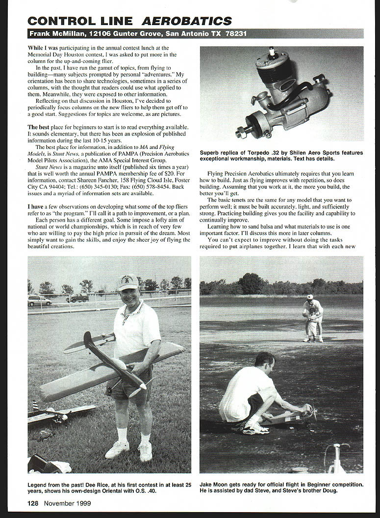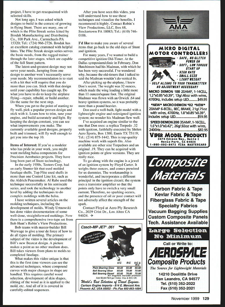 CONTROL LINE AEROBATICS participating annual contest lunch Memorial Day Houston contest asked put column up-and-coming flier past have run gamut topics flying buildingmany subjects prompted personal adventures orientation has share technologies sometimes series columns thought readers could use what applied Meanwhile exposed other information Reflecting discussion Houston Ive decided periodically focus columns new fliers help get off good start Suggestions topics welcome pictures best place beginners start read everything available sounds elementary has explosion published information during last 10-15 years best place information addition MA Flying Models Stunt News publication PAMPA Precision Aerobatics Model Pilots Association AMA Special Interest Group Stunt News magazine unto itself published six times year well worth annual PAMPA membership fee $20 information contact Shareen Fancher 158 Flying Cloud Isle Foster City CA 94404 Tel 650 345-0130 Fax 650 578-8454 Back issues myriad information sets available have few observations developing what some top fliers refer program Ill call path improvement plan person has different goal Some impose lofty aim national world championships reach very few willing pay high price pursuit dream Most simply want gain skills enjoy sheer joy flying beautiful creations Flying Precision Aerobatics ultimately requires learn build Just flying improves repetition does building Assuming work build better youll get basic tenets same model want perform well must built accurately light sufficiently strong Practicing building gives facility capability continually improve Learning sand balsa what materials use important factor Ill discuss later columns cant expect improve doing tasks required put airplanes together learn new 128 November1999 Superb replica Torpedo 32 Shilen Aero Sports features exceptional workmanship materials Text has details Legend past Dee Rice first contest least 25 Jake Moon gets ready official flight Beginner competition years shows own-design Oriental 0S 40 assisted dad Steve Steves brother Doug project have get reacquainted selected skills long ago asked designs build context growing flying Stunt Flite Streak series kitted Brodak Manufacturing Distributing Co 100 Park Ave Carmichaels PA 15320 Tel 724 966-2726 Brodak has excellent catalog crammed helpful hints Flite Streak design series serves basic needs rugged trainer through later stages capable full Stunt pattern latest-and-greatest design may serve needs Jumping design another wont necessarily serve needs recommendation start kit will require you can Stick design until capability has caught up what have to keep airplane flyingrepair rebuild build another same next step get point starting fly well pick popular proven design stick Learn trim tune engine build accurately light keeping design constant can see what improvements make currently available good designs properly built trimmed will fly well enough get top 10 Items Interest youre modeler has pride work might want molding balsa components Precision Aerobatics projects have long part Stunt technology early 1950s Testors Corp early Stunter kit used molded fuselage shells Top Flite used shells Control Line kit such Aldrich Peacemaker Al Rabe used technique successfully semiscale series took technology another level adding techniques complex moldings balsa have written several articles molding techniques including development molds Windy Urtnowski has done video documentation some well-done straightforward moldings Now comprehensive two-tape set Bob Hunts Robins View Productions Bob teams master-builder Bill Werwage give tour de force types molding primary subject video development Bills new Bearcat design picture makes point no other medium does Bill takes viewers plans molds completed fuselage What makes video unique first time viewers can see advanced techniques compound curves major changes shape handled requires careful wood selection development skin shapes slitting wood applied mold etc covered carefully-edited sequences After have seen video will understand use techniques visualize benefits recommend highly Contact Robins View Productions LLC Box 68 Stockertown PA 18083 Tel 610 7460106 Id like make aware several items go back old days Stunt ignition years Ive wanted build competitive ignition Old-Timer Dallas symposium/clinic February Don Hutchinson Madman has very successful Ive wondered because old-timers talked said Madman wouldnt vertical 8s After picking up airplane knew Dons secret weight 32 ounces made wing loading little 11 ounces/square foot original Madman flown Orwick 64 heavy ignition systems probably pound heavier Don used well-built light model lightweight engine redesigned ignition system no wonder Madman flew well Ive acquired engine similar Don uses replica Torpedo 32 ignition faithfully executed Shilen Aero Sports Box 1300 Ennis TX 75119 Tel 214 875-1442 top-quality machine work superb fits Also available other size Torpedoes original 19 can acquired ignition points glow versions really nice go along engine jewel ignition system Floyd Carter weighs three ounces comes prewired us dummies workmanship wonderful incorporates different principal ignition circuit system uses transistor amplifier points have switch very small current Therefore no sparking occurs presence oil poor contact will adversely affect strength spark Contact Floyd Aero Ply Research Co 2029 Crist Dr Los Altos CA 94024 O DIGITAL MOTOR CONTROLLERS SAFE NO GLITCH POVER ON SOFT LOW TORQUE START UP \ NIGN RATE SMALL SIZE LIGHT WEIGHT SELF ALIGNS TO YOUR TRANSMITTER NO ADJUSTMENT NECESSARY MICRO DEMON 100 2OAMP 1-14CELL 12xO85x039 13g14Goz wires 4700Hz includes setup LED *N* MICRO DEMON 102 *NEW* 2OAMP 6-8CEJJ BEC BRAKE 21g/75oz wires 4700Hz iS xOS5 x039 indudes setup LED.$5995 SPEED DEMON 200 35AMP 1-16cELL 16 xl0 x0A2 26g192oz wires 2400Hz-..$8295 VIPER MODEL PRODUCTS 3475 Edison Way SUit Menlo Park CA 94025 1-600-592-8473 VISA MASTERCARD Carbon