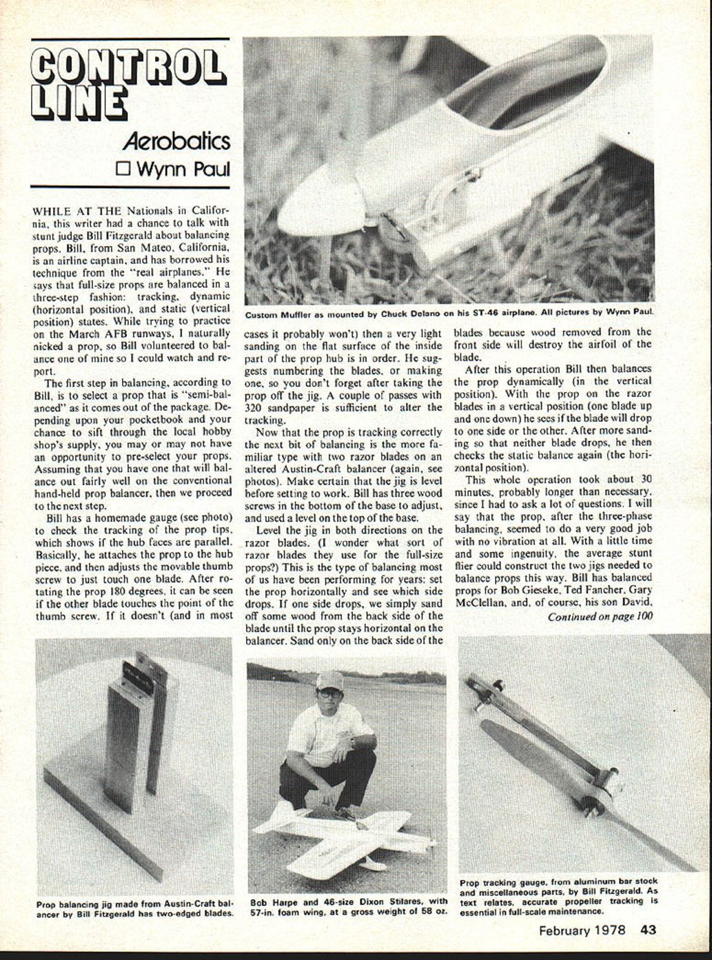 Aerobahcs El Wynn Paul WHILE AT THE Nationals Califor nia writer chance talk stunt judge Bill Fitzgerald about balancing props Bill San Mateo California airline captain has borrowed technique real airplanes says full-size props balanced three-step fashion tracking dynamic horizontal position static vertical position states trying practice March AFB runways naturally nicked prop Bill volunteered bal ance could watch re port first step balancing according Bill select prop semi-bal anced comes out package De pending upon pocketbook chance sift through local hobby shops supply may may have opportunity pre-select props Assuming have will bal ance out fairly well conventional hand-held prop balancer proceed next step Bill has homemade gauge see photo check tracking prop tips shows hub faces parallel Basically attaches prop hub piece adjusts movable thumb screw just touch blade After ro tating prop 180 degrees can seen other blade touches point thumb screw doesnt cases probably wont very light sanding flat surface inside part prop hub order sug gests numbering blades making dont forget after taking prop off jig couple passes 320 sandpaper sufficient alter tracking Now prop tracking correctly next bit balancing fa miliar type two razor blades altered Austin-Craft balancer again see photos Make certain jig level before setting work Bill has three wood screws bottom base adjust used level top base Level jig both directions razor blades wonder what sort razor blades use full-size props type balancing us have performing years set prop horizontally see side drops side drops simply sand off some wood back side blade until prop stays horizontal balancer Sand back side blades because wood removed front side will destroy airfoil blade After operation Bill balances prop dynamically vertical position prop razor blades vertical position blade up down sees blade will drop side other After sand ing neither blade drops checks static balance again hori zontal position whole operation took about 30 minutes probably longer necessary since ask lot questions will say prop after three-phase balancing seemed very good job no vibration little time some ingenuity average stunt flier could construct two jigs needed balance props way Bill has balanced props Bob Gieseke Ted Fancher Gary McClellan course son David February 1 978 43 Custom Mufiler mounted Chuck Delano ST-46 airplane pictures Wynn Paul Continued page 100 Prop balancing jig made trom Austin-Craft bal ancer Bill Fitzgerald has two-edged blades Prop tracking gauge aluminum bar stock miscellaneous parts Bill Fitzgerald As Bob Harpe 46-size Dixon Stilares text relates accurate propeller tracking 57-in foam wing gross weight 58 oz essential full-scale maintenance CATALOG 25c DAVIS 22 D-IKPLAN 1 CSD-7BY Chas E Steinchak MODERNISTIC MODELS PO B0X6974ALBUQNM87107, KITS S 0 ACCESSORIES BABY ACEP-N UT KITS N BEARINGS BROWN CO-2 ENGINES RE AL JAPANESE TISSUE-PROPS I17 SPAN 4COMPLETE CATALOG 50q IKIT $425MANY HARD TO FIND ITEMS Pee*-haw BOX 2493LA MESA CALIF 92041 4720 Ashbrook Rd Dallas TX have turned 18011 18086 mph respectively stock ST X-15s except chromed liners new heads Dub will chrome fit liners about $18 David will other work Brent Bussell Dallas TX has turned 186 stock X-29 understand Nick Shear 815 Beech Rd Langhorne PA 19047 has done 188 Patrick Hempel holds Senior B record 19264 mph practically stock K&B 40 mini-pipe Charley Anaston Dallas TX has turned 161-mph Formula 40 time very stock X40 could back up record hold Formula 40 record aK&B4ORRat 16181 mph received some photos contest re sults Nick Sher about BRM speed meet held September 24 25 near Allentown PA Nick says weekend rainy windy 670 Saturday 540 Sunday record speeds achieved Quay Barber Cleveland Glen Vansant Quay turned 9371 mph new Jr o record backed up 911 mph using TD 049 equipped new Gb Bee plug own molded high aspect ratio prop Glen blasted Senior Formula 40 15268 mph unable back up Next year right winners class through third place except B proto no entries Nich Sher also attended Dayton OH meet October 9 set new speed record 12157 mph using piped Cox 049 Al Stegans Cleve land OH turned 11837 mph open-faced no pipe prove can done pipe Frank Garzan put respectable 195 mph D speed using OPS 65 mini-pipe Beware because combination meets 78 79 rules October 15 16 saw Texas bunch get together Houston yearly end season contest five new national records established weather perfect 70 800 tem peratures 30% less humidity John Shannon started everything off right nice clean 196-mph B flight beat old 19347-mph record held himself Dub Jett dust hardly cleared Hempel Uptons mula 40 hit 16181 mph break old 15879-mph record backed up 15 minutes later slightly rich 1585mph flight congratulating other Shannon put back-up flight 198 mph really shook air figured John would relax after flight right after lunch put third flight fantastic 20032 mph make him fourth member cov eted 200-mph club John using own DJ529 80% nitro fuel Rev-up 7-11 TWA-type suction tank Sunday Patrick Hempel broke 18230-mph Senior C speed record clean 18530mph flight backed up another 185-mph flight Patrick using very stock K&B40 mini-pipe 7-12 Rev-up bladder fuel system 82% nitro fuel Ross Lewis father Jim couple new comers speed circle set Jr B profile proto record 122 mph backed up 120 mph Sunday afternoon became battle speed record Layman Giertz put screaming 18011 mph flight new record backed up put everything up until about 3 pm Dub Jett turned 18086-mph beat new record Dub blew two back-up attempts slow 174-mph flight lean Layman Gierty preparing battle again kept having problems engine cooling off Dub finally backed-up flight very clean 180 mph claim sixth final record weekend Boy did have fun new rules 1978-1979 have voted results I Drop proto replace profile proto age classes 2 B proto D speed will mini-pipes 3 All Jr Sr classes will mini-pipe next article David Layman will lay line tell go 180 mph speed Gene Hem pel Tom Upton 
