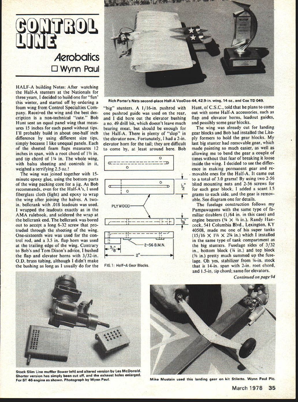 I Aerobatics El Wynn Paul HALF-A building Notes After watching Half-A stunters Nationals three years decided build fun winter started off ordering foam wing Control Specialties Com pany Received wing best des cription non-technical cute Bob Hunt sent equal panel wing meas ures 15 inches panel tips Ill probably build about one-half inch difference using different size tips simply because like unequal panels sheeted foam flaps measures 12 inches span root chord 1 tip chord 1 whole wing balsa sheeting controls weighed terrifying 25 oz wing joined together 15minute epoxy glue using bottom parts wing packing core jig As Bob recommends Half-As used fiberglass cloth light epoxy wrap wing after joining halves two bellcrank 018 leadouts used wrapped leadouts exactly AMA rulebook soldered wrap bellcrank end bellcrank bored out accept long 6-32 screw pro truded through sheeting wing One-sixteenth wire used con trol rod 35 flap horn used trailing edge wing Contrary Bobs Tom Dixons advice bushed flap elevator horns 3/32-in OD brass tubing although didnt make bushing long usually big stunters 1/16-in pushrod pushrod guide used rear did bore out elevator bushing no 49 drill bit doesnt leave much bearing meat should enough Half-A plenty s1op elevator now Fortunately 2-in elevator horn tail difficult come least around Bob 0 PLYWOOD II 2-56 8MN 2 FIG 1 HalfA Gear Blacks Hunt CSC told plans come out some Half-A accessories such flap elevator horns leadout guides possibly some gear blocks wing already cut landing gear blocks Bob installed Lite ply formers hold gear blocks last big stunter removable gear made painting much easier well allowing bend gear couple otimes fear breaking loose inside wing decided see differ ence making permanent gear re movable ones Half-A came out total 30 grams using two 2-56 oblind mounting nuts 2-56 screws for gear block added scant 15 grams side gear remov able See diagram details fuselage construction follows Pampawagons same type fa miliar doublers 1/64 in case engine bearers X y Han cock 541 Columbia Blvd Lexington KY 40508 made super tanks 15/16 X 1 X 2 installed same type tank compartment big stunters Fuselage sides 3/32 bottom block block /8 pretty much summed up fuse lage Oh yes stabilizer A-in stock 14-in span 2-in root chord 15-in tip chord same elevators 2 F 4-IMarch1978 35 Rich Porters Nats second-place Half-A VooDoo-44 429-in wing 14 oz. Cox TO 049 Continued page 94 Stock Slim Line muffler lower leftl altered version Los McDonald Shorter version has simply cut off exhaust holes enlarged ST 46 engine shown Photograph Wynn Paul Mike Mustain used landing gear kit Stiletto Wynn Paul Plc A Buck Half s need send big EAA info pack shown above Tells about EAA benefits EAA membership will mean Send buck half today Includes recent issue SPORT AVIATION Airplanes thing Want find out what real world sport aviation about youll want information EAA homebuilts antiques classics warbirds gliders rotary wing aerobatics other type sport aircraft turn Find out what takes build aircraftor design can join EAA chapter near benefit experience skills other builders EAA membership $2000 per year includes monthly SPORT AVIATION Junior membership 18 younger $1000 Information pack $150 78 WC England feel has lot potential contest will great representative United States Another unheralded CL scaler knows what takes win Dick Ruckel Mentor OH near Cleveland Dick spectator 76 Nats Dayton Watching big boys having same troubles modeler has convinced him could well following winter Dick studied Sport Scale rules decided well done simple model flyability would have better-than-average chance against incomplete complex model seemed go against some local notions decision based some simple facts Sport Scale 100 flight points possible no matter what subject model model capable performing full slate options will competitive could have advantage dependability comes simplicity Dick settled model famous Hazel Sig Clip ped Wing Cub try out theory Built Sig kit Cub 2 1 scale 56 wingspan points out no downgrade rules kits inaccuracies weighs 4 lbs 2 oz ready-to-fly Fox Falcon 60 12-6 prop little overkill power-to-weight ratio isnt Dick Cub finished white Permagloss Coverite re-shaded Aero Gloss blue dope actuates throttle engine cutoff i-Roberts handle bellcrank ailerons adjustable flight trim window door Cubs right side open scale fashion Dick spent about eight months 32 years 16 years hobby building finishing Cub satisfaction full flight plan Dick planned Clip Wing goes like 1 Take-off 0 10 points 2 10 Laps Oto 10 points 3 Touch & Go counts 2 options 0 20 points 4 Taxi counts 2 options 0 20 points 5 Wingover 0 10 points 6 Throttle Control FAI rules 0 10 points 7 Landing 10 points 8 Realism Flight 0 10 points 100 points max Using flight plan Cub impressive 77 Sport Scale record going undefeated Among wins note first Open Sport Scale prestigious 42nd Annual Cleveland Junior Air Races against tough competition included two 76 Nats trophy winners Dicks success non-mechanical optioned subject shouldnt seem unusual just consistent careful study rules cant completely agree him simple light planes have advantage certainly compet itive also raises question mind Could banner coverage magazines Nats WC class scale contests have projected mistaken intimidating picture CL Scale competition dont need re tracts flaps bombs cockpit detail six-function digital control system competitive Sport Scale already building scale enjoying company other scalers going few contests dont hesitate try just because unsure model potential will surprised well can study rule book know what expected contest Build right light practice fly scale subject can win Mike Gretz Box 162 Montezuma IA 50171 CL Aerobatics/Paul continued page 35 Now lets hear Half-A champions Rich Porter Florida College Temple Terrace FL 33617 has just experimenting Half-A competing several years varia tions Voo Doo combat ship con verted stunt flying quote 94 Model Aviation