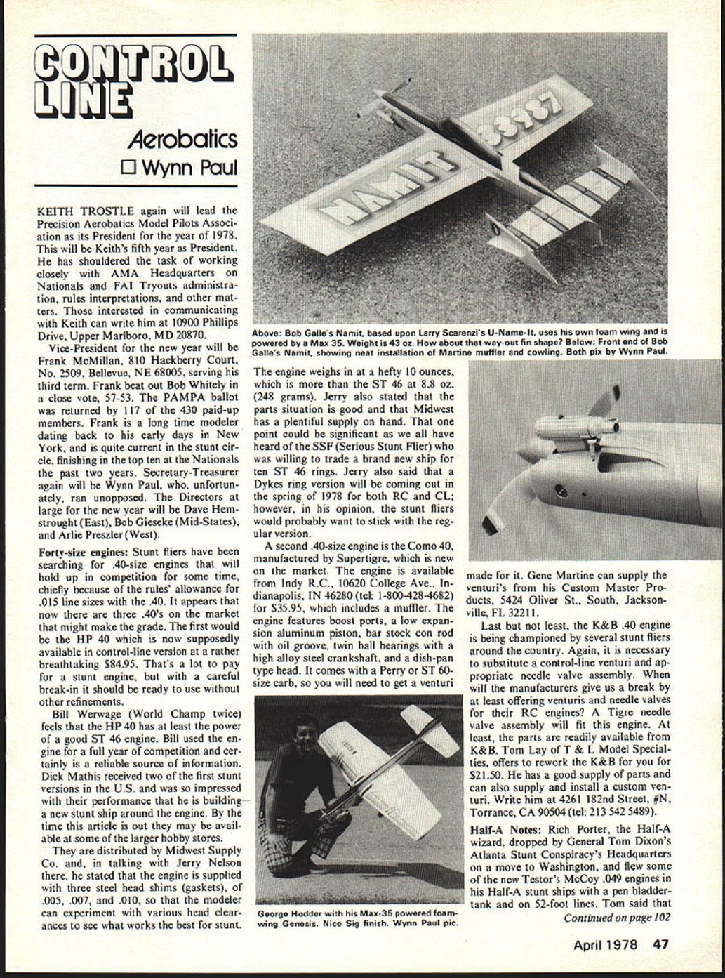 Aerobahcs E] Wynn Paul KEITH TROSTLE again will lead Precision Aerobatics Model Pilots Associ ation its President year 1978 will Keiths fifth year President has shouldered task working closely AMA Headquarters Nationals FAI Tryouts administra tion rules interpretations other mat ters interested communicating Keith can write him 10900 Phillips Drive Upper Marlboro MD 20870 Vice-President new year will Frank McMillan 810 Hackberry Court No 2509 Bellevue NE 68005 serving third term Frank beat out Bob Whitely close vote 57-53 PAMPA ballot returned 117 430 paid-up members Frank long time modeler dating back early days New York quite current stunt cir cle finishing top ten Nationals past two years Secretary-Treasurer again will Wynn Paul unfortun ately ran unopposed Directors large new year will Dave Hem strought East Bob Gieseke Mid-States Arlie Preszler West Forty-size engines Stunt fliers have searching 40-size engines will hold up competition some time chiefly because rules allowance 015 line sizes 40 appears now three 40s market might make grade first would HP 40 now supposedly available control-line version rather breathtaking $8495 Thats lot pay stunt engine careful break-in should ready use other refinements Bill Werwage World Champ twice feels HP 40 has least power good ST 46 engine Bill used en gine full year competition cer tainly reliable source information Dick Mathis received two first stunt versions US impressed performance building- new stunt ship around engine time article out may avail able some larger hobby stores distributed Midwest Supply Co talking Jerry Nelson stated engine supplied three steel head shims gaskets 005 007 010 modeler can experiment various head clear ances see what works best stunt engine weighs hefty 10 ounces ST 46 88 oz 248 grams Jerry also stated parts situation good Midwest has plentiful supply hand point could significant have heard SSF Serious Stunt Flier willing trade brand new ship ten ST 46 rings Jerry also said Dykes ring version will coming out spring 1978 both RC CL however opinion stunt fliers would probably want stick reg ular version second 40-size engine Como 40 manufactured Supertigre new market engine available Indy RC 10620 College Ave dianapolis IN 46280 tel 1-800-4284682 $3595 includes muffler engine features boost ports low expan sion aluminum piston bar stock con rod oil groove twin ball bearings high alloy steel crankshaft dish-pan type head comes Perry ST 60size carb will need get venturi made Gene Martine can supply venturis Custom Master Pro ducts 5424 Oliver St South Jackson ville FL 32211 Last least K&B 40 engine being championed several stunt fliers around country Again necessary substitute control-line venturi ap propriate needle valve assembly will manufacturers give us break least offering venturis needle valves RC engines Tigre needle valve assembly will fit engine least parts readily available K&B Tom Lay T & L Model Special ties offers rework K&B $2150 has good supply parts can also supply install custom ven turi Write him 4261 182nd Street #N Torrance CA 90504 tel 213 542 5489 Half-A Notes Rich Porter Half-A wizard dropped General Tom Dixons Atlanta Stunt Conspiracys Headquarters move Washington flew some new Testors McCoy 049 engines Half-A stunt ships pen bladdertank 52-foot lines Tom said Continued page 102 April 1978 47 Above Bob Galles Namit based upon Larry Scarenzis U-Namelt uses own foam wing powered Max 35 Weight 43 oz about way-out fin shape Below Front end Bob Galles Namit showing neat installation Martine muffler cowlina Both Dix Wynn Paul George Hodder Max-35 powered foam wing Genesis Nice Sig finish Wynn Paul pic SAVE THE BENT-WINGED BIRD HEY MODELERS SUPPORT THE BLACK SHEEP SQUADRON MANY OF YOU COMPLAINED WHEN THE TV SERIES WAS CANCELLED NOW THAT ITS ON AGAIN LETS SUPPORT THE SHOW BY LETTING NBC HEAR FROM US PERSONAL LETTER IS BEST BUT EVEN VOTE WILL HELP THE KIDS WILL LOVE YOU FOR IT MAYBE YOUR WIFE WILL ADDRESS THE ENVELOPE FOR YOU DONT DELAY T NOW CLIP AND SEND TO ROBERT CONRAD BLACK SHEEP SQD NBC-TV 3000W Alameda Burbank CA 91523 YES MY FAMILY TUNES IN THE BLACK SHEEP SQD EVERY WEDNESDAY NIGHT AND WE LOVE IT SIGNED CITY STATE gain counts Send check money order payable Smithsonian Institution National Air Space Museum Pub lications Smithsonian Institution Wash ington DC 20560 Mine took about four weeks delivery also have simi lar volume entitled Rockets Missiles Spacecraft National Air Space Museum $150 75 postage handling charge per book Mike Gretz Box 162 Montezuma IA 50171 CL Aerobatics/Paul continued page 47 planes really flew well new McCoy engines Hurray Bill Netze band long standing fight Half-A As soon Rich gets settled out West hope have report little hot half-As Custom Master Products attending King Orange Internationals over new years holidays chance visit Gene Martines fantastic shop setup Jacksonville Florida Gene slowly organizing operation will definite asset stunt fliers continual quest needed items produced larger manufacturers April May should completely set up distribute very good Custom Master Mufflers very good adjustable handle weighs very light 3 oz ven turis building weights nose weights other items Write Gene catalog address given earlier article Fuel Tanks want 5-ounce larg er tank ST 46 HP 40 Fox 45 engine about source know presently Randy Hancock custom makes 008 tin plate tanks work art well worth $1000 plus postage prices Write him 541 Columbia Blvd Lexington KY 40508 tel 606-252-8137 Foam Wings Look another manufac turer custom stunt foam wings near future John Poynter Kirk Mul linnix California getting business will soon have price list catalog available interested price list write J & K foam wings 10261 Janice Lynn Cypress CA 90630 also have heard Arnold Stott gets relocated Texas intends start producing wings again substan tial basis Havent heard him am certain will let Model viation know ready produce Stunt Scoring Change good possibility scoring system pro posed Se