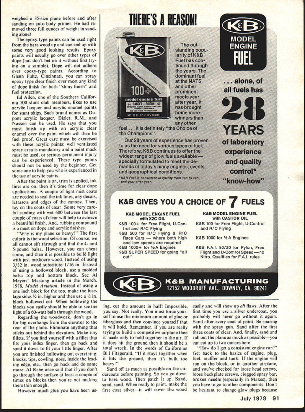Control Line Aerobatics Wynn Paul THE FIVE dsked questions nov ice fliers can perplexing monotonous advanced fliers Some us hear over over some answers five often asked questions writer keeps getting can make profile run smoothly through pattern Assum ing engine mounted securely enough nose airplane doesnt vibrate too much leaves engine self tank Some fliers advance theory too solid construction can also shake plane cause problems Again assuming engine has tested block will run okay screws tight plug good spray bar-needle valve sembly tight clean have examine tank fuel line setup First lets play fuel line since easier Try different sizes fuel line bigger smaller Make certain fuel line doesnt have pin hole Try fuel filter dont have line already already have try different size hate fuel filters use some larger fuel tube Try re routing fuel line different way stead going under cylinder try around other side Reverse needle valve assembly Use some copper wire keep fuel tube getting near exhaust next thing try moving po sition fuel tank relative spray bar engine richens top loops etc try raising tank about above engine center line engine gets too lean lower tank viewed outboard side eye level engine cylinder pointing straight Make certain fuel pick ups vent tubes soldered tightly leak proof Make certain pickup tube extends within 1/16 back tank has 45-de gree bevel end youre running muffler pressure try constricting pres sure line engine running too rich maneuvers desperation move move tank middle fuse lage requires cutting rather large hole fuselage just behind engine get shiny finish Preparation wood under paint key final application clear dope another grain must filled doesnt matter whether use paper resin glue spackling clear dope Continued page 90 July1978 35 Ueltic IV created Elwood Bell has built-up 55-1/4-in wing Max 35 power own muffler Bill Simons Scorpio has 56-in CSC foam wing finished Sig paint Power Super tigre 46 first class job spite seven working days pictures Wynn Paul Unusual cooling vent airplane built uy jon Ramsden Nose shape appears distinctive too Current Sport Scale Rules sect 65a allow contestant substitute scalelike propeller regular flying prop during static judging recognizes though propeller visible flight just significant part aircrafts identity tail landing gear canopy etc 2-bladed II dia flying prop P-SI scale 4 blades model Corsair GeeBee racer 9 dia radial cowl looks ridiculously inap propriate can thus diminish appeal such subjects fact werent al lowed use scale-size colordisplay prop airplanes such would distinct disadvantage during static judging follow-up section 65b rules requires flying spinner same size shape color spinner pre sented static judging Its based premise allow change com pletely different style spinnerto facili tate using starter whatever reason would also unfair certain subject choices Normally color outlines spinner still clearly visible revolving Nobody would like see J-3 Cub flying around 2 spin ner hanging nose full scale subject didnt use type spinner cone just prop hub crankshaft lot boltsthe rules require use some sort rounded acorn prop nut safety interrelated rules provide different aircraft subjects viewed equal advantage during static flight judging problem goal inherent scale events much burden produce adequate scale prop make Sport Scale model competitive under current rules almost cases diameter flying prop will figure out several inches smaller diameter needed accurate scale prop Precision Scale usually necessary meticulous ly carve scaled-down replica out balsa wood sort time-consuming effort isnt called Sport Scale 10 feet away number blades rela tive size blades general col ors noticeable Ive found time good Sport Scale prop can made modifying stock commercial wood prop accompanying photos show some possibilities using Top Flite 12-6 Power Prop first step decide what size commercial prop best fits needs Carefully study photos and/or drawings will use presentation what judges will going Ive found props pitch 6 will usually appear too thick painted will depend primarily scale particular model Most com mercial wood props within few sizes other have essentially same width length hub area dont know actual scale length needed look prop sufficient diameter look right primar ily relation cowling ground line Sand finish off prop medium grit sandpaper Now modify ing tip shape adjusting planform blades leading trailing edges sanding block character full size propellers can cap tured Its best draw guidelines blades sand down makes easier get both blades same Dont worry about balancing since prop will never used flying running engine satisfied shape youve created taper re-round leading trailing edges sanding block sand entire prop smooth again medium grit paper Brush 4-6 coats unthinned clear dope sanding between coats fine sandpaper have built up smooth clear dope base havent sanded through wood anywhere can start painting colors Its best spray color final coats dope especially colors like silver satisfactory job can done brush remember three basic rules Thin color dope adequately al low flow smoothly 2 Always brush dry area wet area 3 Keep brush strokes minimum After colors dry spray several coats clear dope overall props shown photos painted flat black back blades scale case mounting display prop prefer epoxy extra prop nut permanently prop hub yours include spinner can hide prop nut inside yours has spinner nut Clip Wing Cub Super Chipmunk props show epoxy nut right onto front hub Thus ratty scarred flight prop spinner and/or nut removed immaculate display prop assembly simp ly spun onto engine shaft its job PLEASE DONT FLY NEAR ELEC TRIC POWER LINES Mike Gretz Box 162 Montezuma IA 50171 CL Aerobatics/Paul continued page 35 talcum powder epoxy-type paints Well does matter weight standpoint spackling auto primer fillers can heavy used too freely Silkspan Jap anese tissue over wood old stand followed several coats filler coat commer
