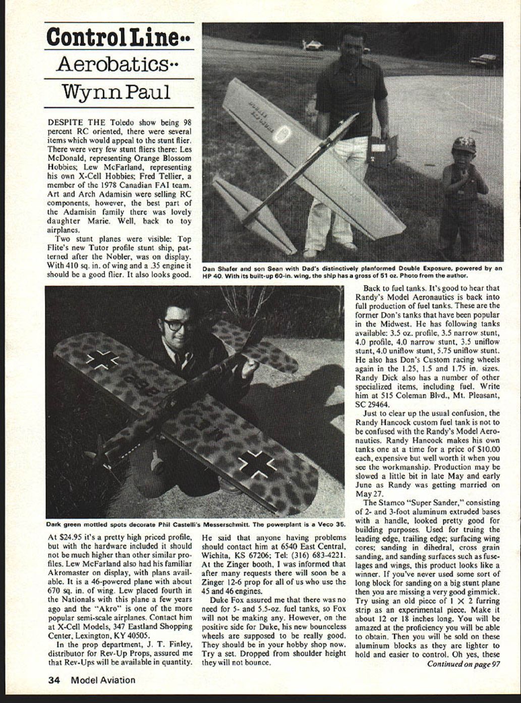 Control Line Aerobatics Wynn Paul DESPITE THE Toledo show being 98 percent RC oriented several items would appeal stunt flier very few stunt fliers Les McDonald representing Orange Blossom Hobbies Lew McFarland representing own X-Cell Hobbies Fred Tellier member 1978 Canadian FAI team Art Arch Adamisin selling RC components however best part Adamisin family lovely daughter Marie Well back toy airplanes Two stunt planes visible Top Flites new Tutor profile stunt ship pat terned after Nobler display 410 sq wing 35 engine should good flier also looks good $2495 its pretty high priced profile hardware included should much higher other similar pro files Lew McFarland also familiar Akromaster display plans avail able 46-powered plane about 670 sq wing Lew placed fourth Nationals plane few years ago Akro popular semi-scale airplanes Contact him X-Cell Models 347 Eastland Shopping Center Lexington KY 40505 prop department J T Finley distributor Rev-Up Props assured Rev-Ups will available quantity said anyone having problems should contact him 6540 East Central Wichita KS 67206 Tel 316 683-4221 Zinger booth informed after requests will soon Zinger 12-6 prop us use 45 46 engines Duke Fox assured no need 5- 55-oz fuel tanks Fox will making However positive side Duke new bounceless wheels supposed really good should hobby shop now Try set Dropped shoulder height will bounce Back fuel tanks Its good hear Randys Model Aeronautics back full production fuel tanks former Dons tanks have popular Midwest has following tanks available 35 oz profile 35 narrow stunt 40 profile 40 narrow stunt 35 uniflow stunt 40 uniflow stunt 575 uniflow stunt also has Dons Custom racing wheels again 125 15 175 sizes Randy Dick also has number other specialized items including fuel Write him 515 Coleman Blvd Mt Pleasant SC 29464 Just clear up usual confusion Randy Hancock custom fuel tank confused Randys Model Aero nautics Randy Hancock makes own tanks time price $1000 expensive well worth see workmanship Production may slowed little bit late May early June Randy getting married May27 Stamco Super Sander consisting 2- 3-foot aluminum extruded bases handle looked pretty good building purposes Used truing leading edge trailing edge surfacing wing cores sanding dihedral cross grain sanding sanding surfaces such fuse lages wings product looks like winner youve never used some sort long block sanding big stunt plane missing very good gimmick Try using old piece 1 X 2 furring strip experimental piece Make about 12 18 inches long will amazed proficiency will able obtain will sold aluminum blocks lighter hold easier control Oh yes Continued page 97 34 Model Aviation Dan Shafer son Sean Dads distinctively plantormed Double Exposure powered HP 40 its built-up 60-in wing ship has gross 51 oz Photo author Dark green mottled spots decorate Phil Castellis Messerschmitt powerplant Veco 35 ticipation seems quite poor around country thing fuel cost surely would cheaper engines should last longer Charles indicates engines performing very well bench after some extensive testing modifications hopes reach speeds high 150s wish both Charles Lieber Sam Burke best luck endeavors FAI speed Doc Jackson has thinkin thats generally dangerous about Ten Best Models Year idea similar what NFFS National Free Flight Society has So anyone has wants ideas send SASE Doc Jackson 523 Meadowbrook Circle St Davids PA 19087 information After writing good words have some would like spread around send us keep asking contest results spe cial feature articles Bob Flies Petal uma Calif came through results pictures all-speed contest February 19 weather almost perfect temperatures low 70s slight breeze Frank Hunt did usual excellent job directing con test several new records estab lished Brian Bitner Covina Calif former stunt flier turned 14248 mph FAI speed Rossi 15his very first speed model Bitners time later beaten Luke Roy Fairfield Calif new record 14432 mph Ed Bridant Bob Elies tried fly open profile proto comments Sure gonna tough beat Juniors Scott Bit ner turned 7706 Junior Profile Proto Doug Hinkley set Senior profile record 6947 mph John Newton turned Power Distribution System Model 677 completely solid-state Unit designed distrib ute power 12 VOC nicad wet-cell bat teries RC accessories addition pro viding power outlets 12-VDC starters PDS 677 provides reversible 12-VDC out put fuel pumps via miniature toggle switch Factory set 15 volts PDS 677 accommodates glow plug rating tween three volts means front panel adjustment Current glow plug automatically increased decreased dependent plug temperature An LED indicator monitors glow plug Complete mating jacks instructions made Plexi glass measures 3x6 Price $3995 & L Electronics PO Box 13434 Albuquerque NM 87112 product review product review product review ALL GRISH PROPELLERS ARE ENGINEERED TO TRUE HELICAL 5-4 7-4 8-4 9-4 9-8 11-4 12-4 5%-3 6-3 7-6 8-6 9-6 10-4 11-6 12-5 CREATE THRUST AND IE PROPELLED BY AIR AT DISCRETION OF 5y3 2 Blade Pusher5A-43045A-4 6-36-4354 6-43548-68541 7-85049-610-6$1 DE 8-8 654 3 Blade Tractor 9-75-3 6-36-4 504 -j 10-6854 3 Blade Pusher 11-8$1 tallic 12-6SiSOr1ade polyesterAluminum Cob boll color767-8 $1 F8-68-8 $125 9-6 10-6 10-4 $150 Pusher 10-6$150 16660 mph squeeze out Jim Rhodes 15937 speed Jon Defries turned 15778 mph B Fred Margarido fuel problems B turned 17251 mph D OPS 60 year chance fly some Texas weather Labor Day weekend Sep tember 2 3 Southwestern Model Plane Championship will held Hobby Park Dallas Speed events will A Profile Proto F40 B B Proto C D Jet Everything record ratio except profile proto information write Linda Wheeler 2400 Lovell Drive Mes quite TX 75150 phone 214-279-3115 next column will devoted cov erage speed events United States Controline Model Airplane Cham pionships Winston-Salem NC June 1718 Gene Hempel Tom Upton 301 N Yale Dr Garland TX 75042 CL Aerobatics/Paul continued page 34 long sanding blocks great shaping flaps elevators Need some weight nose ta