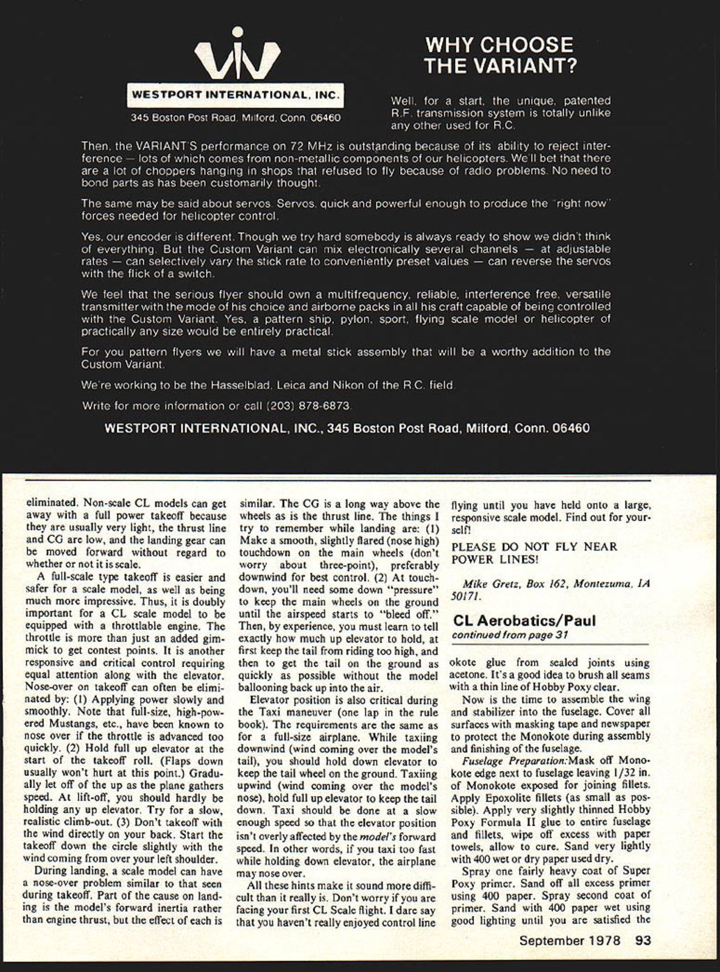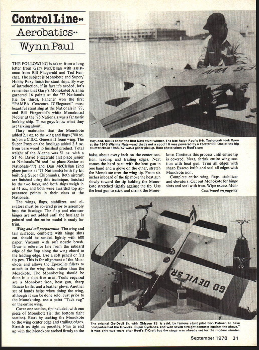 Control Line Aerobatics Wynn Paul THE FOLLOWING taken long letter Gary McClellan assist ance Bill Fitzgerald Ted Fan cher subject Monokote Super Hobby Poxy finish stunt ships way introduction fact its needed lets remember Garys Monokoted Alanna garnered 16 points 77 Nationals tie third Fancher won first PAMPA Concours DElegance beautiful stunt ship Nationals 77 Bill Fitzgeralds white Monokoted Nobler 75 Nationals fantastic looking ship guys know what talking about Gary maintains Monokote added 21 oz wing flaps 700 sq CSC Genesis II foam wing Super Poxy fuselage added 25 oz bare wood finished product Total weight Alanna 51 oz ST 46 David Fitzgerald 1st place junior Nationals-76 1st place Senior Nationals-77 Dan McClellan 2nd place junior 77 Nationals both fly kit built Sig Super Chipmunks Both aircraft finished using technique finished two boys both ships weigh 41 oz both awarded top ap pearance points class Nationals wings flaps stabilizer el evators must covered prior assembly fuselage flap elevator hinges added until fuselage painted entire model ready trim Wing tail preparation wing tail surfaces complete hinge slots cut should sanded lightly 600 paper Vacuum soft nozzle brush Draw reference line inboard edge flap along wing chord leading edge Use soft pencil felt tip pen alignment Mon okote allows Epoxolite fillets attach wing balsa rather Monokote Monokoting should done dust-free area Tools required Monokote iron heat gun sharp Exacto knife leather glove Another set hands helps doing wing although can done solo Just prior Monokoting use paint Tack rag entire wing Cover section tip included piece Monokote ie bottom right section Start tacking Monokote wing center edge trailing edges Stretch tight possible Plan end up Monokote tacked firmly balsa about inch center sec tion leading trailing edges Next comes hard part heat gun hand glove other stretch Monokote over wing tip six inches inboard tip move heat gun slowly toward tip holding Mono kote stretched tightly against tip Use heat gun stick shrink Monokote Continue process until entire tip covered Next shrink entire wing sec tion heat gun Trim edges sharp Exacto knife seal edges Monokote iron Complete entire wing flaps stabilizer elevators Cut out Monokote hinge slots seal iron Wipe excess Mon Con tinued page 93 September1978 31 Hey dad tell us about first Nats stunt winner late Ralph Roofs 6-ft Taylorcraft took Open 1946 Wichita Natsand thats spoof powered Forster 99 big stunt tricks 1 946-47 glider pickup Rare photo taken Roofs son ne originai jo-uevll br win uhisson s sala ny iamous stunt pilot Bob Palmer have outperformed Orwicks Super Cyclones won seven straight contests against above two years after Roofs TCraft stage already set modern stunter eliminated Non-scale CL models can get away full power takeoff because usually very light thrust line CG low landing gear can moved forward regard whether scale full-scale type takeoff easier safer scale model well being much impressive Thus doubly important CL scale model equipped throttlable engine throttle just added gim mick get contest points another responsive critical control requiring equal attention along elevator Nose-over takeoff can often elimi nated 1 Applying power slowly smoothly Note full-size high-pow ered Mustangs etc have known nose over throttle advanced too quickly 2 Hold full up elevator start takeoff roll Flaps down usually wont hurt point Gradu ally let off up plane gathers speed lift-off should hardly holding up elevator Try slow realistic climb-out 3 Dont takeoff wind directly back Start takeoff down circle slightly wind coming over left shoulder During landing scale model can have nose-over problem similar seen during takeoff Part cause land ing models forward inertia rather engine thrust effect similar CG long way above wheels thrust line things try remember landing 1 Make smooth slightly flared nose high touchdown main wheels dont worry about three-point preferably downwind best control 2 touch down youll need some down pressure keep main wheels ground until airspeed starts bleed off experience must learn tell exactly much up elevator hold first keep tail riding too high get tail ground quickly possible model ballooning back up air Elevator position also critical during Taxi maneuver lap rule book requirements same full-size airplane taxiing downwind wind coming over models tail should hold down elevator keep tail wheel ground Taxiing upwind wind coming over models nose hold full up elevator keep tail down Taxi should done slow enough speed elevator position isnt overly affected models forward speed other words taxi too fast holding down elevator airplane may nose over hints make sound diffi cult really Dont worry facing first CL Scale flight dare say havent really enjoyed control line flying until have held onto large responsive scale model Find out self PLEASE DO NOT FLY NEAR POWER LINES Mike Gretz Box 162 Montezuma IA 50171 CL Aerobatics/Paul continued page 31 okote glue sealed joints using acetone Its good idea brush seams thin line Hobby Poxy clear Now time assemble wing stabilizer fuselage Cover surfaces masking tape newspaper protect Monokote during assembly finishing fuselage Fuselage PreparationM ask off Mono kote edge next fuselage leaving 1/32 Monokote exposed joining fillets Apply Epoxolite fillets small p05 sible Apply very slightly thinned Hobby Poxy Formula II glue entire fuselage fillets wipe off excess paper towels allow cure Sand very lightly 400 wet dry paper used dry Spray fairly heavy coat Super Poxy primer Sand off excess primer using 400 paper Spray second coat primer Sand 400 paper wet using good lighting until satisfied September 1978 93 SCALE PILOTS SCALE WHEELS CYLINDERS ENGINE KITS INE GUN KITS PLASTIC DISPLAY MODELS SEND 5O FOR COMPLETE ILLUSTRATED CATALOG DEPT MA 181 PAWNEE STREET SAN MARCOS CA 9 primed fuselage good can get it Be careful sand through primer Clean fuselage thoroughly Prep-Sol Remask wing tail Prior spraying color