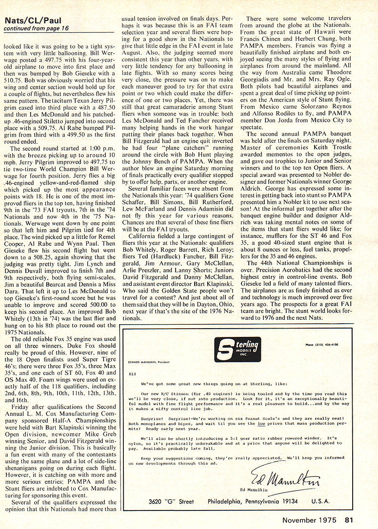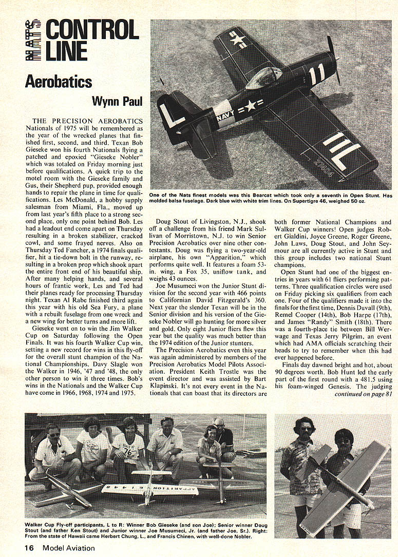 I CONTROL Aerobatics Wynn Paul THE PRECISION AEROBATICS Nationals 1975 will remembered year wrecked planes fin ished first second third Texan Bob Gieseke won fourth Nationals flying patched epoxied Gieseke Nobler totaled Friday morning just before qualifications quick trip motel room Gieseke family Gus Shepherd pup provided enough hands repair plane time quali fications Les McDonald hobby supply salesman Miami Fla moved up last years fifth place strong sec ond place point behind Bob Les leadout end come apart Thursday resulting broken stabilizer cracked cowl some frayed nerves Also Thursday Ted Fancher 1974 finals quali fier hit tie-down bolt runway re sulting broken prop shook apart entire front end beautiful ship After helping hands several hours frantic work Les Ted planes ready processing Thursday night Texan Al Rabe finished third again year old Sea Fury plane rebuilt fuselage wreck new wing better turns lift Gieseke went win Jim Walker Cup Saturday following Open Finals fourth Walker Cup win setting new record wins fly-off overall stunt champion Na tional Championships Davy Slagle won Walker 1946 47 48 other person win three times Bobs wins Nationals Walker Cup have come 19661968 1974 1975 Doug Stout Livingston NJ shook off challenge friend Mark Sul livan Morristown NJ win Senior Precision Aerobatics over nine other con testants Doug flying two-year-old airplane own Apparition performs quite well features foam 53in wing Fox 35 uniflow tank weighs 43 ounces Joe Musumeci won Junior Stunt di vision second year 466 points Californian David Fitzgeralds 360 Next year slender Texan will Senior division version Gie seke Nobler will go hunting silver gold Only eight Junior fliers flew year quality much better 1974 edition Junior stunters Precision Aerobatics year again administered members Precision Aerobatics Model Pilots Associ ation President Keith Trostle event director assisted Bart Klapinski Its event Na tionals can boast its directors both former National Champions Walker Cup winners Open judges Rob ert Gialdini Joyce Greene Roger Greene John Laws Doug Stout John Sey mour currently active Stunt group includes two national Stunt champions Open Stunt biggest en tries years 61 fliers performing pat terns Three qualification circles used Friday picking six qualifiers Four qualifiers made finals first time Dennis Duvall 9th Remel Cooper 14th Bob Harpe 17th James Randy Smith 18th fourth-place tie between Bill Wer wage Texas Jerry Pilgrim event AMA officials scratching heads try remember ever happened before Finals day dawned bright hot about 90 degrees worth Bob Hunt led early part first round 4815 using foam-winged Genesis judging continued page 81 16 Model Aviation Nets finest models Bearcat took seventh Open Stunt Has molded balsa fuselage Dark blue white trim lines Supertigre 46 weighed 60 oz Walker Cup Fly-off participants R Winner Bob Gieseke son Joel Senior winner Doug Stout father Ken Stout Junior winner Joe Musumeci Jr land father Joe Sr Right state Hawaii came Herbert Chung 1. Francis Chinen well-done Nobler Nats/CL/PauI continued page 16 looked like going tight sys tem very little ballooning Bill Wer wage posted 49775 four-yearold airplane move first place humped Bob Gieseke 51075 Bob obviously worried wing center section would hold up couple flights nevertheless flew same pattern taciturn Texan Jerry Pil grim eased third place 48750 Les McDonald patchedup 46-engined Stiletto jumped second place 50975 Al Rabe bumped Pil grim third 49950 first round ended second round started 100 pm breeze picking up around 10 mph Jerry Pilgrim improved 49775 tie two-time World Champion Bill Wer wage fourth position Jerry flies big 46-engined yellow-and-red-flamed ship picked up appearance points 18 im proved fliers top ten having finished 9th 73 FAI tryouts 7th 74 Nationals now 4th 75 Na tionals Werwage went down point left him Pilgrim tied 4th place wind picked up little Remel Cooper Al Rabe Wynn Paul Gieseke flew second flight went down 50825 again showing judging pretty tight Jim Lynch Dennis Duvall improved finish 7th 9th respectively both flying semi-scales Jim beautiful Bearcat Dennis Miss Dara left up Les McDonald top Giesekes first-round score unable improve scored 50000 keep second place An improved Bob Whitely 13th 74 last flier hung 8th place round out 1975 Nationals old reliable Fox 35 engine used three winners Duke Fox should really proud However nine 18 Open finalists used Super Tigre 46s three Fox 35s three Max 35s ST 60 Fox 40 OS Max 40 Foam wings used ex actly half 118 qualifiers including 2nd 6th 8th 9th 10th 11th 12th 13th 16th Friday after qualifications Second Annual L M Cox Manufacturing Com pany sponsored Half-A Championships held Bart Klapinski winning Open division newcomer Mike Greb winning Senior David Fitzgerald win ning Junior division basically fun event contestants using same plane lot side-line shenanigans going during flight However catching more serious entries PAMPA Stunt fliers indebted Cox Manufac turing sponsoring event Several qualifiers expressed opinion Nationals usual tension involved finals days Per haps because FAI team selection year several fliers hop ing good show Nationals give little edge FAI event late August Also judging seemed consistent year other years very little tendency ballooning late flights scores being very close pressure make maneuver good try extra point two could make differ ence two places Yet still great camaraderie among Stunt fliers someone trouble both Les McDonald Ted Fancher received helping hands work hangar putting planes back together Bill Fitzgerald engine quit inverted four plane catchers running around circle Bob Hunt playing Johnny Bench PAMPA author blew engine Saturday morning finals practically qualifier stopped offer help parts another engine Several familiar faces absent Nationals year 74 qualifiers Gene Schaffer Bill Simons Bill Rutherford Lew McFarland Dennis Adamisin did fly year various reasons Chances several
