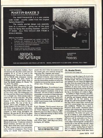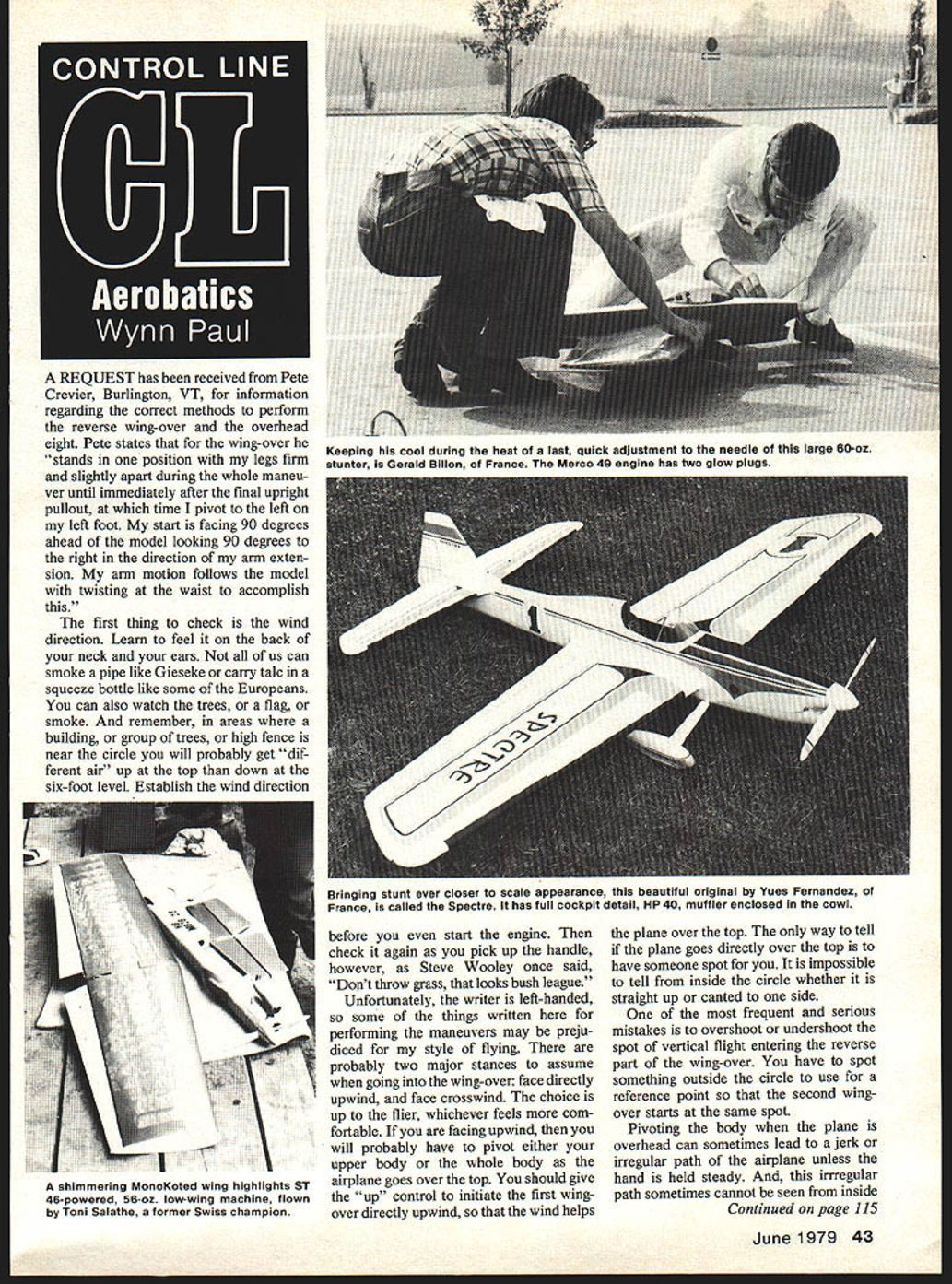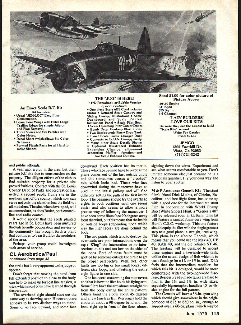 A REQUEST has received Pete Crevier Burlington VT information regarding correct methods perform reverse wing-over overhead eight Pete states wing-over stands position legs firm slightly apart during whole maneu ver until immediately after final upright pullout time pivot left left foot start facing 90 degrees ahead model looking 90 degrees right direction arm exten sion arm motion follows model twisting waist accomplish first thing check wind direction Learn feel back neck ears us can smoke pipe like Gieseke carry talc squeeze bottle like some Europeans can also watch trees flag smoke remember areas building group trees high fence near circle will probably get dif ferent air up top down six-foot level Establish wind direction before start engine check again pick up handle however Steve Wooley once said Dont throw grass looks bush league Unfortunately writer left-handed some things written performing maneuvers may preju diced style flying probably two major stances assume going wing-over face directly upwind face crosswind choice up flier whichever feels com fortable facing upwind will probably have pivot either upper body whole body airplane goes over top should give up control initiate first wingover directly upwind wind helps plane over top way tell plane goes directly over top have someone spot impossible tell inside circle whether straight up canted side frequent serious mistakes overshoot undershoot spot vertical flight entering reverse part wing-over have spot something outside circle use reference point second wingover starts same spot Pivoting body plane overhead can sometimes lead jerk irregular path airplane unless hand held steady irrregular path sometimes cannot seen inside Continued page 115 June 1979 43 Keeping cool during heat last quick adjustment needle large 60-oz stunter Gerald Billon France Merco 49 engine has two glow plugs Bringing stunt ever closer scale appearance beautiful original Yues Fernandez France called Spectre has full cockpit detail HP 40 muffler enclosed cowl shimmering MonoKoted wing highlights ST 46-powered 56oz low-wing machine flown Toni Salathe former Swiss champion THE JUG IS HERE P-47D Razorback Bubble Version Special Features piece Scale ABS Cowl includes Motor iled Scale Canopy Sliding Canopy Illustrations e Dashboard Scale Printed Instrument Panel e Pilot Seat Scale Operating Inter Cooler Doors Bomb Drop Hook-up Illustrations Two Bombs w/ply 0 Drop Tank Exact Scale Turbo Charger Duct Converts Bubble Canopy easily other Scale Details Shown Optional Illustrated Exhaust Expansion Chamber allowsoil separationMuffler functionand two Scale Exhaust Outlets JEMCO 1305 Foothill Dr Vista Ca 92083 714724-3242 public officials year ago club area lost private RC site due construction property diligent efforts club find suitable property private site proved fruitless Contact St Louis County Dept Parks Recreation has netted second public flying site northern part county now can serve club lost field modelers site developed will accommodate does Ruder both controlline radio control would appear seeds planted years ago St Louis have nurtured through friendly cooperation service community has brought forth plant continues bear fruit modelers area Perhaps group could investigate such areas service CL Aerobatics/Paul continued page 43 circle very apparent judge spotter Dont forget moving hand full extended position close body can help make up lost line tension trick us have learned through desperation overhead eight should start out same way wing-over However appears two distinct ways stand Some us face upwind some face downwind position has its merits face upwind have pivot plane comes out last outside circle sometimes causes crooked exit looks bad face downwind during maneuver have pivot initial pull-up will find difficulty setting path first inside loop beginner should try overhead eights both positions until seems easier also seems allow precise way following maneuver have seen some fliers face 90 degrees away wind means inside outside loops depending upon way flier faces done behind body two points tend destroy overheads poor intersections over top Sing intersection no inter sections too low sides loops Both faults must spotted someone outside circle get proper perspective Well yes other faults too big too small loops dif ferent size loops offsetting entire eight-figure side last word concerning maneuvers flier holds flying arm Some fliers have arm almost straight out body during entire pattern Others bend elbow about 45 degrees few such Bill Werwage hold elbow about 90-degree bend hand right up front face almost sighting down wires Experiment see what seems comfortable Dont imitate someone else just because Nationals qualifier Fly own way listen spotter M & P Announce Genesis Kit stunt fliers friend Dick Mathis Chizler Ex calibur free-flight fame has come up good intermediate stunt flier cooperation World Champ Bob White Shoes Hunt Genesis 40 will released soon kit form kit will feature sanded foam-core wing Hunts CSC workshop feature should equip flier single greatest step good plane straight true wing plane 40-size Genesis means could use Max 40 HP 40 K&B 40 old reliable ST 46 fuselage will designed accept engines two-inch-wide tank unlike actual design Bob use fuselage 1 1 7/ tank Dick feels intermediate modeler kit designed would comfortable two-inch-wide fuse lage Besides ready-made tanks hard find 1/4 1 7/ wide sizes especially big enough handle 40- 46size engine full pattern Genesis will have 56-in span wing should give somewhere neigh borhood 625 650 sq enough support 60-oz plane may June1979 115 Send $100 color picture Picture Above 40-60 Engine An Exact Scale R/C Kit54 Span 525 Sq Kit Includes4-6 Channel Usual JEM-LOC Easy Fuse ConstructionLAZY BUILDERS Foam Core Wings Extra LargeLOVE OUR KITS Trailing Edges simple AileronBecause easiest build Flap RemovalScale Kits around Three Views Six Profiles withWrite Catalog Color Notes Price $9495 Decal Sh