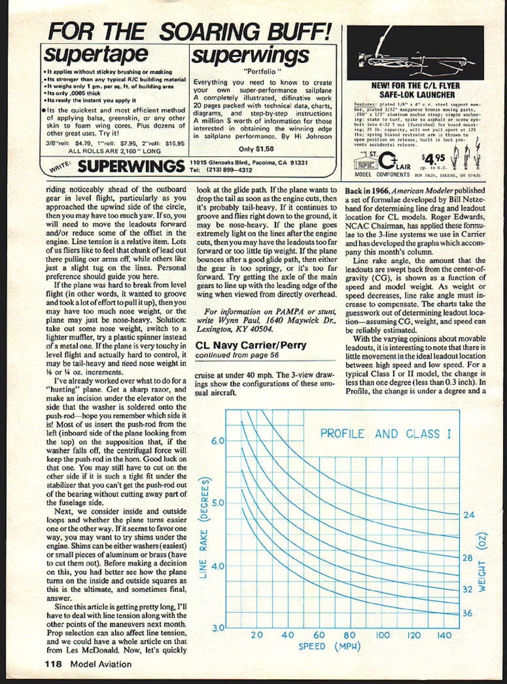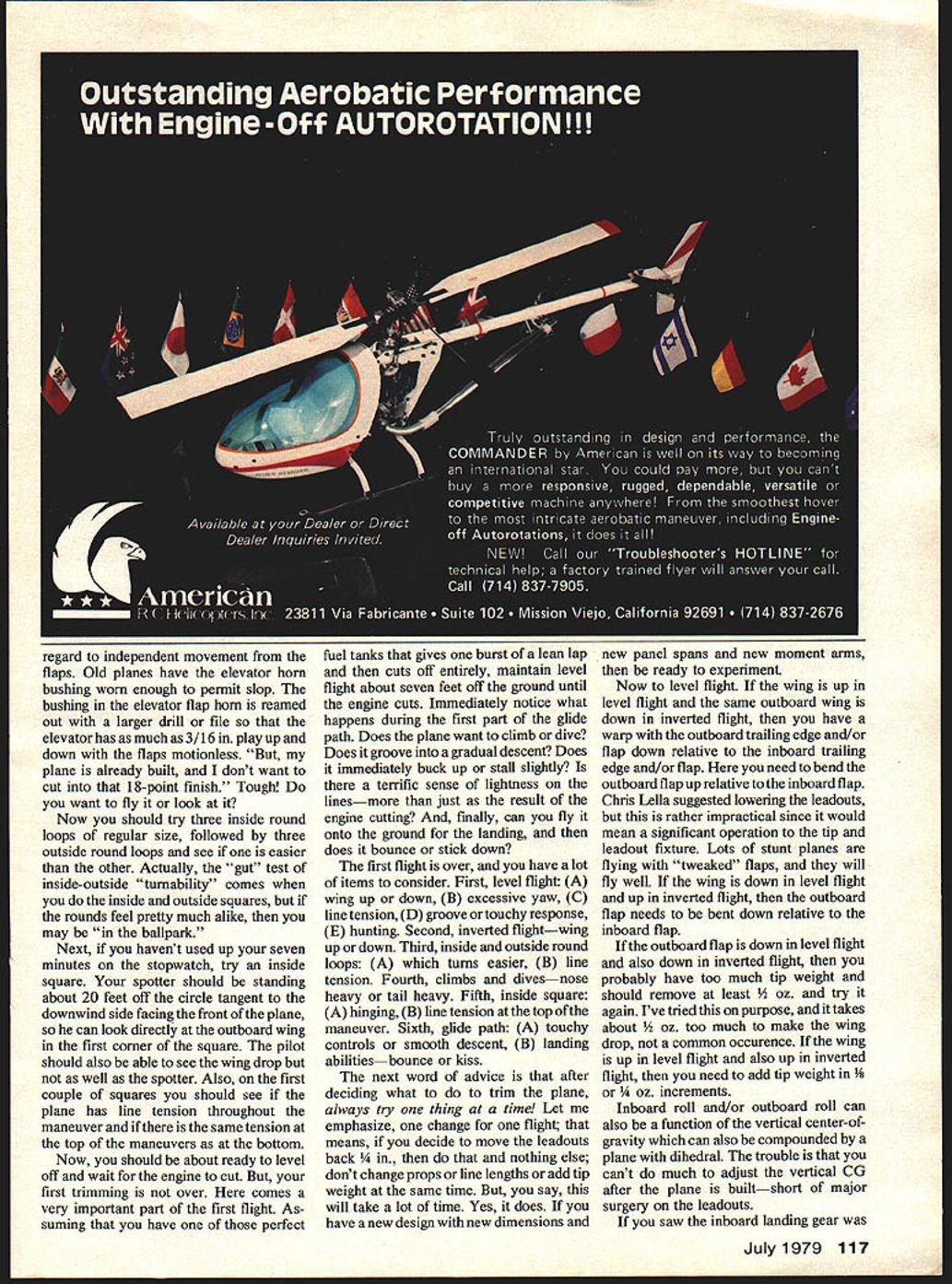 see well plane stays out lines needs tail weight increase sensitivity during maneuvers see plane needs Use stopwatch start soon nose weight increase stability Continued page 116 LETS trim new stunt airplane Sup pose get rid usual gobbledygook explanations stick what seems work First thing should check out few things groundbefore consider flying plane sitting table head about foot nose sight over top wing switching eyes trailing edge tip side trailing edge other tip Make certain both trailing edges tips appear same time raise lower head some practice can spot warp much trouble Also time certain stabilizer exactly square wing rudder 1/16 off fix Make certain elevator exact neutral position flaps neutral Roll airplane across paved area should roll straight bend landing gear until does would very embarrassing first takeoff plane comes Next should statically balance plane theoretical center gravity usually about 2 2 leading edge wing root center wing Less same propor tion smaller-than-standard aircrafta Half-A instance personally dont feel establishing tip weight holding plane along center line fuselage watching plane tilt outboard wing very good usually start out too much rather too little tip weightarrived knowing what other planes have used just guess timating Now lets see can get crate air Instruct spotter helper what look first flight 1 level flight wings parallel ground 2 inverted flight wing level 3 inside square loop see about hinging drop ping outboard wing first second corners loop Also will looking comparison between inside outside round loops see plane turns better way other Halt-Breed II byJohn poynter has J i toam wings naps sxaoiiizer ana ejevator Engine ST 46 weight 56 oz Finished Aero Gloss color clear Acrylic enamel LVrI up iu i rlartvigsens Classic Fox 35 Fox muffler 56-in span 568 sq area weight 47 oz Airfoil NACA 0020 Finished Aero Gloss paint Wynn Paul plc Mexican FAI team member Ernesto Cuevas fliesthis Genesis Weighing60 ounces powered Supertigre 46 engine running off uniflow tank rakish looking design July 1979 55 0 LOWEST DRAIN WHY PAY big buy high performance *FIREBALL #H30 HOT 3 volts faster starts #S20 STANDARD 24 volts general use #C15 COOL 15 volts cures pre-ignition Just fun stick FIRE BALL great engine runs *advanced98 ............ FLASH STARTING 0 UNEXCELLED POWER LONGER LIFE cr11 1 GLOW PLUGS SWANSON ASSOCIATES P0 BOX 151WAYNE NEW JE35EY 07470 Brashers Rotation Station Are exotic planes worth effort next season two will determine way Combat design will go CL Scale/Gretz continued page 54 small point personal preference fact believe person could become just proficient either mode operation learn either just easily got some own specific reasons prefer ring fly Scale high throttle forward handle said part set up first 3-line system years ago became obvious mounted inverted bellcrank inverted seemingly intended almost engine high throttle position would forward control handles throttle lever same holds true mounting upright bellcrank upright throttle-equipped engines know require throttle pushrod move forward open car buretor except Fox engines often have lever both directions other words modeler uses stock equip ment mounts manufacturer intended mounted would almost cases get high throttle moving handles lever forward way noticed Scale fliers doing Nationals order make system work other way must reverse directions somewhere along line As said can incorporate straight reversing bellcrank arm between engine 3-line bellcrank can mount inverted style bellcrank upright upright style bellcrank inverted although know some control rod hookup problems can also simply loosen throttle arm engines rotate 180 degrees top side carb couldnt see possible advantage Scale flying doing things mentioned seemed natural pull back handles trigger get fast throttle seems natural fast throttle forward fullsize airplane automobile use left hand operate lever top handle thus always fly both hands Perhaps real heart personal preferences matter Im wondering other Carrier fliers normally fly hand using index finger operate trigger feel way can operate throttle precisely through stages scale flight competition Scale flying good share point-getting maneuvers done very near low throttlelike initial takeoff run landing touch-and-go taxi During maneuvers precise coordinated elevator throttle use important prefer trigger back what seem agree comfort able position day after mailed reply letter arrived MA sown Carrier expert respected friend Dick Perry very knowledgeably shed some light Carrier fliers prefer control set-up opposite what normal Scale Dick said looks like disagree little way appropriate direction open throttle 3-line system Its certainly no big thing Carrier requirements just little different Scale way forward openis way real air plane builders it works great two-handed flyingthe way Scale fliers Ive seen Carrier fliers little different generally one-handed few excep tions can fly bigger circle low speed hand use two hands high speed left hand support onlythe right index finger still handles throttle 5075 lbs pull pull-to-open throttle much easier keep open push-to-open rig one-hand operation low-speed throttle action also natural back pressure opens throttle up applied Also properly rigged up elevator condition against stop lines really loose will automatically open throttle bad situation total airplane pull about two pounds So have full story Two different methods two unique events As can see could go on meaningless debate about merits method lets just conclude devoted pilot can get satisfactory results either way know years RC has its Mode throttle right stick Mode II throttle left stick fliers tongue-in-cheek word-war about best Perhaps should divide up two-fisted lever pilots handed trigger pilots Are crazy Mike Gretz Box 162 Montezuma IA 50171 CL Aerobatics/Paul continued page 55 engine catches After plane air fly eye level approximately five feet off ground Have spotter better