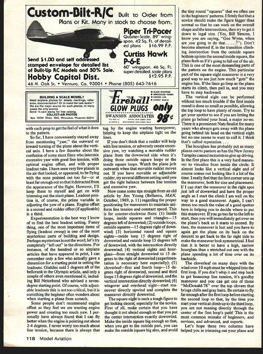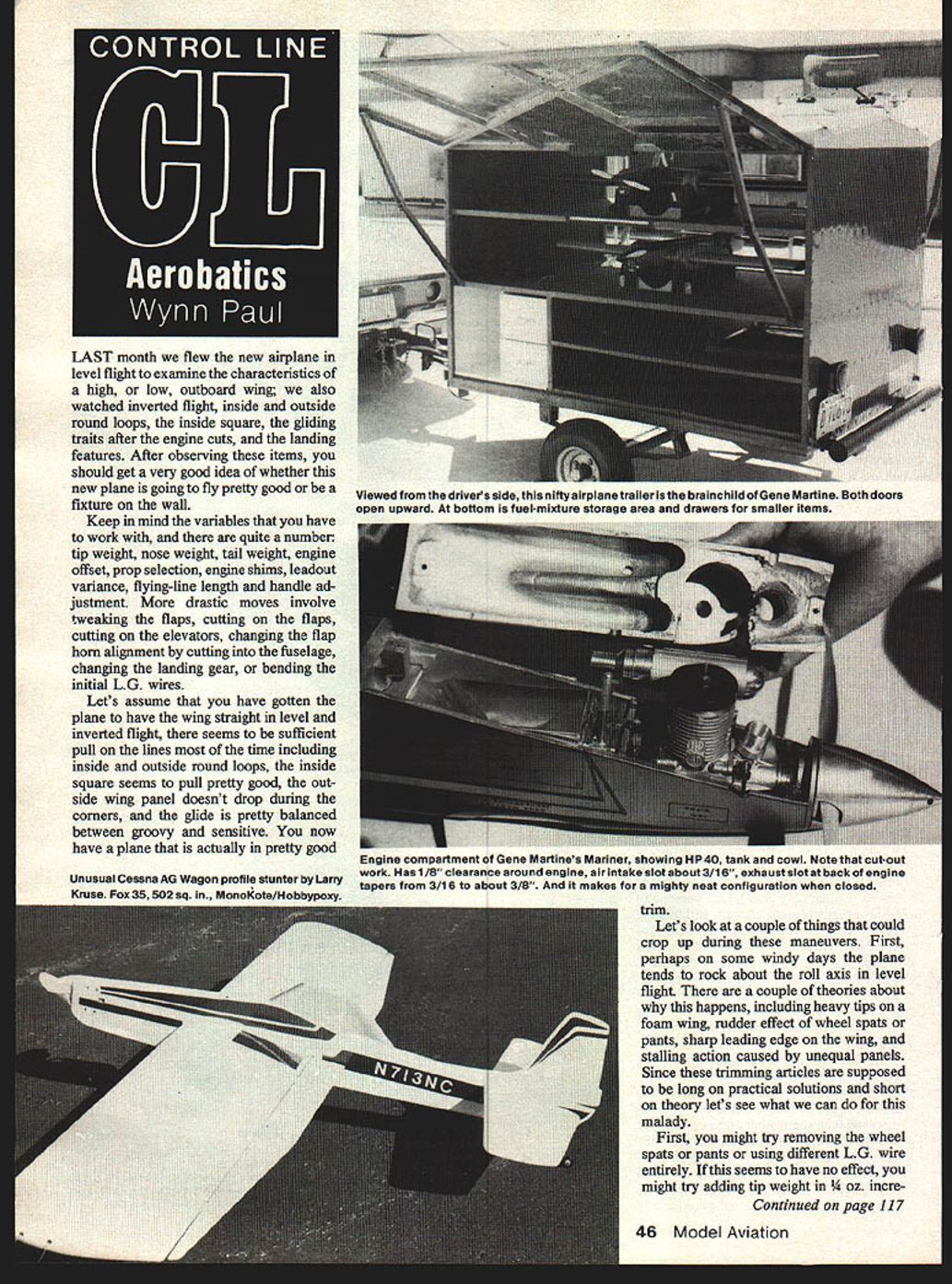 LAST month flew new airplane level flight examine characteristics high low outboard wing also watched inverted flight inside outside round loops inside square gliding traits after engine cuts landing features After observing items should get very good idea whether new plane going fly pretty good fixture wall Keep mind variables have work quite number tip weight nose weight tail weight engine offset prop selection engine shims leadout variance flying-line length handle ad justment drastic moves involve tweaking flaps cutting flaps cutting elevators changing flap horn alignment cutting fuselage changing landing gear bending initial LG wires Lets assume have gotten plane have wing straight level inverted flight seems sufficient pull lines time including inside outside round loops inside square seems pull pretty good out side wing panel doesnt drop during corners glide pretty balanced between groovy sensitive now have plane actually pretty good Unusual Cessna AG Wagon profile stunter Larry Kruse Fox 35502 in. MonoKote/Hobbvnoxv trim Lets look couple things could crop up during maneuvers First perhaps some windy days plane tends rock about roll axis level flight couple theories about happens including heavy tips foam wing rudder effect wheel spats pants sharp leading edge wing stalling action caused unequal panels Since trimming articles supposed long practical solutions short theory lets see what can malady First might try removing wheel spats pants using different LG wire entirely seems have no effect might try adding tip weight ncre Continued page 117 Viewed thedrivers side nifty airplane trailer isthe brainchild Gene Martin. Both doors open upward bottom fuel-mixture storage area drawers smaller items Engine compartment Gene Martines Mariner showing 11 P40 tank cowl Note cut-out work Has 1/8 clearance around engine air intake slot about 3/16 exhaust slot back engine tapers 3/16 about 3/8 makes mighty neat configuration closed rely will static judges close eyeballing three-view drawing photos discrepancy between drawing photos actual subject aircraft means go photos note discrepancy scale presentation judges will realize youve followed accurate information realize Im drifting slightly subject making wing walks good time state basic unwritten rules scale documentation anytime have photo drawing same part same aircraft differ substantially photo best authority use Sounds simple enough its surprising rookies fail see initially pay price first contests Photos thousand times reliable drawings scale modelers dream come true three-view photos com plement back-up other About wing walks Its best use vinyl plastic tape mask off wing-walk area paper tape used clear sealer coat required keep black paint creeping under tape average size job take about 2 ounces black paint stir 1 ounce sanding grit volume measurements weight well mixed immediately start laying mixture place brush Dont overbrushjust smooth out well possible Its important stir mixture constantly between brush load grit heavy will settle bottom quickly mixture seems too thick handle add little thinner make go smoother youre doing first time test first batch piece cardboard instead model Experi ment brushing technique mixture until goes smoothly lumps coat coverage almost always sufficient take tape off immediately after youre done brushing its dry Good thoughts summer months Al Arnold New Orleans writes am president Louisiana Scale Sqn composed about 90% RC Scale enthu siasts have CLer position somewhat unusual guess what really proves dont care scale discipline modeler likes just like scale As result type cama raderie CL Scale guys have gotten lot support enthusiasm RC brothers vice-versa contests something behold have events types scale models would nice see modelers other areas demonstrate kind mutual respect good fellow ship think CL Scale terrific encourage younger modelers area Like said before make up quality what lack numbers hoping will cause increase other PLEASE DONT FLY NEAR POWER LINES Mike Gretz Box 162 Montezuma IA 50171 CL Aerobatics/Paul continued page 46 ments until wing starts dip badly inside squares may solve rolling level flight course rolling doesnt really hurt anything just looks bad after takeoff during interim between maneuvers plane seems go loose lines tops inside outside round loops also tops inside outside squares first thing try tip weight might also try moving leadouts forward increase line tension same time different flightremember may have decrease amount tip weight Let say right firmly believe adjusting tip weight nose weight primary trimming items Some people really like try prop changes some like try leadout engine offset changes some like spend lot time flapsbending cutting trimming trail ing edges etc flier will have try keep open mind get rut trying same thing over over trim out recalcitrant airplane Dont afraid cut plane else fails Better have good flying airplane some minor repairs showing 18-pointer cant fly everyones difficult ma neuvers triangle first corner isnt bad getting top angle just right difficult course deadmans corner always thrill top angle too big third corner less 60 degrees will very often tend stall out plane overweight has low tail volume coefficient relative wing area will need spotter watch keep informed size top angle triangle Better have too small too large help make third corner good eliminate stalling sinking might try adding nose weight and/or changing prop going less blade area helps turning prop diameter Obviously get big bobble third corner cant chalked up nerves inexperience try nose weight means Another way smooth out turning try smaller line spacing handle popular E-Z-Just about 4 Martine Custom Master adjustable handle can get closer line separation acts like adding nose weight slowing down turning Dont forget changing props can make some big differences blade area will help line tension slow down engine Larger diameter will give line tension Larger blade area will 