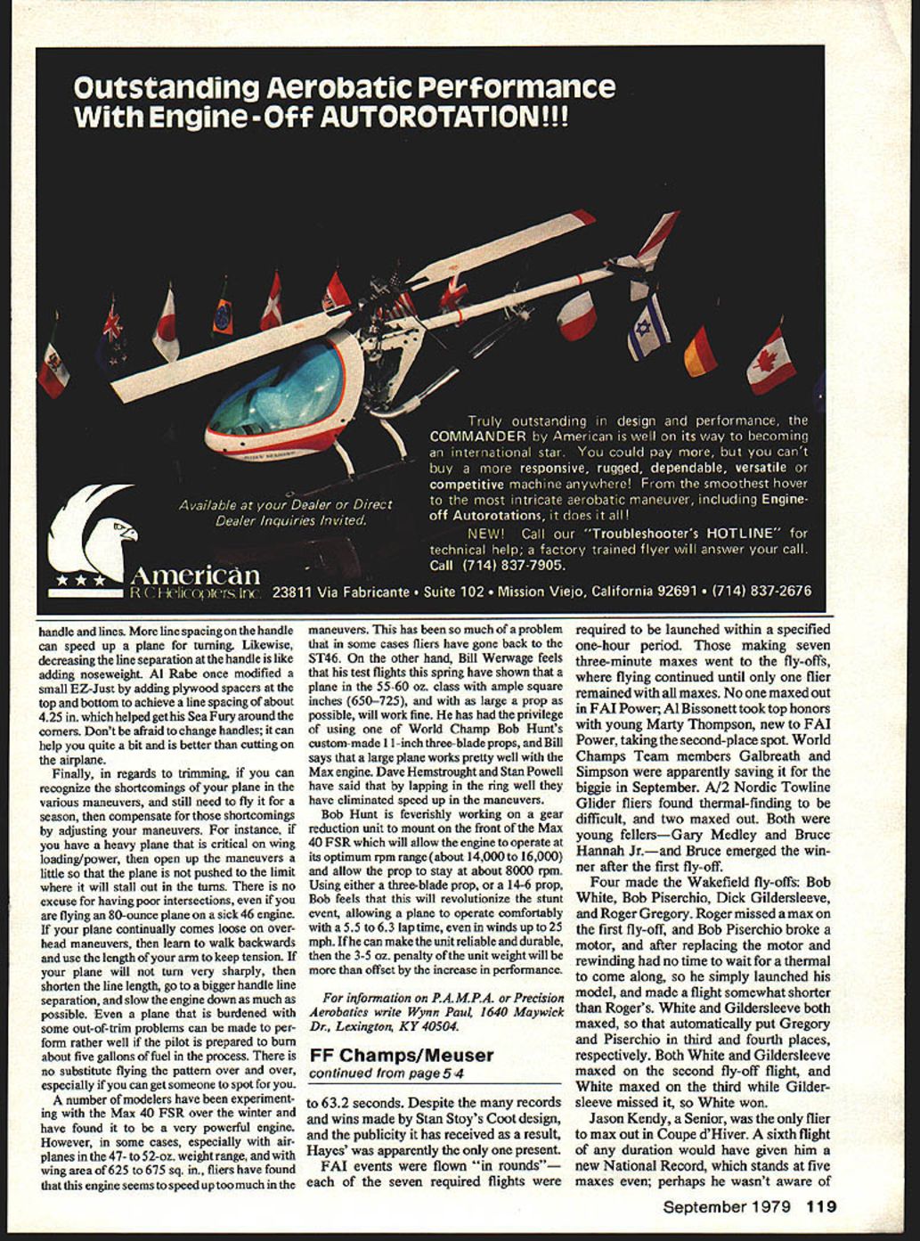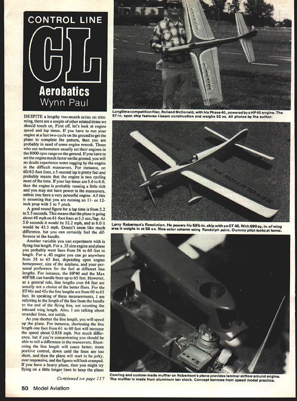 DESPITE lengthy two-month series trim ming couple other related items should touch First off lets look engine speed lap times have run engine fast two-cycle ground get plane complete pattern probably need some engine rework use tachometers usually set engines 8000-rpm range ground have set engine much faster ground will no doubt experience some sagging engine difficult maneuvers instance 60/62-foot lines 5-second lap pretty fast probably means engine two cycling time lap times 56 60 engine probably running little rich may have power maneuvers unless have very powerful engine assuming running 11- 12inch prop 5 7 pitch good round figure lap time 52 55 seconds means plane going about 48mph 61-foot lines 55 sec/lap 50 seconds would 522 mph 60 would 435 mph Doesnt seem like much difference can certainly feel dif ference handle Another variable can experiment flying-line length 35 size engine plane probably want lines 56 60 feet length 40 engine can go anywhere 58 65 feet depending upon engine horsepower size airplane per sonal preference feel different line lengths instance HP4O Max 4OFSR can handle lines up 65 feet However general rule line lengths over 64 feet usually choice better fliers ST46s 45s line lengths 60 65 feet speaking measurements am referring length line handle end flying line counting inboard wing length Also am talking about stranded lines solids As shorten line length will speed up plane instance shortening line length foot 61 60 feet will increase speed about 0838 mph much differ ence youre concentrating should able tell difference maneuvers Short ening line length will cause better positive control down until lines too short plane will start jerky over responsive figures will look cramped have heavy plane might try flying little longer lines keep plane L0flg B competition flier Rolianu InU59Qu powersnglne 57-in span ship features i-beam c,druction nu weighs 52 02 photos hv tha nuthor 50 Model Aviation Larry Robertsons Revolution powers SB%inshipwithanST4ewithegosqinofwing area weighs 56 02 Nice color scheme using Randolph paint Dummy pilot iooksat home Cr10 1u510m-maae muwier bertsons plane provides .. . aruong Continued page 11 7 muffler made aluminum bar stock Concept borrows speed model practice Mike Gretz Box 162 Montezuma IA 50171 CL Navy Carrier/Perry continued page 49 clarification arrested landing definitions scale bonus points Profile CLCB will voting rules about month Sep tember 1 care about event owe yourself let CLCB representative know feelings Carrier issues up voting definitely favor scale-like Profile models case havent already reached conclusion reading previous columns Ive tried give equal time worthy non-scale models welL such model Bill Reynolds Tuborg H pictured month Bill top Profile fliers Daytons Buzzin Buzzards club Tuborg II uses flaps ailerons its 310sq-in wing has fixed leadouts stab although smaller Profile models has long moment arm quite adequate well-balanced model Rectangular wing planform minimum fuselages models like Tuborg II allow simplified light weight construction potential improved performance over heavier scale-like Profiles Bill uses ne Supertigre ST 35 engine has standard Profile Carrier quite previous discussions converting exist ing sport CL kits scale-like Profile models Ive never mentioned details establish proper outlines fuselage tail wing tips must often modified after kit selected provide proper wing shape match prototype Although accuratelyscaled outlines great require some effort develop sometimes dont look exactly right because flat fuselages Profile models Roger Edwards suggestion sketch outlines regard accuracy dimensions make adjustments neces sary until drawing looks right method artistic technicalis easy yet still provides realism desired model month have yet another obscure carrier prototype Handley Page model HP-21 US Navy HPS-l delivered 1923 proto type shipboard fighter Its advanced design consisted plywood wings fuselage much attention streamlining clean mono plane unusual era externally-braced fabric-covered biplanes could reach 145 mph 230 hp Its significant feature wing carried full-span flaps leading edge slats allowed landing speed 44 mph spite its design features Navy cancelled its order HPS- 1 after receiving first aircraft no others built Richard L Perry 5016 Angelita Ave Day ton OH 45424 reed about Model Aviation writing advertisers mention banging around corners allowing time recover speed between corners intersections within maneuver should help smooth out overall flight plane Lengthening lines will slow plane down will give room maneuvers should help smooth out flight plane starting out trim plane itis good idea make up three sets lines instance 35 size airplane try 58- 595- 605-foot lines Remember turns out shorter length best can cut longer ones size wing has pronounced warp wish remove best method Ive seen wrap wing cloth towels hot possible damp Keeping sharp lookout paint starts get loose starts lift block wing warp over-compensated about 14 let dry take towels off before blocking up should spring place after thorough ly drying come out about right Dont expect first soaking work perfectly may have repeat process after observing plane level flight wing high low flap tweaking doesnt work flaps wont bend danger breaking flap horn need put small tab wing flap made balsa tin can stock aluminum may want slit trailing edge wing flap insert tab soit looks pretty much built Remember can wonders performance airplane changing September1979 117 hardens neat possible tiymg get CL Aerobatics/Paul epoxy over ouside tubing continued page 50 airplane Some glue bound ooze out tubing permanently putinplace can easily wiped completely off clean rag soaked alcohoL squeeze bottle methyl alcoholas used giow fuelis always workbench comes handily situations like Rubbing alcohol will work just well Keep cards letters coming nanole anu iines iviore une spacing handle can speed up plane turning Likewise decreasing line