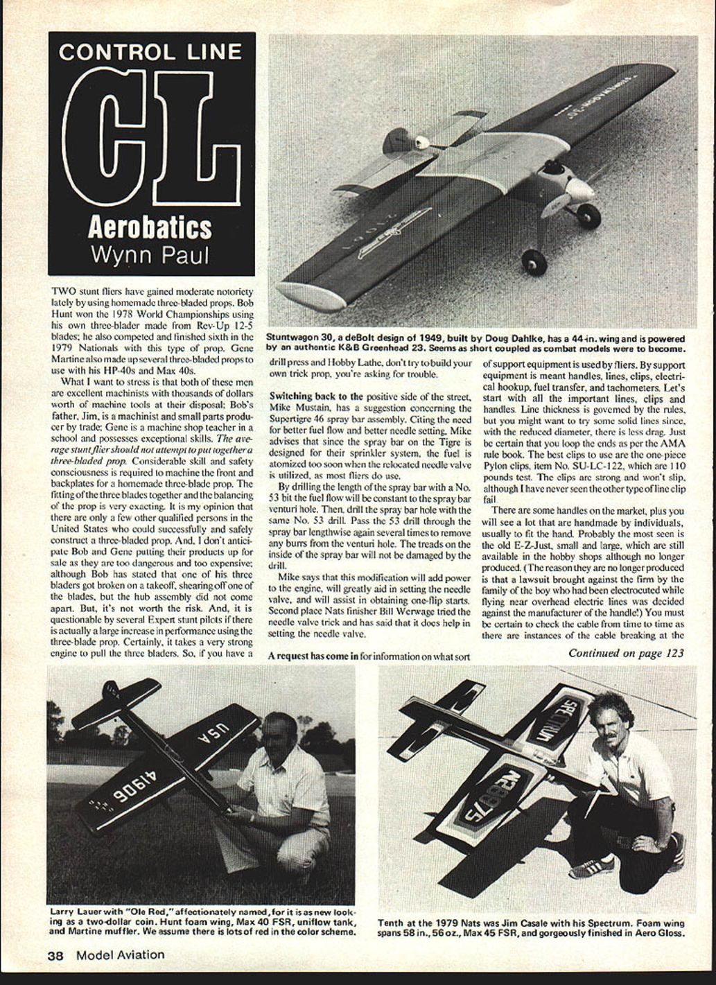 TWO Stunt fliers have gained moderate notoriety lately using homemade three-hiaded props Bob Hunt won 1978 World Championships using own three-blader made Rev-Up 12-5 blades also competed finished sixth 1979 Nationals type prop Gene Martine also made up several three-bladed props use HP-40s Max 40s What want stress both men excellent machinists thousands dollars worth machine tools disposal Bobs father Jim machinist small parts produ cer trade Gene machine shop teacher school possesses exceptional skills arerage stuotfi jer should attempt put together three-bladed prop Considerable skill safety consciousness required machine front backplates homemade three-blade prop fitting three blades together balancing prop very exacting opinion few other qualified persons United States could successfully safely construct three-bladed prop dont antici pate Bob Gene putting products up sale too dangerous too expensive although Bob has stated three bladers got broken takeoff shearing off blades hub assembly did come apart its worth risk questionable several Expert stunt pilots actually large increase performance using three-blade prop Certainly takes very strong engine pull three bladers So have drill press Hobby Lathe dont try build own trick prop youre asking trouble Switching back positive side street Mike Mustain has suggestion concerning Supertigre 46 spray bar assembly Citing need better fuel flow better needle setting Mike advises since spray bar Tigre designed sprinkler system fuel atomized too soon relocated needle valve utilized fliers use drilling length spray bar No 53 bit fuel flow will constant spray bar venturi hole drill spray bar hole same No 53 drill Pass 53 drill through spray bar lengthwise again several times remove burrs venturi hole treads inside spray bar will damaged drill Mike says modification will add power engine will greatly aid setting needle valve will assist obtaining one-flip starts Second place Nats finisher Bill Werwage tried needle valve trick has said does help setting needle valve reauest has come infomition wbit nrt support equipment used fliers support equipment meant handles lines clips electri cal hookup fuel transfer tachometers Lets start important lines clips handles Line thickness govemed rules might want try some solid lines since reduced diameter less drag Just certain 1oop ends per AMA rule book best clips use one- piece Pylon clips item No SU-LC-122 110 pounds test clips strong wont slip although have never seen other type line clip fail some handles market plus will see lot handmade individuals usually fit hand Probably seen old E-Z-Just small large still available hobby shops although no longer produced reason no longer produced lawsuit brought against firm family boy electrocuted flying near overhead electric lines decided against manufacturer handle must certain check cable time time instances cable breaking 38 Model Aviation Stuntwagon 30 deBolt design 1949 built Doug Dahlke has 44-in wing powered authentic K&B Greenhead 23 Seems short coupled combat models become Continued page 123 Larry Lauer Ole Red affectionately named ii ing two-dollar coin Hunt foam wing Max 40 FSR uniflow tank Martine muffler assume lots red color scheme Tenth 1979 Nats Jim Casale Spectrum Foam wing spans 58 in56oz Max45 FSRandgorgeouslyfinished AeroGloss throttle response around idle Future columns will describe fuel meters on-off pressure systems use exhaust slide want wait fuel meter like shown photo available Harry Higley 433 Arquilla Dr Glenwood IL 60425 Richard L Perry 5016 Angelita Ave Day ton OH 45424 CL Aerobatics/Paul continued page 38 outlet plastic handle Richard Byron has cables tested local college said broke around 100 pounds pull very good still some Control Specialties In-flite adjustable handles available although Bob Hunt now working Flying Models high density foam handle has wide spacing very good cable George Aldrich handle designed George after used years good light weight handle cable very strong Georges handles several colors plastic part handle Fox makes steel handle large wooden grip handle has two line spacing positions wooden grip real handful can sanded carved conform hand Bob Baron designed handle has magazines two occasions MAN August 1970 ModelAviation April 1977 adjustable handle basis marketed Gene Martine Custom Master Products Jacksonville Fla handle favorite USA team member Gene Schaffer well several other Eastern fliers Sullivan Products also has plastic handle nine adjustments may fit -- hand want build own handle certain pull-test well before using electrical equipment get everything plain old 1 volt battery two alligator clips using Du-Bro Kwik Gb go-plug connector No DU-KG-147 using awet cell Wet cells usually 2 volts need recharging will blow out weak plug whats sense having weak plug anyway Getting very popular now Fusite GloBee Fireplug Charger costs about $3995 retail has ammeter built rechargeable will show plug flooded bumt out seems last long time between charges number fliers build unit flight box has ammeter can test plug usually have two 1-volt cells wet cell built types units Tatone makes nifty hand-on con nector eliminates wires called Pocket Booster Prather makes starting battery com bination called has NiCad battery plug tester battery tester together about $2995 other units available should check local hobby store catalogs Another item getting fuel gallon can fuel tank will see guys using old fashioned fuel bulb various types plastic fuel bottles squeeze bulbs ete Some use manual feed fuel pumps attached cans few use electric fuel pumps Just remember some synthetic fuels will attack parts plastic fuel pumps reduce putty Lastly number fliers use tachometer set rpms engines ground trusting ears partners tojudge engine speed Bob Baron swears Heathkit tach just Gene Martine likes Royal Pro-Tach uses Under dlffering weather humidlty condltions FUN SCALE SE RI EScf , ANG 40 new super quiet K&B 40 R/C muffler requirao no exh