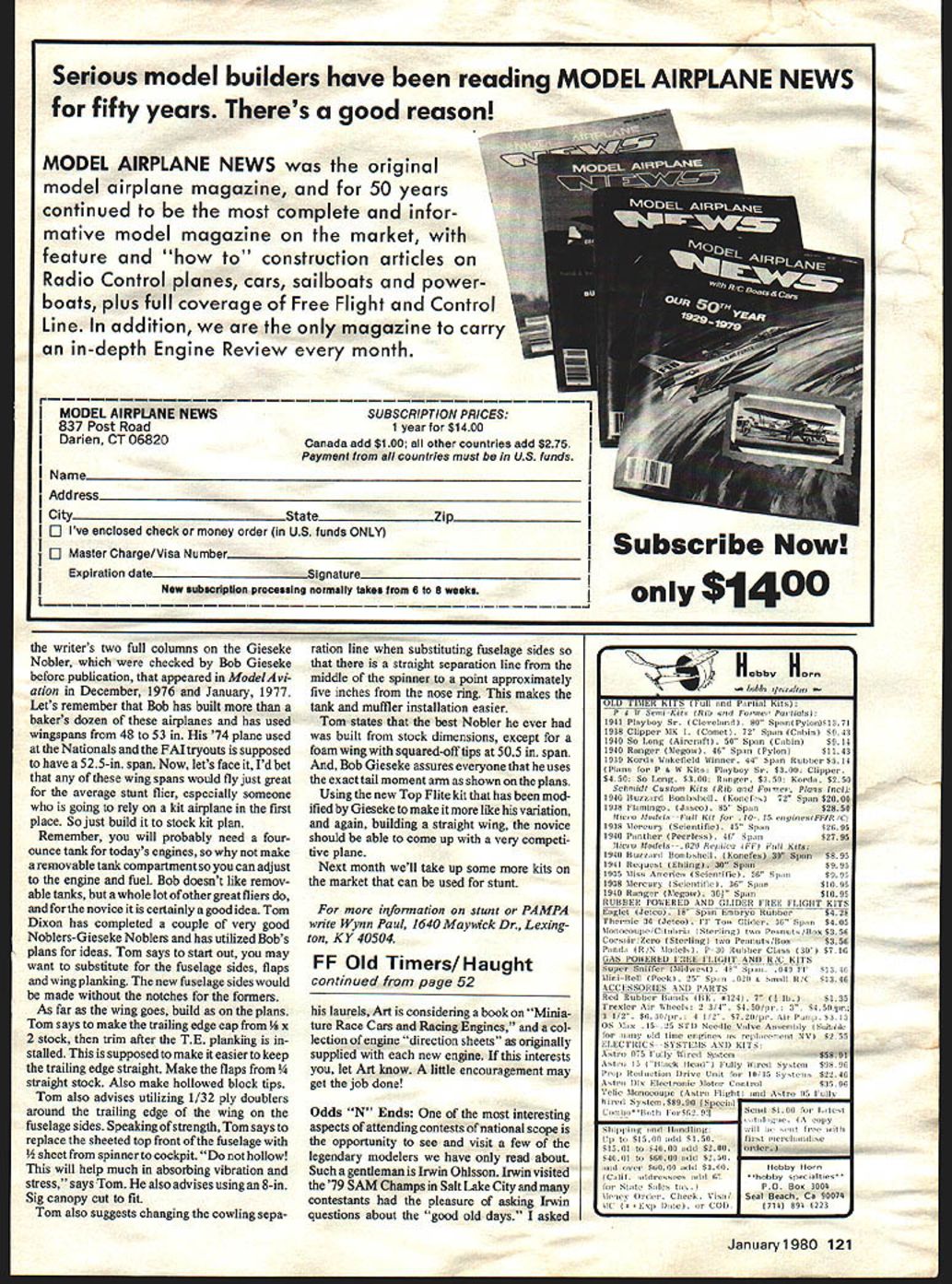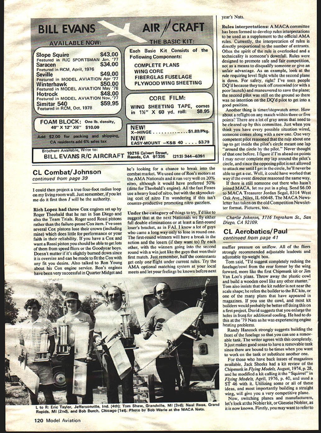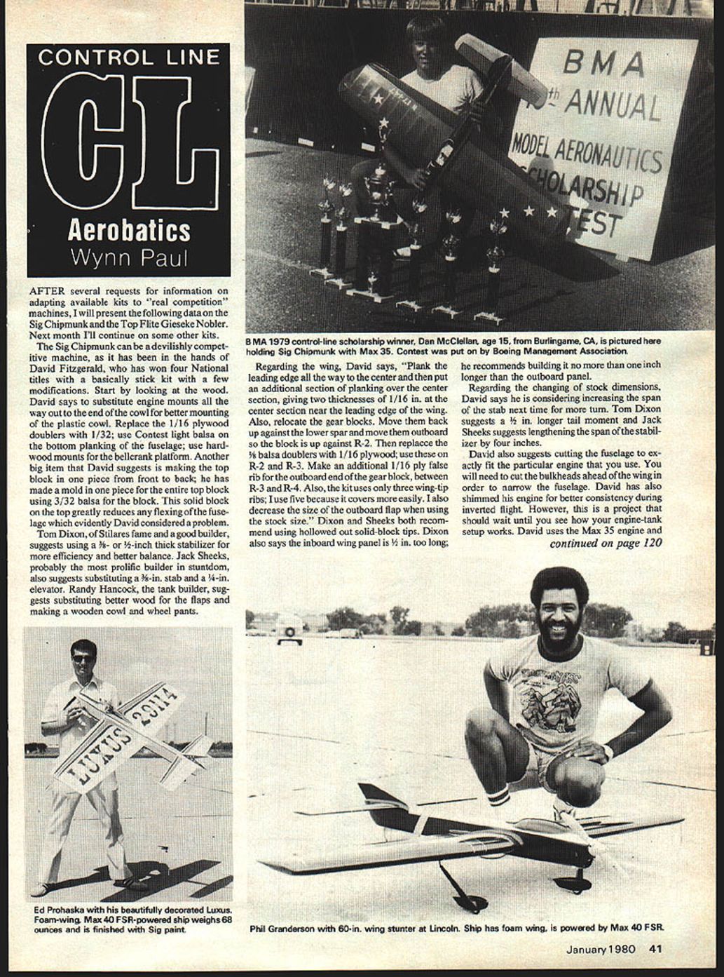 AFTER several requests information adapting available kits real competition machines will present following data Sig Chipmunk Top Flite Gieseke Nobler Next month Ill continue some other kits Sig Chipmunk can devilishly compet itive machine has hands David Fitzgerald has won four National titles basically stick kit few modifications Start looking wood David says substitute engine mounts way Out end cowl better mounting plastic cowl Replace 1/16 plywood doublers 1/32 use Contest light balsa bottom planking fuselage use hard wood mounts bellcrank platform Another big item David suggests making top block piece front back has made mold piece entire top block using 3/32 balsa block solid block top greatly reduces flexing ofthe fuse lage evidently David considered problem Tom Dixon Stilares fame good builder suggests using -inch thick stabilizer efficiency better balance Jack Sheeks probably prolific builder stuntdom also suggests substituting -in stab -in elevator Randy Hancock tank builder sug gests substituting better wood flaps making wooden cowl wheel pants Regarding wing David says Plank leading edge way center put additional section planking over center section giving two thicknesses 1/16 center section near leading edge wing Also relocate gear blocks Move back up against lower spar move outboard block up against R-2 replacce balsa doublers 1/16 plywood use R-2 R-3 Make additional 1/16 ply false rib outboard end gear block between R-3 R-4 Also kit uses three wing-tip ribs use five because covers easily also decrease size outboard flap using stock size Dixon Sheeks both recom mend using hollowed out solid-block tips Dixon also says inboard wing panel long recommends building no inch longer outboard panel Regarding changing stock dimensions David says considering increasing span stab next time turn Tom Dixon suggests er tail moment Jack Sheeks suggests lengthening span stabil izer four inches David also suggests cutting fuselage ex actly fit particular engine use will need cut bulkheads ahead wing order narrow fuselage David has also shimmed engine better consistency during inverted flight However project should wait until see engine-tank setup works David uses Max 35 engine continued page 120 January1980 41 B MA 1979 control-line scholarship winner Dan McClellan age 15 Burlingame CA pictured holding Sig Chipmunk Max 35 Contest put Boeing Management Association d IrohasKa beautifully decorated Luxus Foam-wing Max 40 FSR-powered ship weighs 88 ounces finished Sig paint Phil Granderson 50-in wing stunter Lincoln Ship has foam wing powered Max 40 FSR CL Combat/JohnSOn continued page 39 could project true four-foot radius loop living room wall Just remember let first will authority Rich Lopez three Cox engines set up Roger Theobald ran San Diego also Team Trials Roger used Rossi pistons rather failure-prone Cox item Ive seen several Cox pistons lose crown including does little performance faith reliability have Cox want Rossi piston should able get lots speed fliers Goodyear boys Doesnt matter its slightly burned down since oversize can made fit Cox fit desire Also talked Ron Young about Cox engine service Rons engines have very successful Quarter Midget COMPLETE PLANS WING CORE FIBERGLAS FUSELAGE PLYWOOD WING SHEETING hes looking chance break combat market used Rons motors AMA Nationals ran very well 20% nitro although would have preferred 50% ditto Theobalds engine fast Foxes use heavy load nitro skyrocket ing cost nitro Im wondering isnt counter-productive promoting nitro guzzlers Under category things try Id like suggest next Nationals fly either full double eliminations least first-round losers bracket FM know lot guys came long way lose round first-round winners will have break action losers want fly other winners going second round win just like guys won first match Just remember half contestants get flight under current rules Try AMA optional matching system local meets let feelings known before next years Nats Rules interpretations MACA committee has formed develop rules interpretations used supplement official AMA rules Currently interpretation rules directly proportional number entrants Often spirit rule overlooked technicality someones downfall Rules designed promote safe fair competition means disqualify someone give unfair advantage As example look rule requiring level flight second plane down safety right Ive seen people DQd because took off crosswind poor launch maneuvered save plane second pilot still ground no intention DQd pilot get good position Another thing timer/stopwatch error about reflight match within three five points lot gray areas need cleared up committee Just think have possible situation wired someone comes along new very competent pilot reasoned rule about lap get inside pilots circle meant lap around circle pilot Never thought before figure Im ahead points may never complete lap around pilots circle since opposing pilot allowed attack until get circle hell never able get cut Well could have worked way event director reasoned same way still someone out hasnt joined MACA let put plug Send $600 MACA Treasurer Jordan Segal 8314 West Oak Ave Niles IL 60648 MACA News letter has taken old Competition Newslet ter format Pictures too Charlie Johnson 3716 Ingraham St San Diego CA 92109 CL Aerobatics/Paul continued page 41 muffler pressure uniflow fliers strongiy recommended adjustable leadouts adjustable tip-weight box Tom said Id suggest completely redoing fuselage/cowl rear former wing forward like first Chipmunk kit Jim Van Laos plans Throw away plastic cowl build wooden cowl like other stunter Tom also insists kit rudder near scale shape refers builder RC kits plans have appeared magazines use cowl kit builders would probably better off doing first project David suggests enlarge holes front additional cooling 79 Nats experiencing engine heating problems Randy Hancock strongiy suggests building front fuselage can use remov able tank writer agrees completely just mak