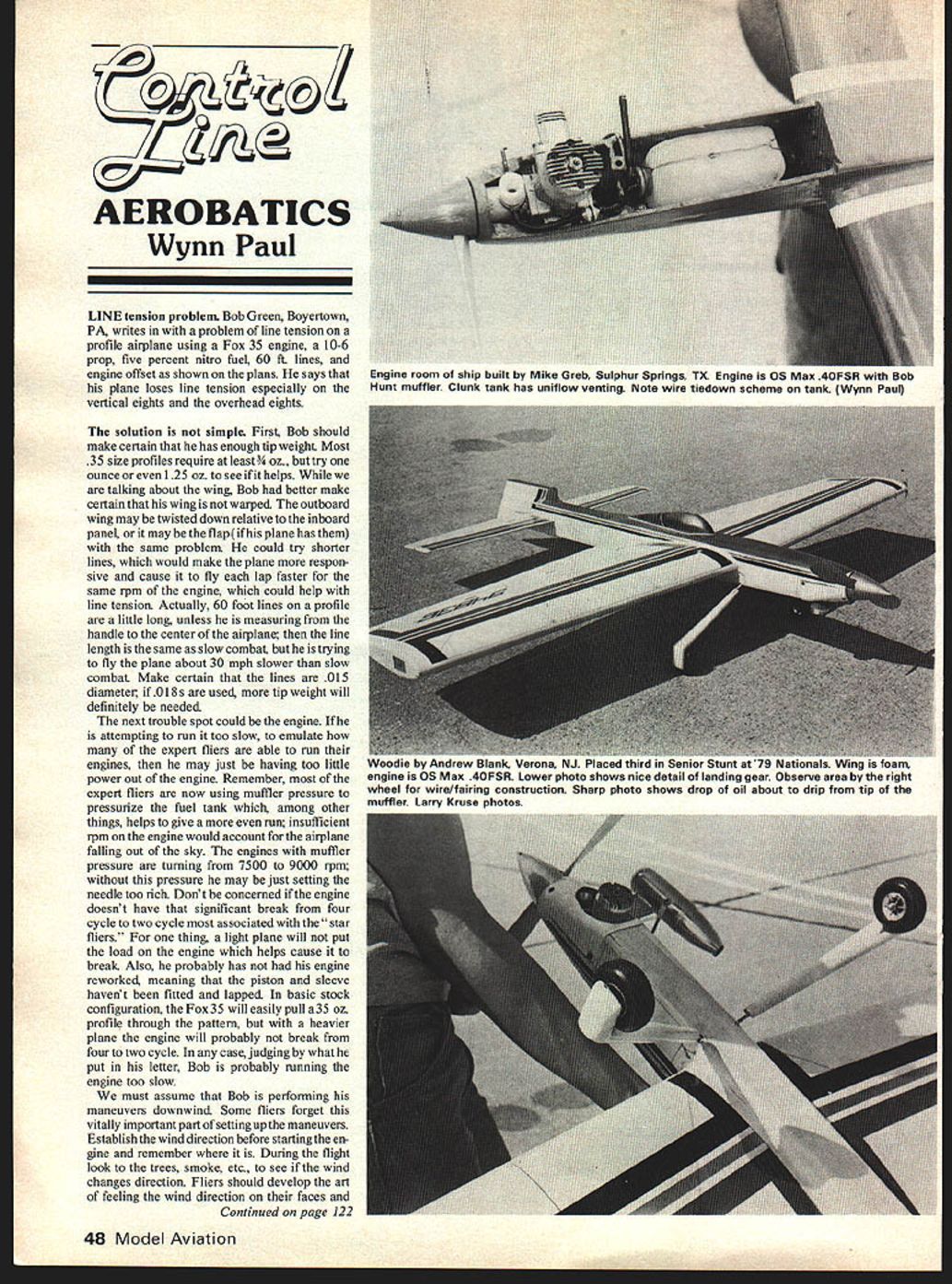 AEROBATICS Wynn Paul LINE tension problem Bob Green Boyertown PA writes problem line tension profile airplane using Fox 35 engine 10-6 prop five percent nitro fuel 60 ft lines engine offset shown plans says plane loses line tension especially vertical eights overhead eights solution simple First Bob should make certain has enough tip weight Most 35 size profiles require least ry ounce 125 oz see helps talking about wing Bob better make certain wing warped outboard wing may twisted down relative inboard panel maybe flap plane has same problem could try shorter lines would make plane respon sive cause fly lap faster same rpm engine could help line tension Actually 60 foot lines profile little long unless measuring handle center airplane line length same slow combat trying fly plane about 30 mph slower slow combat Make certain lines 015 diameter 018s used tip weight will definitely needed next trouble spot could engine attempting run too slow emulate expert fliers able run engines may just having too little power out engine Remember expert fliers now using muffler pressure pressurize fuel tank among other things helps give run insufficient rpm engine would account airplane falling out sky engines muffler pressure turning 7500 9000 rpm pressure may just setting needle too rich Dont concerned engine doesnt have significant break four cycle two cycle associated star fliers thing light plane will put load engine helps cause break Also probably has engine reworked meaning piston sleeve havent fitted lapped basic stock configuration Fox 35 will easily pull a35 oz profile through pattern heavier plane engine will probably break four two cycle case judging what put letter Bob probably running engine too slow must assume Bob performing maneuvers downwind Some fliers forget vitally important part setting up maneuvers Establish wind direction before starting en gine remember During flight look trees smoke etc see wind changes direction Fliers should develop art feeling wind direction faces Continued page 122 48 Model Aviation Engine room ship built Mike Grab Sulphur Springs TX Engine OS Max 4OFSR Bob Hunt muffler Clunk tank has uniflow venting Note wire tiedown scheme tank Wynn Paul nfluruvv VUFOId Idd rIdUUU CIIIIU III CUIIU engine us OS Max r photo shows nice detail Ia wheel wire/fairing construction Sharp photo shows drop ui muffler Larry Kruse Dhotos EU 330EU WV PROPS FOR BIGGIES Now can experience full thrust potential chain saw engine prop-drive new durable efficient glass-filled nylon pY NATNrati props Platt Seen QSAA Fun Flys Louisville Las Vegas Look us up WRAMS TOLEDO Direct Factory Introductory Prices New items biggies coming DYNAHUB easist safest way start big engines DYNATI-IRUST Prop Balancer Accurate Easy-to-use & inespensive Add 50 PER PROP shipping USA pay shipping charges orders 6 s Send CHECK MO VISA MC COD mounts place Cut holes bladder tube fuelproof its interior pouring about two ounces thinned white glue sloshing around pouring out excess Fuel-proof motor mount slow-curing epoxy glue last step before engine mounting check warps also im portant steps position full soft drink can four corners wing flat surface Put straight pins tip leading edge trailing edge four pins rest cans wing straight now time mount engine go flying yours fly good hope dont meet contest CL Scale/Gretz Continued page 47 fourth control line first Zlin Akrobat used standard G-S 3-line bellcrank system throttle control An inverted style bellcrank mounted fuselage solid music wire pushrod going Fox Eagle carburetor Rhom Air retract system am familiar IN STOCK NOW 186 188 208 2010 $700 700 900 900 COMING EARLY 1980 156$500 16550 166500 Dynathrust Props Inc 2541 NE 11th Court Pompano Beach FL 33062 Raymond Colelli 305 941 9119 having used since 1973 has 4-way switching valve actuate up down movements landing gears presume other pneumatic systems have similar valve valve basically junction box systems up down pressure air hoses valve has grooved sliding barrel inside routes pressurized air appropriate up down hose end barrels travel RC applications standard servo drives inner barrel end valve other Zlin use throttle pushrod same job As can see accompanying drawing spur wire wrapped soldered throttle pushrod spur wire two wheel collars small enough slide valve push barrel valve body itself securely fastened fuselage structure throttle pushrod moves forward open carburetor number 2 collar pushes barrel front valve thus connecting up air hose pressure hose bringing landing gear up Conversely throttle pushrod closes carb number 1 collar pushes barrel rear valve completes down circuit lowers landing gear use wheel collars spur wire makes exact timing retraction ex tension gears adjustable within power range engine number 2 collar adjusted gears came up absolute full high throttle Obviously makes necessary take offwith just slightly less full power avoid prematurely retracting gear ground doesnt present problem model adequately powered number 1 collar adjusted gear came down throttled back about /s-/z power setting Im sure sort actuating arrangement would work equally well model size wing loading range Zlin years flew particular model including two Nationals never reason wish could operate retracts independently throttle fact might consider using extra pneumatic air cylinder operate flaps tailhook etc conjunction retracts throttle could simply plug extra cylinder retract system same way done retractable tailwheel nose gear Mike Gretz Box 162 Montezuma IA 501 71 CL Aerobatics/Paul Con finued page 48 ears Lastly Bob said engine offset called plans might try some shims under front engine see helps line tension might also have move leadouts back forward change amount line tension Most profile kits built leadouts position Bob may have move around see helps summary good order trouble shooting case would 1 wing alignment including flaps also see stabilizer matched up line wing 2 wind direction 3 tip weight 4 engine Bob might wa
