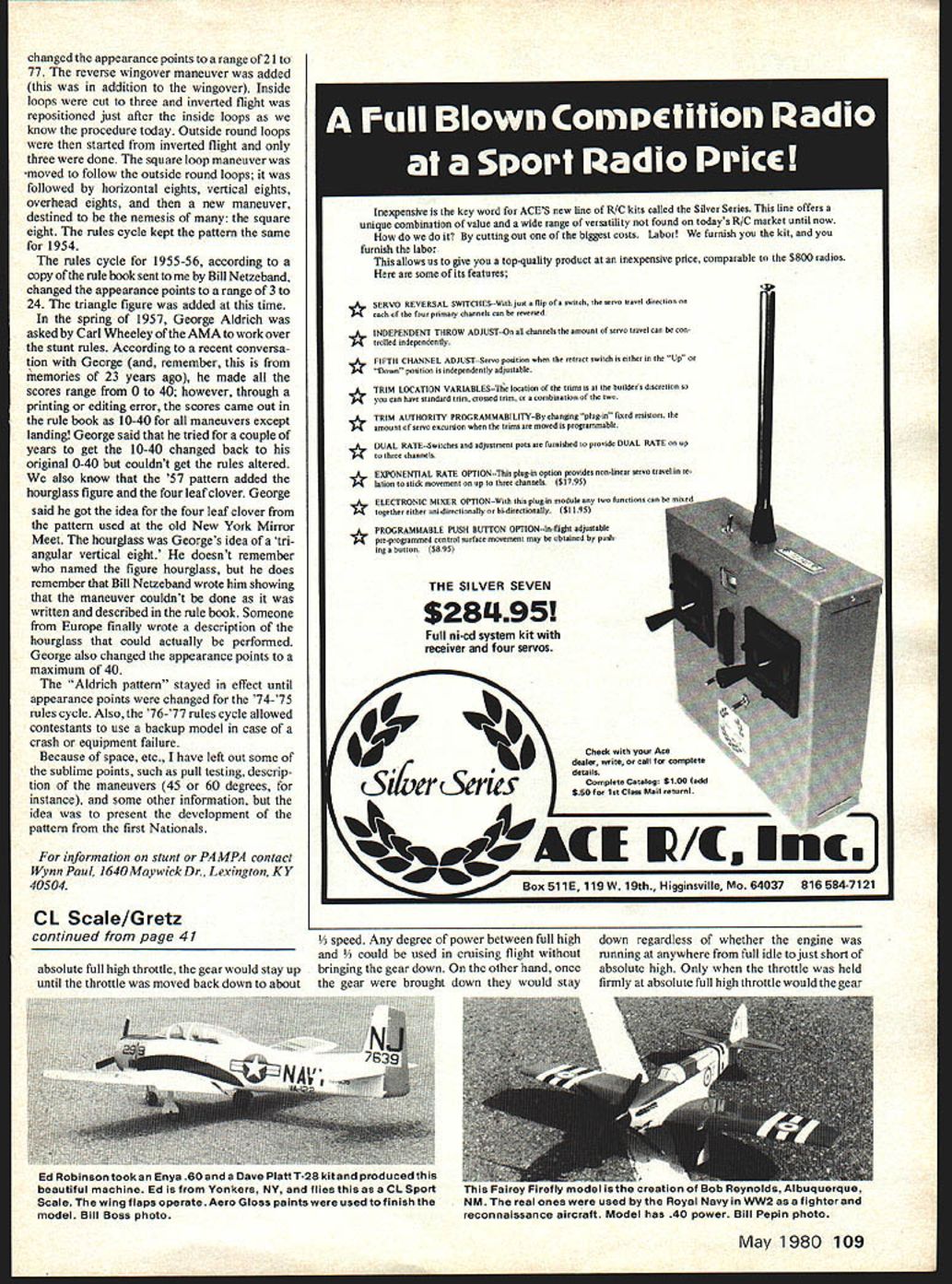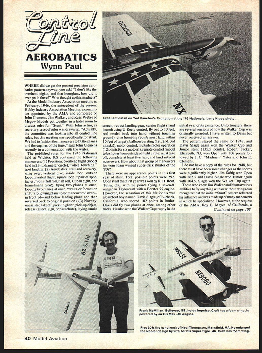 [7g AEROBATICS Wynn Paul WHERE did get present precision aero batics pattern anyway ask dont like overhead eights hourglass did ever get thought up madness Model Industry Association meeting February 1946 antecedent present Hobby Industry Association Meeting commit tee appointed AMA composed John Clemens Jim Walker Russ Weber Megow Models got together hotel room discuss rules Stunt John acting secretary aset rules drawn up Actually committee looking control line rules meeting specifically stunt fashion maneuvers fit planes engines time said John Clemens recently conversation writer published rules 1946 Nationals held Wichita KS contained following maneuvers 1 Precision overhead flight model held 25-ft diameter circle wheel touching spot landing 2 Aerobatics stall recovery wing over vertical dive inside loop outside loop inverted flight square loop pair spec tacles rolls full roll half roll Cuban eight Immelmann turn flying two planes once looping two planes once waltz formation shift following plane maneuvered over front ofand below leading plane reversed back original position 3 Novelty unassisted takeoff pick-up glider pick-up object release glider sign parachute laying smoke screen retract landing gear carrier flight hand launch using U-Reely control fly out 70 feet reel model back hand touching ground dive bombing bomb must land within 10 feet target balloon burstinglst 2nd 3rd attacks motor control multiple motor operation 12 points six motors remote control model flown outside flight circle must take off complete least five laps land nose-over about group maneuvers foam winged super-trick stunter 80s no appearance points first year stunt Total possible points 292 Open stunt first year won R H Roof Tulsa OK 56 points flying seven-ft wingspan Taylorcraft Forster 99 engine However sensation Nationals barefoot boy named Davis Slagle Burbank California scored 102 points Junior Davis did fly two planes once among other tricks also won Walker Cup trophy initial year its existence Unfortunately several versions Walker Cup originally awarded have written Davis never received answer pattern stayed same 1947 Davis Slagle again won Walker Cup Junior stunt 1355 points Robert Tucker Elizabeth NJ won Open 102 points fol lowed J C Madman Yates John E Clemens have copy rules 1948 must have some changes scores significantly higher Jim Saftig won Open 3825 Davis Slagle won Junior again 3645 Slagle won Walker Cup again knew Jim Walker marvelous abilities fly anything wings can recognize initial Stunt pattern reflected influence made up maneuvers specialized However request AMA Roy E Mayes California Continued page 108 PIus 20 handiworkof Neal Thompson Mansfield MA enlarged Nobler design 20% Super Tigre 46 Craft has foam wing 40 Model Aviation Excellent detail Ted Fanchers Excitation 79 Nationals Larry Kruse photo Frank McMillan Bellevue NE holds Impulse Craft has foam wing powered OS Max 40 engine F@RECATOR MOLD YOUR OWN PARTS FOR PLANES BOATS CARS ETC w -w $4995 Instructions assembly & use included $39 Includes A8St Pack ABS ID PREPAID dealer order directUS ONLY Vacuum former plastics Easyto make own Cowls wheel pants Canopies etc works home oven hose type vacuum Cleaner Qualified Dealer Inquiries Invited PLA8TICBuIk Packs ABS PI.tjo Sheet Fornicede sheets 8th 17 Packs Only PCSPACK THICKNESSPER PACKPRICE 0201/50 500 030 1/32 00 045 3/64 00 0601/16 00 090 3/32 00 AssortmentPack see below1500 Asofln, PerkeerIe/os 0-020/4-030/3- 040 2 060/ Sod 1050 shelr doe perk $1500 soOn, ordered ,itl th* FOr,icror AlAS ned/tn Over 3 lbs per pock Idea Development Inc Box 7399 rk Delaware 19711 AEROBATIC AIRPLANES BY ROST C MORRISON .I IS SUPERB DRAWINGS 8395 PLUS ..L SOW POSTA~ CATALOGS ~k-TECN III $100Ocean rule Ken riwy VIOA CR6005 60466 shell skin varying thickness being thicker front landing gear wing engine imposed large loads assembled shells reinforced internal rings longitudinals joined together produce alight strong efficient fuselage good fuselage shell could molded same way would require far too much work making mold reinforcing shells Planking reasonable choice will bit differently however relying less thick balsa technique will start repeating some shell techniques steps already described first step produce side view accurate cross sections stress location such wing spar firewall landing gear attach ment stations Other intermediate cross sections will needed produce good form perhaps reinforce hand-launching grip zone Set up top bottom outline strips drawing erect half bulkheads just done sheet shell assembly Again accurate bulkhead edges will meet join shells mated together Since both halves should identical will use fairing strips find contour changes corrections needed half bulkheads first half shell will correct other halves match Now lay single 16 stringer front rear along hori zontal outer belt line should notch flush bulkheads problem planking fuselage boat hull planks must narrower get smaller sections boat builder has technique calls spilingused establish taper necessary Spiling would very difficult tedious model work tackle problem another way need make long gently-curved taper planks allow change fuselage circum ference will cut curves straightedge Four 1/16 highjigging blocks will cemented cutting board 5/16 X 1/16 strip forced curve blocks straight line cut will become curve strip allowed unbend straight cut made blade several degrees off vertical will bevel edge curved edge can assist getting good edge joint Fig 1 shows layout ofjigging blocks used 1/12 scale Lockheed Vega largest semi-circumference fuselage example 5 expect use -wide planks will 20 planks required However small end has semi-circumference 1 planks must taper 1/16 wide end arithmetic useful accuracy size up producing perfect matching will still have make adjustment last two planks Proceed center line belt line stringer making sure no cement squeezeout interfere next plank Add plank side belt line alternating above below watc