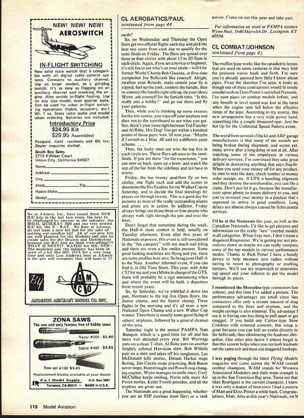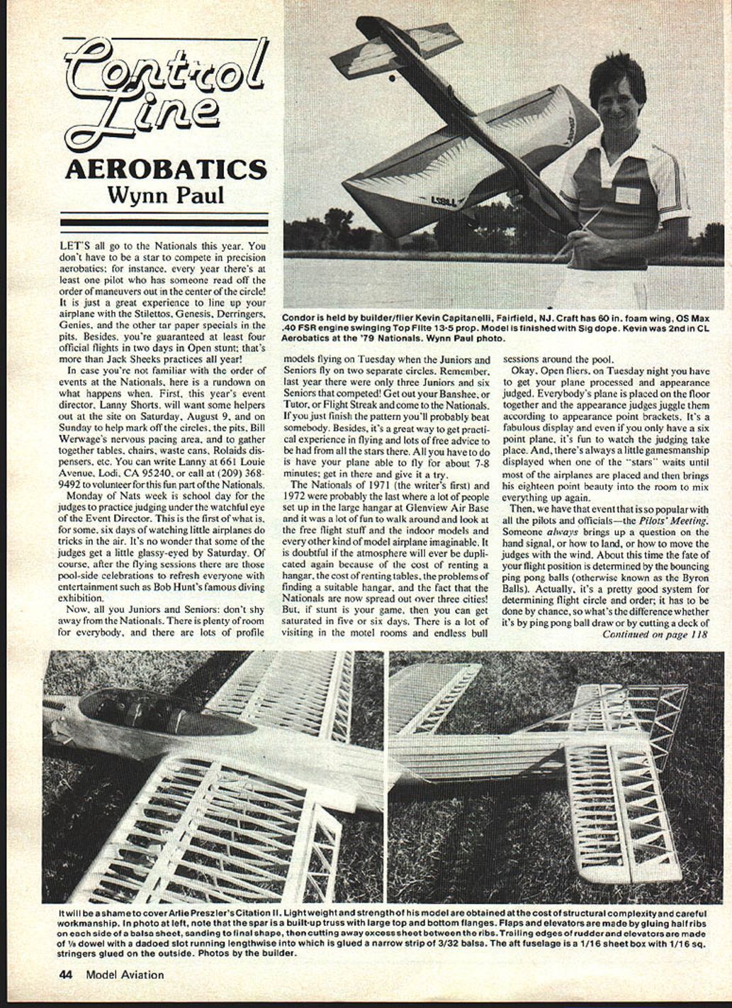 AEROBATICS Wynn Paul LETS go Nationals year dont have star compete precision aerobatics instance year theres least pilot has someone read off order maneuvers out center circle just great experience line up airplane Stilettos Genesis Derringers Genies other tar paper specials pits Besides youre guaranteed least four official flights two days Open stunt thats Jack Sheeks practices year case youre familiar order events Nationals rundown what happens First years event director Lanny Shorts will want some helpers out site Saturday August 9 Sunday help mark off circles pits Bill Werwages nervous pacing area gather together tables chairs waste cans Rolaids dis pensers etc can write Lanny 661 Louie Avenue Lodi CA 95240 call 209 3689492 volunteer fun part ofthe Nationals Monday Nats week school day judges practice judging under watchful eye Event Director first what some six days watching little airplanes tricks air Its no wonder some judges get little glassy-eyed Saturday course after flying sessions pool-side celebrations refresh everyone entertainment such Bob Hunts famous diving exhibition Now Juniors Seniors dont shy away Nationals plenty room everybody lots profile models flying Tuesday Juniors Seniors fly two separate circles Remember last year three Juniors six Seniors competed Get out Banshee Tutor Flight Streak come Nationals just finish pattern youll probably beat somebody Besides its great way get practi cal experience flying lots free advice stars have have plane able fly about 7-8 minutes get give try Nationals 1971 writers first 1972 probably last lot people set up large hangar Glenview Air Base lot fun walk around look free flight stuff indoor models other kind model airplane imaginable doubtful atmosphere will ever dupli cated again because cost renting hangar cost renting tables problems finding suitable hangar fact Nationals now spread Out over three cities stunt game can get saturated five six days lot visiting motel rooms endless bull sessions around pool Okay Open fliers Tuesday night have get plane processed appearance judged Everybodys plane placed floor together appearance judges juggle according appearance point brackets Its fabulous display have six point plane its fun watch judging take place theres always little gamesmanship displayed stars waits until airplanes placed brings eighteen point beauty room mix everything up again have event popular pilots officialsthe Pilots Meetingl Someone always brings up question hand signal land move judges wind About time fate flight position determined bouncing ping pong balls otherwise known Byron Balls Actually its pretty good system determining flight circle order has done chance whats difference whether its ping pong ball draw cutting deck Continued page 118 Itwill bea shame coverArlie Preszlers Citation II Lightweightand strength model obtained atthe costof structural complexityand careful workmanship photo left note spar builtup truss large top bottom flanges Flaps elevators made gluing half ribs side ofa balsa sheet sanding final shape cutting awayexcess sheet betweenthe ribs Trailing edges rudderand elevatorsare made 1/ dowel dadoed slot running lengthwise glued narrow strip 3/32 balsa aft fuselage 1/16 sheet box 1/16 sq stringers glued outside Photos builder 44 Model Aviation Condor held builder/flier Kevin Capitanelli Fairfield NJ Craft has 60 foam wing OS Max 40 FSR engine swinging Top Flite 13-5 prop Model isfinished Sig dope Kevin 2nd CL Aerobatics 79 Nationals Wynn Paul photo NEW NEW NEW AEROS WITCH IN-F LIGHT SWITCHING New solid state switch compati ble digital radio control sys tems Connects auxiliary channel Use larger models gb-plug switch Its easy flipping auxiliary channel cranking en gine Also avoids in-flight fouling Use size model quarter scale Can used other in-flight switch ing operations lights actuators etc Wt 1 oz State radio make model ordering Batteries included Introductory Price $2495 Kit $2995 Assembled Postpaid Calif residents add 6% tax Dealer inquiries invited South Bay Sales 2715 Killdeer Court Union City California 94587 Nam StateZip Radio Make______________________ MndI CL AEROBATICS/PAUL co ntinued page 44 cards So Wednesday Thursday Open fliers get two official flights day pick best score day qualify semi-finals Friday fliers spread over three four circles about 15 20 fliers circle Again novice beginner its still fun see whos circlewill former World Champ Bob Gieseke first-time competitor Joe Bellcrank like yourself Alright swallow Rolaids make certain fly zipped fuel up tank connect handle re-connect handle right side up tie shoes Wynn ask yourself fortieth time really just hobby go out fly patterns youre thinking up some excuses low scores wipe off airplane run scoreboard see what got See theres name right between Ted Fancher Al Rabe Hot Dog got within hundred points guys wait til next year Maybe switch Max 40 try different paint scheme lucky ones see top five circle fliers advance semi finals experience can now sit back open up brew watch rest fun sidelines have worry Friday top twenty qualifiers fly two circles flight add scores determine five finalists Walker Cup Saturday decide final standings places six through twenty good day pictures really outstanding planes pilots action addition Friday always brings Out three four people always walk right through pits over lines Dont forget sometime during week Half-A stunt contest held usually Tuesday afternoon after five years Nationals exposure event still considered fun category much nail biting few smiles present Some good looking machines flying yes some profiles also So bring Half-A Nats Another informal event can find Old Time Stunt year John 52 Miske charge OTS will probably sign announcing event will held departure recent years So Saturday weve whittled down no pun Norman top five Open flyers Junior champ Senior champ Three flights morning its over new National Open Champ new Walker Cup winner usually some guest flying others airplanes 