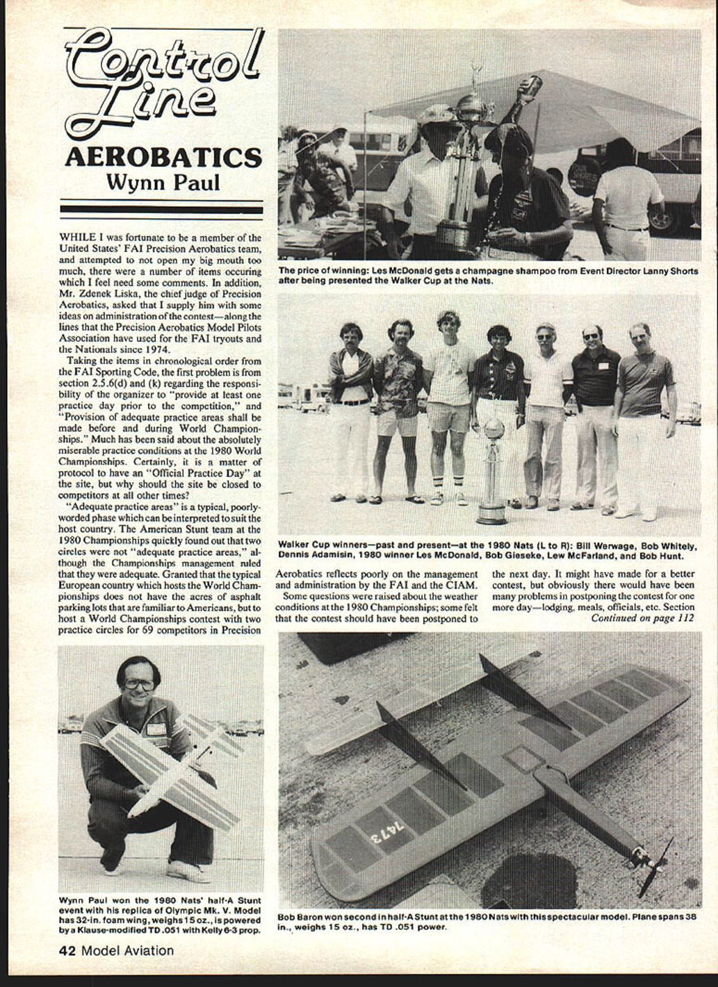 AEROBATICS Wynn Paul WHILE fortunate member United States FAI Precision Aerobatics team attempted open big mouth too much number items occuring feel need some comments addition Mr Zdenek Liska chief judge Precision Aerobatics asked supply him some ideas administration contestalong lines Precision Aerobatics Model Pilots Association have used FAI tryouts Nationals since 1974 Taking items chronological order FAI Sporting Code first problem section 256d k regarding responsi bility organizer provide least practice day prior competition Provision adequate practice areas shall made before during World Champion ships Much has said about absolutely miserable practice conditions 1980 World Championships Certainly matter protocol have Official Practice Day site should site closed competitors other times Adequate practice areas typical poorlyworded phase can interpreted suit host country American Stunt team 1980 Championships quickly found Out two circles adequate practice areas al though Championships management ruled adequate Granted typical European country hosts World Cham pionships does have acres asphalt parking lots familiar Americans butto host World Championships contest two practice circles 69 competitors Precision Aerobatics reflects poorly management next day might have made better administration FAI CIAM contest obviously would have Some questions raised about weather problems postponing contest conditions 1980 Championships some felt daylodging meals officials etc Section contest should have postponed Continued page 112 42 Model Aviation price winning Les McDonald gets champagne shampoo Event Director Lanny Shorts after being presented Walker Cup Nats Walker Cup winnerspast presentat 1980 Nats L R Bill Werwage Bob Whitely Dennis Adamisin 1980 winner Lea McDonald Bob Gieseke Lew McFarland Bob Hunt Wynn Paul won 1980 Nats half-A Stunt event replica Olympic Mk V Model has 32-in foam wing weighs 15 oz powered bya Klause-modified TD051 Kelly6-3 prop uoo aaron won secono nalf-AStunt atthe 1980 ietswtn LIIIS speiieiular model Plane spans 38 weighs 1502 has TD 051 power FUN SCALE IS HERE Easier Fly Yet Very Maneuverable Over 20 step-by-step building illustrations easier follow photos Lands like Trainer Ideal 2nd Trainer Novice 19-25 Engine 19-40 Eng Span 51 Area 490 sq 18-20 oz wing loading 31-4 lbs Upright Engine Can Built Flown 7 Days Due New Construction Techniques WILL FLY AS SLOW AS PIPER CUB MODEL W-i te Jot free Catalog JEMCO 1305 Eoothill Dr Vista CA 92083 714 724-3242 72 Wingspan GUADRA powered DRUINE TURBULENT Gross weight under 20 lbs No foam 1230 sq Simple construction fully detailed Proven design stable aerobatic Shock-absorbing landing gear takes abuse Full-size plans instructions photos best marketS30 pp USA DOUG MAC BRIEN 24 Truhy St Granhy Mass 01033 Send SASE info engine sound wilt have Doppler frequency shift added Youve heard Im sure rpm approaching model car train motorcycle etc appears increase suddenly begins decrease model passes begins retreat time hear true frequency just moment sound stops increasing begins decrease experience pitch pipe prices can range $450 over $600 Expect pay high price local music store low price alma maters campus bookstore should able order directly writing Florida College Bookstore Temple Terrace FL 33617 Enclose $450 plus $109 postage Zeppelin/Grigg Continued page 41 water- condensing radiators four vertical black rows running vertically up sides hull US NAVY lettering main control car carved single piece basswood plastic windows added sailor stood control wheel probably still would unfinished except Tom Scott Wings & Wheels Museum wanted Akron display forced myself get back work eight propeller out riggers made brass tubing piano wire being built separately hull glued soldered together original ship eight German Maybach engines 560-hp drove shafts geared props Ihese props could swiveled up down fore aft Akron could move under its own power direction except sideways 1 put plastic discs six outriggers carved mahogany props other two trapeze Curtiss fighters made piano wire soldered together Sparrowhawk model built Bachmann Boeing F4 B4 Gary Gordon volunteered saw still details still add deadline fast approaching must say details could added would give model cluttered appearance tend obscure basic form Akron hanging Wings & Wheels Museum Orlando FL written Come see you can look airplanes too Information full-size Akron diri gible length 785 feet diameter 1329 feet helium capacity 6500000 cubic feet speed 83 mph max first flight Septemher 25 1931 lost April 4 1933 CL Aerobatics/Paul Continued page 42 259 FAI Sporting Code deals weather conditions personal experience wind seemed excess 12 in/sec contest postponed distasteful part rules always seems draw ire competi tors counting highest qualifying flight final standings Sections 428 4214 deal number flights final standings called classification FAI Sporting Code year qualifying flights spread over three full days meant judges comparing flight Bill Werwage 1000 am Monday flight Bob Hunt 930 am Tuesday still same first round may argue judge supposed compare maneuver interpretation perfect maneuver round 69 fliers split over day-and-a-half just too momentous task expect really objective scores day day carry over high score count finals just ridiculous finals should another contest competitors starting out equal flying either two three official flights Actually plenty time fly three official flights count two highest scores especially since 15 competitors Since Precision Aerobatics luck draw has great deal influence outcome instances unfair penalize finalist using qualifying score may have lower relative competitors similar abilities just because flier poor draw can see no advantage carrying-over qualify ing score Certainly everyone will attempt fly best qualifying insure make finals can no question going easy does seem simple solution lengthy qualification procedure especially since flight circle 
