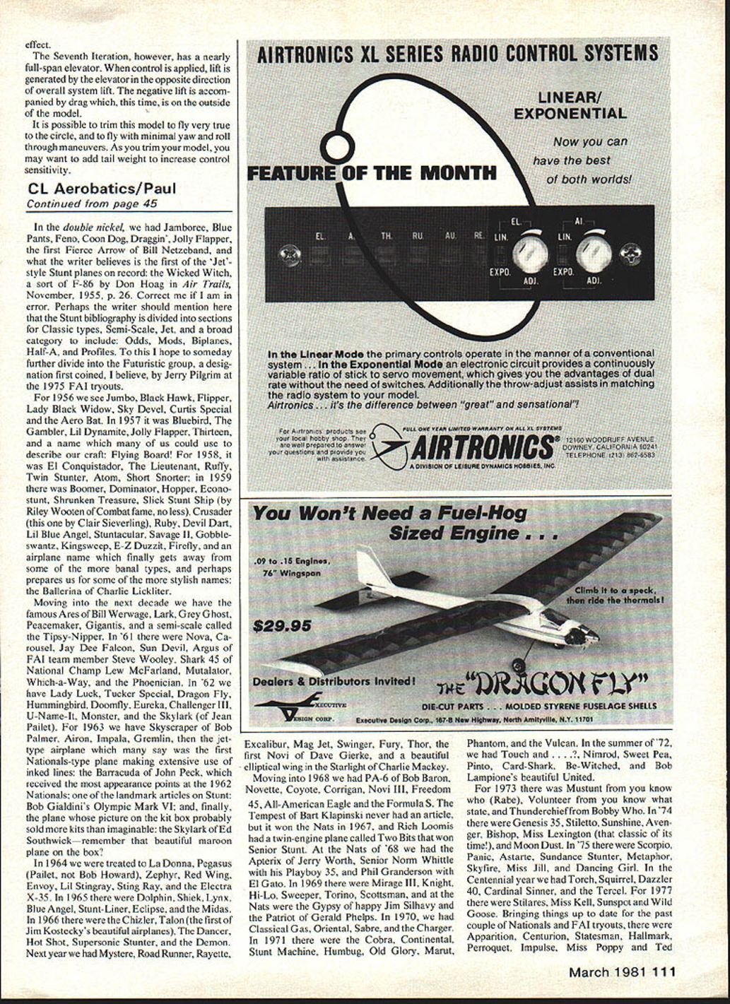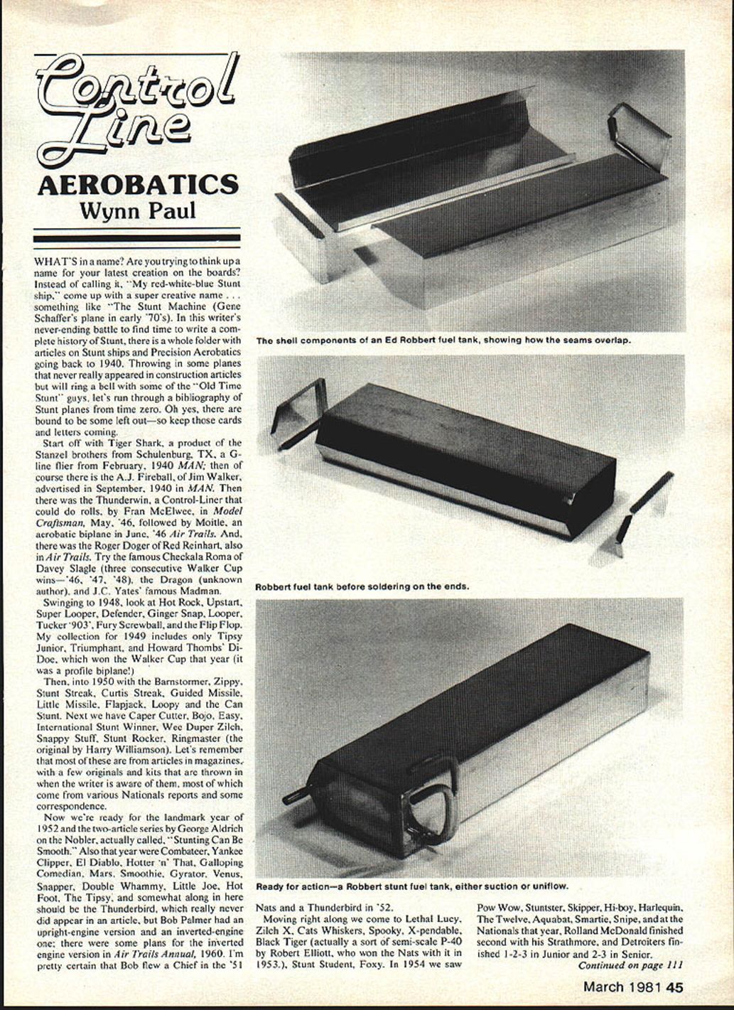 AEROBATICS Wynn Paul WHATS name Are trying think up name latest creation boards Instead calling red-white-blue Stunt ship come up super creative name something like Stunt Machine Gene Schaffers plane early 70s writers never-ending battle find time write com plete history Stunt whole folder articles Stunt ships Precision Aerobatics going back 1940 Throwing some planes never really appeared construction articles will ring bell some Old Time Stunt guys lets run through bibliography Stunt planes time zero Oh yes bound some left outso keep cards letters coming Start off Tiger Shark product Stanzel brothers Schulenburg TX line flier February 1940 MAN course AJ Fireball Jim Walker advertised September 1940 MAN Thunderwin Control-Liner could rolls Fran McElwee Model Craftsman May 46 followed Moitle aerobatic biplane June 46 Air Trails Roger Doger Red Reinhart also Air Trails Try famous Checkala Roma Davey Slagle three consecutive Walker Cup wins46 47 48 Dragon unknown author JC Yates famous Madman Swinging 1948 look Hot Rock Upstart Super Looper Defender Ginger Snap Looper Tucker 903 Fury Screwball Flip Flop collection 1949 includes Tipsy Junior Triumphant Howard Thombs DiDoe won Walker Cup year profile biplane 1950 Barnstormer Zippy Stunt Streak Curtis Streak Guided Missile Little Missile Flapiack Loopy Can Stunt Next have Caper Cutter Bojo Easy International Stunt Winner Wee Duper Zilch Snappy Stuff Stunt Rocker Ringmaster original Harry Williamson Lets remember articles magazines few originals kits thrown writer aware come various Nationals reports some correspondence Now ready landmark year 1952 two-article series George Aldrich Nobler actually called Stunting Can Smooth Also year Combateer Yankee Clipper El Diablo Hotter n Galloping Comedian Mars Smoothie Gyrator Venus Snapper Double Whammy Little Joe Hot Foot Tipsy somewhat along should Thunderbird really never did appear article Bob Palmer upright-engine version inverted-engine some plans inverted engine version Air Trails Annual 1960 Im pretty certain Bob flew Chief 51 Nats Thunderbird 52 Pow Wow Stuntster Skipper Hi-boy Harlequin Moving right along come Lethal Lucy Twelve Aquabat Smartie Snipe atthe Zilch X Cats Whiskers Spooky X-pendable Nationals year Rolland McDonald finished Black Tiger actually sort semi-scale P-40 second Strathmore Detroiters finby Robert Elliott won Nats ished 1-2-3 Junior 2-3 Senior 1953 Stunt Student Foxy 1954 saw Continued page 111 March 1981 45 shell components Ed Robbert fuel tanK showing seams overlap Robbert fuel tank before soldering ends uieaoy acTiona iwooerr sium ruci rank eminer suction uniflow effect Seventh Iteration however has nearly full-span elevator control applied lift generated elevator opposite direction overall system lift negative lift accom panied drag time outside model possible trim model fly very true circle fly minimal yaw roll through maneuvers As trim model may want add tail weight increase control sensitivity CL Aerobatics/Paul Continued page 45 double nickel Jamboree Blue Pants Feno Coon Dog Draggin Jolly Flapper first Fierce Arrow Bill Netzeband what writer believes first Jet style Stunt planes record Wicked Witch sort F-86 Don Hoag Air Trails November 1955 p 26 Correct am error Perhaps writer should mention Stunt bibliography divided sections Classic types Semi-Scale Jet broad category include Odds Mods Biplanes Half-A Profiles hope someday further divide Futuristic group desig nation first coined believe Jerry Pilgrim 1975 FAI tryouts 1956 see Jumbo Black Hawk Flipper Lady Black Widow Sky Devel Curtis Special Aero Bat 1957 Bluebird Gambler Lil Dynamite Jolly Flapper Thirteen name us could use describe craft Flying Board 1958 El Conquistador Lieutenant Ruffy Twin Stunter Atom Short Snorter 1959 Boomer Dominator Hopper Econo stunt Shrunken Treasure Slick Stunt Ship Riley Wooten Combat fame no less Crusader Clair Sieverling Ruby Devil Dart Lil Blue Angel Stuntacular Savage II Gobble swantz Kingsweep E-Z Duzzit Firefly airplane name finally gets away some banal types perhaps prepares us some stylish names Ballerina Charlie Lickliter Moving next decade have famous Ares Bill Werwage Lark Grey Ghost Peacemaker Gigantis semi-scale called Tipsy-Nipper 61 Nova Ca rousel Jay Dee Falcon Sun Devil Argus FAI team member Steve Wooley Shark 45 National Champ Lew McFarland Mutalator Which-a-Way Phoenician 62 have Lady Luck Tucker Special Dragon Fly Hummingbird Doomfly Eureka Challenger III U-Name-It Monster Skylark Jean Pailet 1963 have Skyscraper Bob Palmer Airon Impala Gremlin jettype airplane say first Nationals-type plane making extensive use inked lines Barracuda John Peck received appearance points 1962 Nationals landmark articles Stunt Bob Gialdinis Olympic Mark VI finally plane picture kit box probably sold kits imaginable Skylark ofEd Southwickremember beautiful maroon plane box 1964 treated La Donna Pegasus Pailet Bob Howard Zephyr Red Wing Envoy Lil Stingray Sting Ray Electra X-35 1965 Dolphin Shiek Lynx Blue Angel Stunt-Liner Eclipse Midas 1966 Chizler Talon first Jim Kosteckys beautiful airplanes Dancer Hot Shot Supersonic Stunter Demon Next year Mystere Road Runner Rayette Excalibur Mag Jet Swinger Fury Thor first Novi Dave Gierke beautiful elliptical wing Starlight Charlie Mackey Moving 1968 PA-6 Bob Baron Novette Coyote Corrigan Novi III Freedom 45 All-American Eagle Formula S Tempest Bart Klapinski never article won Nats 1967 Rich Loomis twin-engine plane called Two Bits won Senior Stunt Nats 68 Apterix Jerry Worth Senior Norm Whittle Playboy 35 Phil Granderson El Gato 1969 Mirage III Knight Hi-Lo Sweeper Torino Scottsman Nats Gypsy happy Jim Silhavy Patriot Gerald Phelps 1970 Classical Gas Oriental Sabre Charger 1971 Cobra Continental Stunt Machine Humbug Old Glory Marut Phantom Vulcan summer of72 Touch Nimrod Sweet Pea Pinto Card-Shark Be-Witched Bob Lampiones beautiful United 1973 Mustunt know Rabe Volunteer know what state Thunderchief Bobby 74 Genesis 35 Stiletto Sunshine 