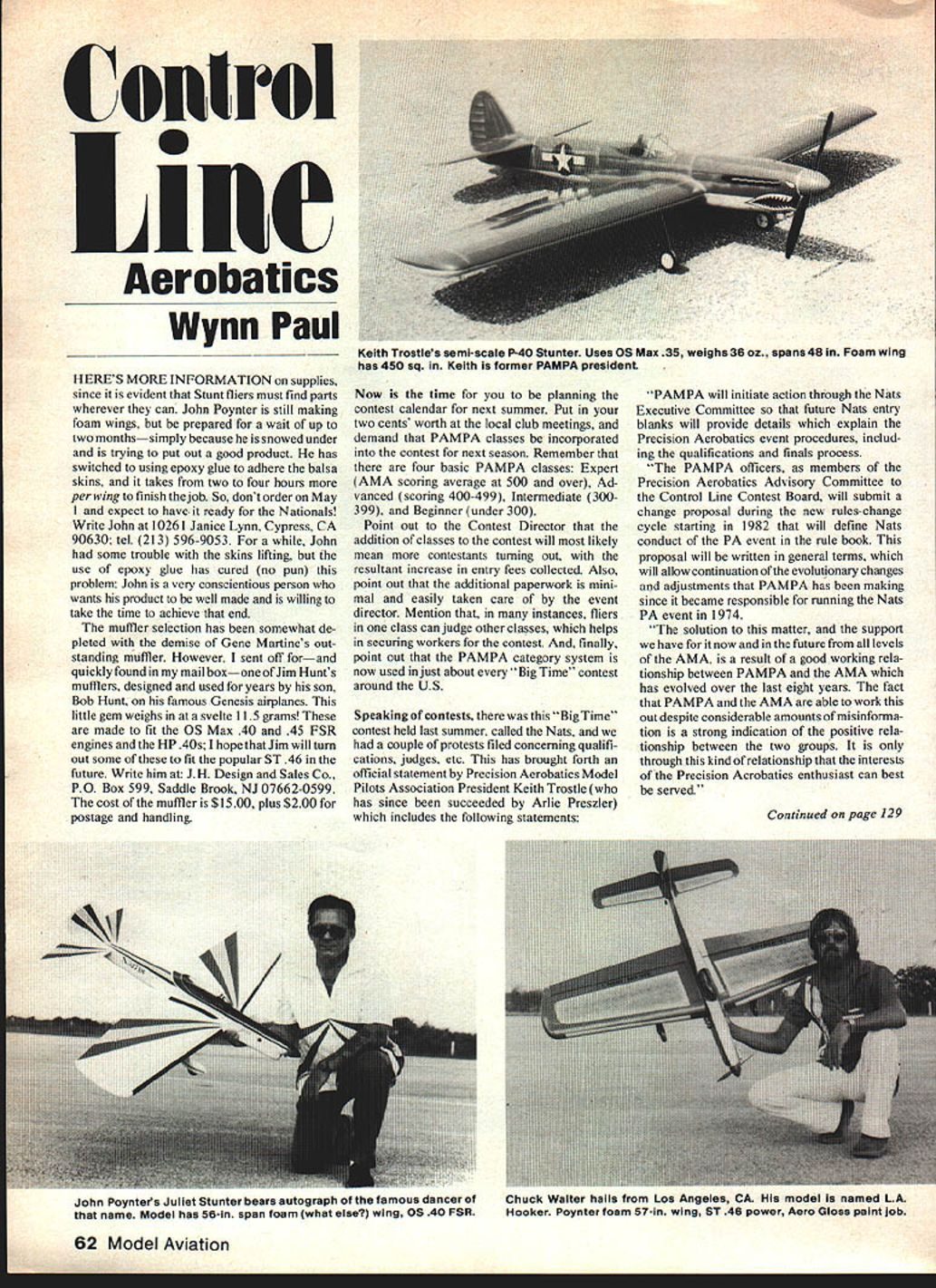 Control Inc Aerobatics Wynn Paul HERES MORE INFORMATION supplies since evident Stunt fliers must find parts wherever can John Poynter still making foam wings prepared wait up two monthssimply because snowed under trying put out good product has switched using epoxy glue adhere balsa skins takes two four hours per wing finish job So dont order May expect have ready Nationals Write John 10261 Janice Lynn Cypress CA 90630 tel 213 596-9053 John some trouble skins lifting use epoxy glue has cured no pun problem John very conscientious person wants product well made willing take time achieve end muffler selection has somewhat de pleted demise Gene Martines out standing muffler However sent off forand quickly found mail boxone Jim Hunts mufflers designed used years son Bob Hunt famous Genesis airplanes little gem weighs svelte 115 grams made fit OS Max 40 45 FSR engines HP 40s hope Jim will turn out some fit popular ST 46 future Write him JH Design Sales Co PO Box 599 Saddle Brook NJ 07662-0599 cost muffler $1500 plus $200 postage handling Now time planning contest calendar next summer Put two cents worth local club meetings demand PAMPA classes incorporated contest next season Remember four basic PAMPA classes Expert AMA scoring average 500 over Ad vanced scoring 400-499 Intermediate 300399 Beginner under 300 Point out Contest Director addition classes contest will likely mean contestants tuming out resultant increase entry fees collected Also point out additional paperwork mini mal easily taken care event director Mention instances fliers class can judge other classes helps securing workers contest finally point out PAMPA category system now used just about Big Time contest around US Speaking contests Big Time contest held last summer called Nats couple protests filed concerning qualifi cations judges etc has brought forth official statement Precision Aerobatics Model Pilots Association President Keith Trostle has since succeeded Arlie Preszler includes following statements PAMPA will initiate action through Nats Executive Committee future Nats entry blanks will provide details explain Precision Aerobatics event procedures includ ing qualifications finals process PAMPA officers members Precision Aerobatics Advisory Committee Control Line Contest Board will submit change proposal during new rules-change cycle starting 1982 will define Nats conduct PA event rule book proposal will written general terms will allow continuation evolutionary changes adjustments PAMPA has making since became responsible fur running Nats PA event 1974 solution matter support have now future levels AMA result good working rela tionship between PAMPA AMA has evolved over last eight years fact PAMPA AMA able work out despite considerable amounts misinforma tion strong indication positive rela tionship between two groups through kind relationship interests Precision Acrobatics enthusiast can best served 62 Model Aviation Keith Trostles semi-scale P-40 Stunter Uses OS Max 35 weighs 36 oz spans 48 Foam wing has 450 sq Keith former PAMPA president Continued page 129 John Poynters Juliet Stunter bears autograph 0 famous dancer name Model has 56-in span foam what else wing OS 40 FSR Chuck Walter hails Los Angeles CA model named LA Hooker Poynter foam 57-in wing ST 46 power Aero Gloss paint job underneath rubber tubing over tank wires protection fuel filter may need frequent cleaning first new tank Engines Fox Combat Special Mark III has standard engine Dragon Future models will feature Mark IV have yet opportunity test Supertigre G2 have used some loss speed 05 36 has used some success local contests OS equals Fox speed adds too much weight good maneuverability opinion Fox consistently pulls Dragon 92 94 mph 15% nitro exceptional engine able break 100 several times 30% get under 90 something wearing out modifications replace rear bearing Hoover-NSK R8 78 use Supertigre needle valve assembly venturi insert wrapped polyethelene plastic form air seal head clearance set 015 018 essential good performance Break-in via bench running 9-6 prop cut 8 Lapping required certain very tight replacement pistons sleeves like Fox becasue runs right Out box doesnt take time away important things like fuel tanks Flying completed airplane should weigh 265 ounces balance 25% chord slightly outboard thrust line sidemounted engine leadout position offset wing provide line tension necessary recommend tip weight engine out-thrust rudder offset Make initial test flight engine set rich side until become familiar needling engine chicken hopper tank Foamies can become warped covering assembly check out use iron trim tabs correct warp plane feels too sluggish go aft CG control Ive never come Out tail-heavy yet Top Flite 9-5s 9-6s cut 8-6 work well have four Dragons tested trimmed out should ready contest CL Aerobatics Paul Continued page 62 Bill Lindemann Metuchen NJ wrote question come results WinstonSalem CL Championships showed Novice Beginner scores 454 442 431 Well thats good question does show voluntary placing usually allow contestants seed themselves category choice doesnt always work out numbers However lets also remember what 454 region may another because ofjudging differences abilities competitors etc scores shown Advanced Expert categories results contest sent writer however can surmise Experts probably scored 520 over Advanced falling somewhere between 450 500 What says PAMPA categories dont always work right down line since contest management still refuses have four cate gories Winston-Salem meet will necessarily some place scores will off usual scale place Richard Byrons records pilots scores would come handy contest management reference guide Perhaps could have copies pilots rankings sent major NOT JUST ANOTHER CATALOG novice tips experts expert thousands products specifica tions photos help decide make hobby enjoyable everybody interested RI Its standard reference book Will Ever Need Available through local hobby shop use coupon Yes sen