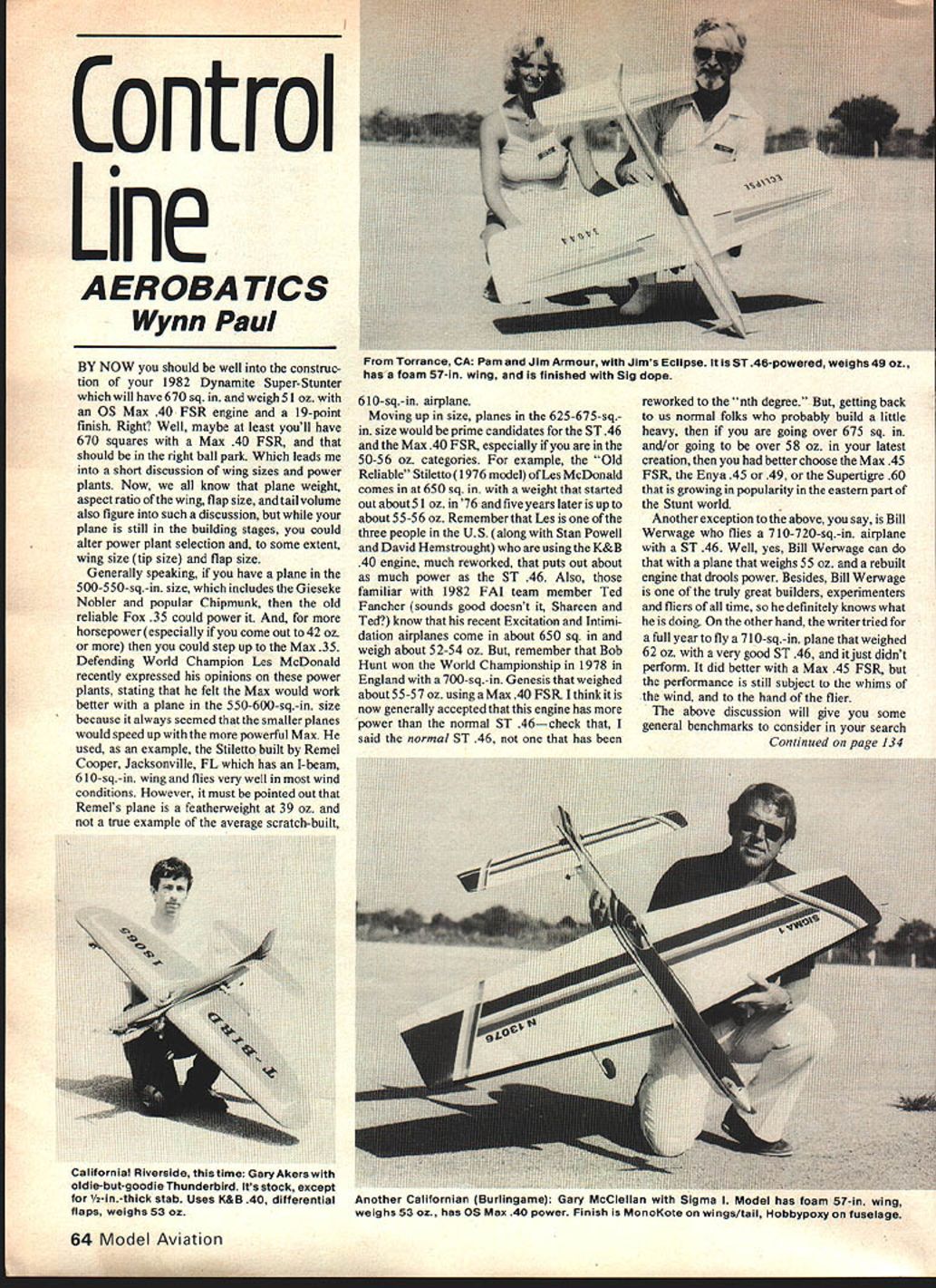 Control Line AEROBA TICS Wynn Paul BY NOW should well construc tion 1982 Dynamite Super-Stunter will have 670 sq weigh 51 oz OS Max 40 FSR engine 19-point finish Right Well maybe least youll have 670 squares Max 40 FSR should right ballpark Which leads short discussion wing sizes power plants Now know plane weight aspect ratio wing flap size tail volume also figure such discussion plane still building stages could alter power plant selection some extent wing size tip size flap size Generally speaking have plane 500-550-sq-in size includes Gieseke Nobler popular Chipmunk old reliable Fox 35 could power horsepower especially come out 42 oz could step up Max 35 Defending World Champion Les McDonald recently expressed opinions power plants stating felt Max would work better plane 550-600-sq-in size because always seemed smaller planes would speed up powerful Max used example Stiletto built Remel Cooper Jacksonville FL has I-beam 61 0-sq-in wing flies very well wind conditions However must pointed out Remels plane featherweight 39 oz true example average scratch-built 6 10-sq-in airplane Moving up size planes 625-675-sqin size would prime candidates ST 46 Max 40 FSR especially 50-56 oz categories example Old Reliable Stiletto 1976 model Les McDonald comes 650 sq weight started out about 51 oz 76 five years later up about 55-5 6 oz Remember Les three people US along Stan Powell David Hemstrought using K&B 40 engine much reworked puts out about much power ST 46 Also familiar 1982 FAI team member Ted Fancher sounds good doesnt Shareen Ted know recent Excitation Intimi dation airplanes come about 650 sq weigh about 5 2-54 oz remember Bob Hunt won World Championship 1978 England 700-sq-in Genesis weighed about 55-57 oz using Max 40 FSR think now generally accepted engine has power normal ST 46check said normal ST 46 has reworked nth degree getting back us normal folks probably build little heavy going over 675 sq and/or going over 58 oz latest creation better choose Max 45 FSR Enya 45 49 Supertigre 60 growing popularity eastern part Stunt world Another exception above say Bill Werwage flies 710-720-sq-in airplane ST 46 Well yes Bill Werwage can plane weighs 55 oz rebuilt engine drools power Besides Bill Werwage truly great builders experimenters fliers time definitely knows what doing other hand writer tried full year fly 71 0-sq-in plane weighed 62 oz very good ST 46 just didnt perform did better Max 45 FSR performance still subject whims wind hand flier above discussion will give some general benchmarks consider search Continued page 134 64 Model Aviation Prom Torrance CA Pam Jim Armour Jims Eclipse ST 46-powered weighs 4902 has foam 57-in wing finished Sig dope California Riveraide mis time Gary ~ers wimn oldie-but-goodie Thunderbird Its stock except 1/2-in-thick stab Uses K&B 40 differential flaps weighs 53 02 Another Californian Burlingame Gary McClellan Sigma Model has foam 57-in wing weighs 53 oz has OS Max 40 power Finish MonoKote wings/tail l4obbypoxy fuselage P1*11W SCALE MODELS MUSTANG MILES M-18ZERO DRUINEPIETENPOL COUGARPIPER CUB GIPSY MOTHANDRESON GANAGOBIELACEY M-10 Rubber Powered Balsa end TIssue Kite $595 SPORT MODELS PRAIRIE BIRD KIT $595 BABY ACE$649 ONE NITE 28$695 ONE NITE 16$595 STRINGLESS WONDER$495 PECK ROG$195 RUBBER OR CO-2 POWERED BUIWINO NEEDS PROPS TISSUE RUBBER WINDERS BLADE SHARPEHERS BEARINGS PROP SHAFTS LUBE WASHERS WHEELS FUSE CO-2 MOTORS BOOKS PLANS end MORE ADVENTURE MODELS 92 PONY BLIMP il-FT RIC AIRSHIP 00--~KIT $24950 COMPLETE CATALOG $100 HARD TO FIND ITEMS FOR RUBBER MODELS AND AIRSHIPS Peck-P * 1/3 Stand Off Scale * 92 Wingspan 1510 sq * Weight 19 21 lbs * Fiberglass Cowl Balsa Fuselage * Foam Wing Tail Section * Superior Landing Gear * For Kioritz Quadra etc * Cut Parts Sanded Shape * Full Size Rolled Plans P 0 BOX 2496-MA LA MESA CALIF 92041 PHONE 714 469-6675 714 442-4036 2 PRICE $20995 cttj Fcciic Stcr PO Box 607 So Gallatin Road Madison_TN 37115 868-6811 Sales ice Complete line ROYAL Electronics RIC equipment WARRANTY repairs thing sell Call Ed Venus Brannan Repair Service HO DRY 10 DRY EK LOG ICTROL FUTABA HOBBY SHACK ROYAL pressure $150 per foot molded nylon fuel pinch-off device three $150 very neat Deirin clamploc control horn infinitely adjustable price $175 Send inquiry Hoffelt Group Aerosport PO Box 99774 San Diego CA 92109 Im really cottage industry has sprung up around modeling community Dicks Bobs cases big manufacturers love because use two tanks make can help guys out sending selfaddressed-stamped envelope SASE ask ing information use large legal-sized Ill testing both tanks Buckeye Regionals month well some other pro ducts hope dont crash set carpet fire like certain Chicago area group did last year certainly hope Nats Executive Com mittee decides have first-round-losers bracket Lincoln Nats Combat events such used FAI Combat matter decided time issue MA printed Last year Nats lot us got fly Fast Combat match least wasnt alone thats enough Combat after traveling way anyone else makes specialty parts would like some column space please send whatever have cant say something nice about item wont say anything Charlie Johnson 3716 Ingraham St San Diego CA 92109 CL Aerobatics/Paul Continued page 64 flyable plane what have work terms wing power plant Miscellaneous information late Bob Hunt recently called report fathers Genesis muffler production still going strong mufflers now sand-blasted very pleasing finish mufflers available Jim Hunt JH Design Sales Co P0 Box 599 Saddle Brook NJ 07662-0599 cost $1500 plus $200 postage packing Bob also noted another engine might very suitable Stunt Enya 40X side-exhaust Schnuerle-ported flat ring Some NJ-NY Stunt clan going try out some information should available after snow season over addition Bob has experimenting some carbon fiber tape Dave Brown pro ducts Possible uses construction Ibeam spars front end Stunter 134 Model Aviation THE PEANUT-PEOPLE PRESENT OUTSTANDING BIG SCALE AEROBATICS THE BEST IN GI