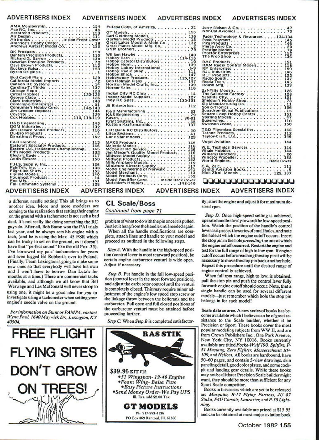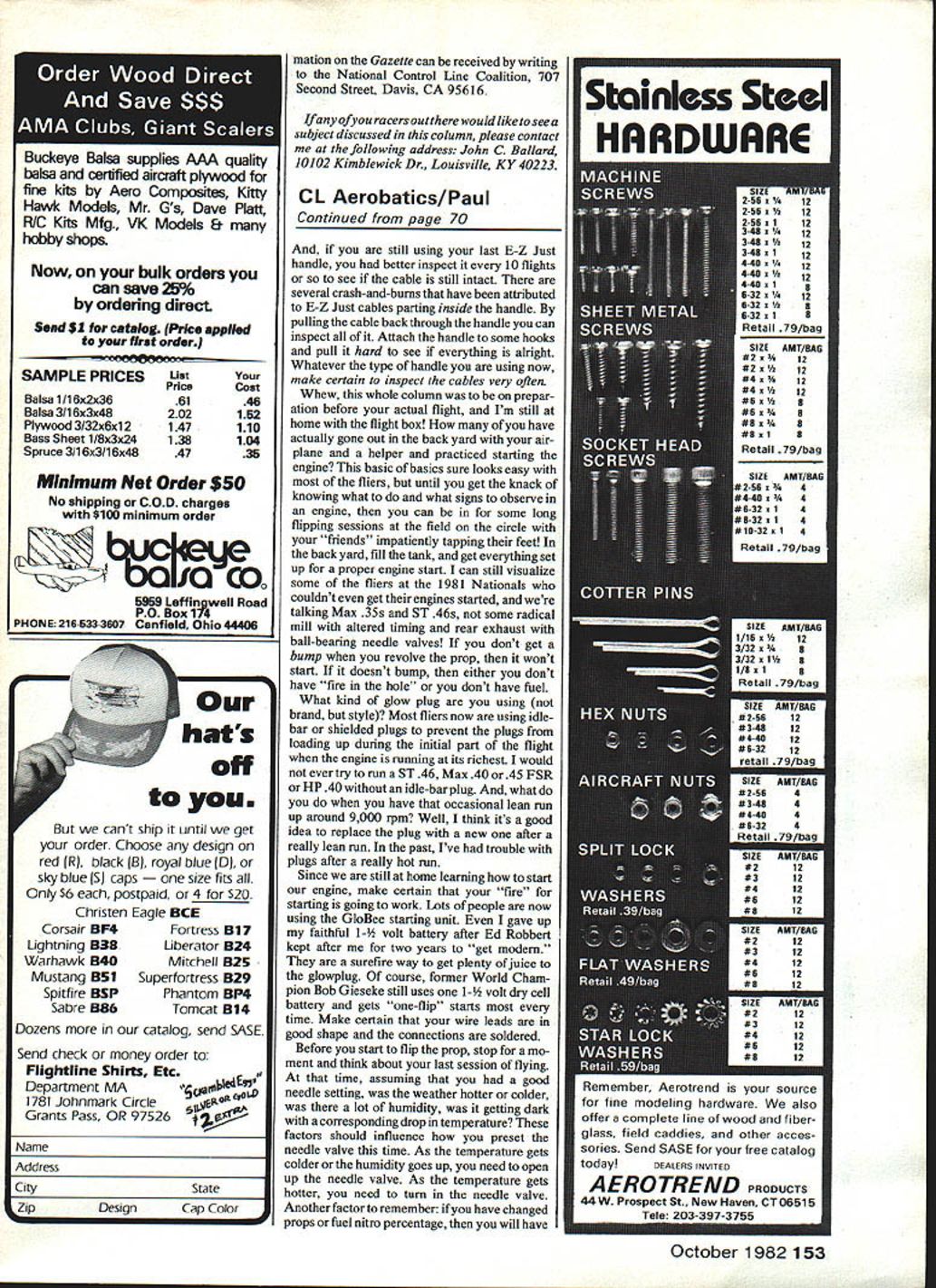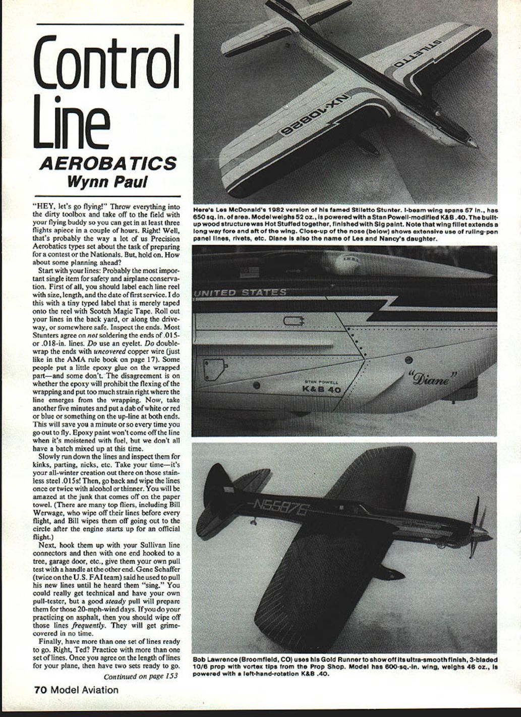 Control Line AEROBA TICS Wynn Paul HEY lets go flying Throw everything dirty toolbox take off field flying buddy can get least three flights apiece couple hours Right Well thats probably way lot us Precision Aerobatics types set about task preparing contest Nationals hold about some planning ahead Start lines Probably impor tant single item safety airplane conserva tion First should label line reel size length date first service tiny typed label merely taped onto reel Scotch Magic Tape Roll out lines back yard along drive way somewhere safe Inspect ends Most Stunters agree soldering ends 015or 018-in lines use eyelet doublewrap ends uncovered copper wire just like AMA rule book page 17 Some people put little epoxy glue wrapped partand some dont disagreement whether epoxy will prohibit flexing wrapping put too much strain right line emerges wrapping Now take another five minutes put dab white red blue something up-line both ends will save minute time go out fly Epoxy paint wont come off line its moistened fuel dont have batch mixed up time Slowly run down lines inspect kinks parting nicks etc Take timeits all-winter creation out stain less steel 015s go back wipe lines once twice alcohol thinner will amazed junk comes off paper towel top fliers including Bill Werwage wipe off lines before flight Bill wipes off going out circle after engine starts up official flight Next hook up Sullivan line connectors end hooked tree garage door etc give own pull test handle other end Gene Schaffer twice US FAL team said used pull new lines until heard sing could really get technical have own pull-tester good steady pull will prepare 20-mph-wind days practicing asphalt should wipe off lines frequently will get grimecovered no time Finally have set lines ready go Right Ted Practice set lines Once agree length lines plane have two sets ready go Continued page 153 70 Model Aviation Heres Los McDonalds 1982 version famed Stiletto Stuntur 1-usam wing spans i nsa 650 sq area Model weighs 52 oz powered Stan Powell-modified K&B 40 builtup wood structure Hot Stuffed together finished Sig paint Note wing fillet extends long way fore aft wing Close-up nose below shows extensive use ruling-pen panel lines rivets etc Diane also name Lea Nancys dauahter Dog Lawrence InroomTleua ioj uses nis uoIa uiunner snow OTT Its ultra-smooth finish 3-biaded 10/6 prop vortex tips Prop Shop Model has 600-sq-ln wing weighs 46 oz powered left-hand-rotation K&B 40 Buckeye Balsa supplies AAA quality balsa certified aircraft plywood line kits Aero Composites Kitty Hawk Models Mr Gs Dave Platt RIC Kits Mfg VK Models & hobby shops Now bulk orders can save 25% ordering direct Send $1 catalog PrIce applied first order SAMPLE PRICES Balsa ill 6x2x36 Balsa 3116x3x48 Plywood 3132x6x1 2 Bass Sheet 1 18x3x24 Spruce 3/1 6x311 6x48 List Price 61 202 147 138 47 cost 46 152 110 104 35 Minimum Net Order $50 No shipping COD charges $100 minimum order N 5969 Left well Road PO Box 174 canfield Ohio 44406 hats off cant ship until get order Choose design red R black B royal blue DI sky blueS caps fits Only S6 postpaid 4 S20 Christen Eagle BCE Corsair BF4Fortress B17 Lightning 638Liberator B24 Warhawk B40Mitchell 625 Mustang B51Superfortress B29 Spitfire BSPPhantom BP4 Sabre 686Tomcat B14 Dozens catalog send SASE Send check money order Flightline Shirts Etc Department MA 1781 Johnmark Circle Grants Pass OR 97526 Name Address lJefZA CL Aerobatics/Paul Continued page 70 still using last E-Z Just handle better inspect 10 flights see cable still intact several crash-and-burns have attributed E-Z Just cables parting inside handle pulling cable back through handle can inspect Attach handle some hooks pull hard see everything alright Whatever type handle using now make certain inspect cables very often Whew whole column prepar ation before actual flight Im still home flight box have actually gone Out back yard air plane helper practiced starting engine basic basics sure looks easy fliers until get knack knowing what what signs observe engine can some long flipping sessions field circle friends impatiently tapping feet back yard fill tank get everything set up proper engine start can still visualize some fliers 1981 Nationals couldnt get engines started talking Max 35s ST 46s some radical mill altered timing rear exhaust ball-bearing needle valves dont get bump revolve prop wont start doesnt bump either dont have fire hole dont have fuel What kind glow plug using brand style Most fliers now using idlebar shielded plugs prevent plugs loading up during initial part flight engine running its richest would ever try run ST 46 Max 40 45 FSR HP 40 idle-bar plug what you have occasional lean run up around 9000 rpm Well think its good idea replace plug new after really lean run past Ive trouble plugs after really hot run Since still home learning start engine make certain fire starting going work Lots people now using GloBee starting unit gave up faithful l-4z volt battery after Ed Robbert kept after two years get modern surefire way get plenty juice glowplug course former World Cham pion Bob Gieseke still uses - volt dry cell battery gets one-flip starts time Make certain wire leads good shape connections soldered Before start flip prop stop mo ment think about last session flying time assuming good needle setting weather hotter colder lot humidity getting dark corresponding drop temperature factors should influence preset needle valve time As temperature gets colder humidity goes up need open up needle valve As temperature gets hotter need turn needle valve Another factor remember have changed props fuel nitro percentage will have SIZE IllS x A12 i/32x6 1132x 1I 1/axia Retail 79/bag SIZE AMY/BAG *2-56 12 #3-4812 #4-4012 #6-3212 retail 79/bag SIZE AMY/BAG #2-564 #3-464 #4-404 *6-32 4 Retail 79/bag SIZE AMY/BAG #212 #312 #412 #612 #a12 SIZE AMY/BAG #212 #312 #412 #612 #612 SIZE AMT/BAG #212 #312 #412 #612 #612 Remember Aerotrend source fine modeling hardware also offer comp
