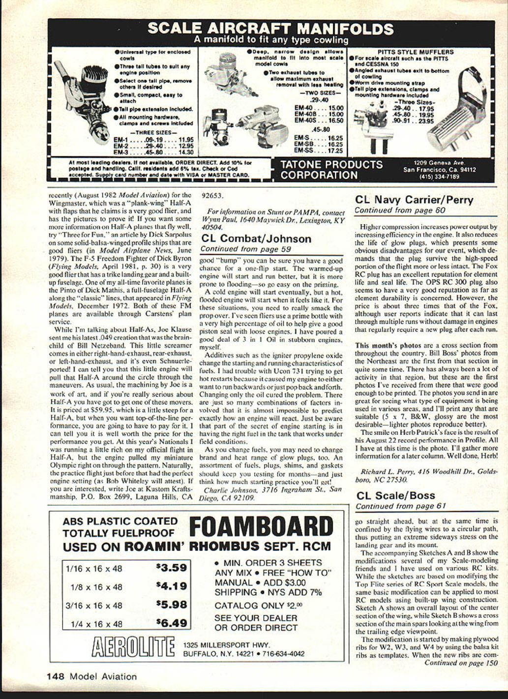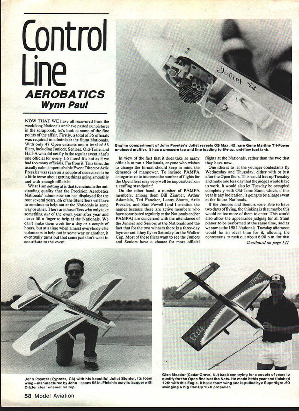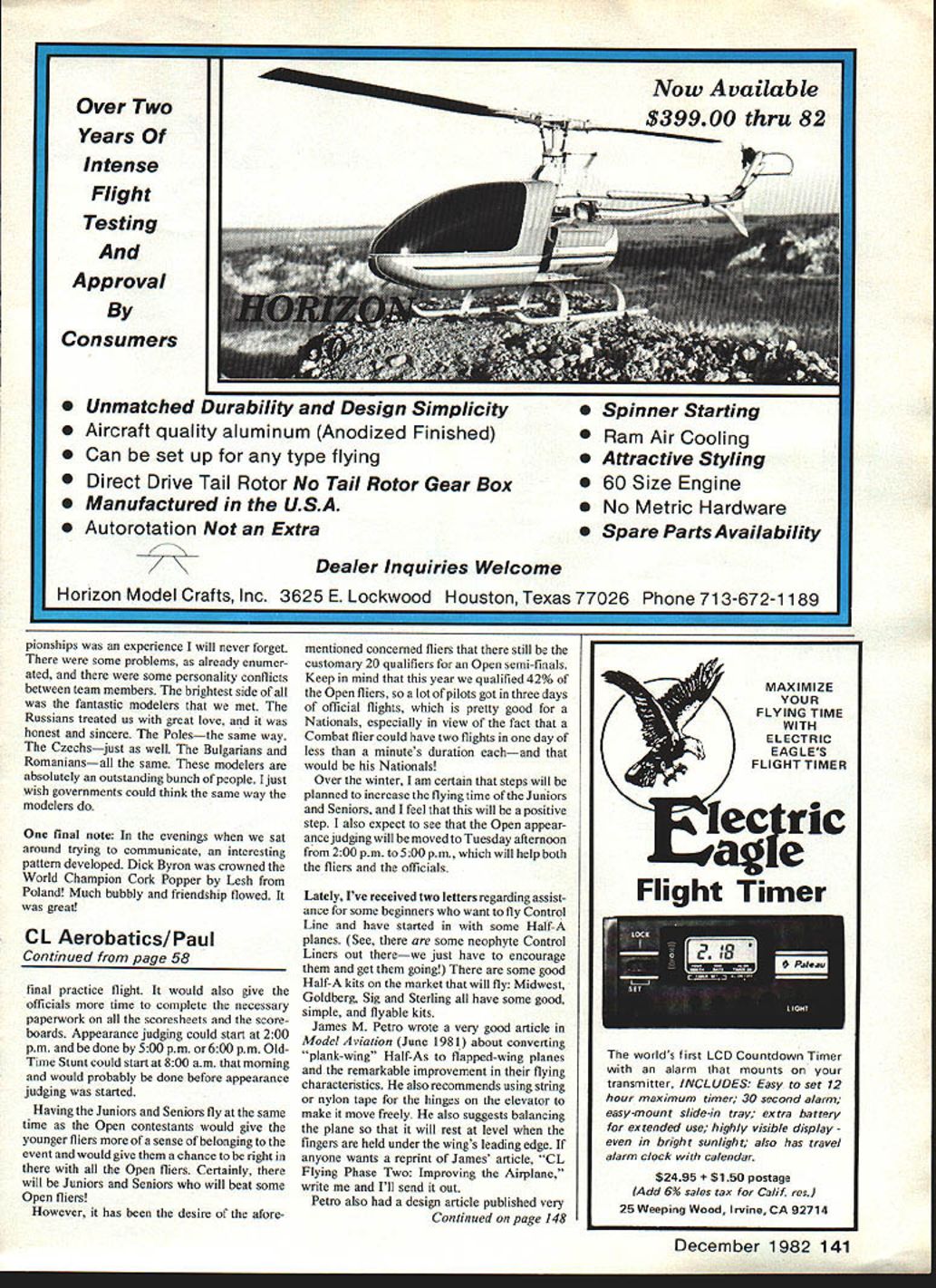 Control Line AEROBA TICS Wynn Paul NOW THAT WE have recovered week-long Nationals have pasted pictures scrapbook lets look some fine points affair Firstly total 35 officials required administer Stunt Nationals 47 Open entrants total 56 fliers including Juniors Seniors Old-Time Half-A did fly regular event thats official 16 fliers Its too officials Far time usually calm imperturbable Event Director Arlie Preszler seen couple occasions little tense about getting things going smoothly enough officials What am getting maintain out standing quality Precision Aerobatics Nationals administration has displayed past several years Stunt fliers will have continue help out Nationals some way other fliers take something out event year after year never lift finger help Nationals cant make work day couple hours time almost everybody else volunteers help out some way another eventually turns Out some just dont want contribute event view fact does take officials run Nationals anyone wishes change format should keep mind demands manpower include PAMPA categories increase number flights Open fliers may very well impossible staffing standpoint other hand number PAMPA members among Bill Zimmer Arthur Adamisin Ted Fancher Lanny Shorts Arlie Preszler Stan Powell mention names because active members have contributed regularly Nationals and/or PAMPA concerned attendance Juniors Seniors Nationals fact two winners three-day layover until fly Saturday Walker Cup Most fliers want see Juniors Seniors have chance official flights Nationals rather two have now idea let younger contestants fly Wednesday Thursday either just after Open fliers would free up Tuesday make less day thejudges would have work would also let Tuesday occupied completely Old-Time Stunt year indication going large event future Nationals Juniors Seniors able have two days flying thinking maybe would entice enter would also allow appearance judging Stunt planes performed same time saw atthe 1982 Nationals Tuesday afternoon would ideal time allowing contestants rush out about 600 pm Continued page 141 58 Model Aviation L Engine compartment John Poynters Juliet reveals OS Max 45 rare Gene Martine Tn-Power enclosed muffler has pressure tap line leading 61/4-oz uni-flow fuel tank John Poynter Cypress CA beautiful Juliet Stunter Its foam wingmanufactured byJohnspans 58 Finish isacrylic lacquerwith Ditzler clear enamel top Glen Meador Cedar Grove NJ has trying couple years qualify Open finals Nats made year finishad 12th Eagle has foam wing pulled Supertigre 60 swinging big Rev-Up 13-6 propeller Unmatched Durability Design Simplicity Aircraft quality aluminum Anodized Finished Can set up type flying Direct Drive Tail Rotor No Tail Rotor Gear Box Manufactured USA Autorotation Extra pionships experience will never forget some problems already enumer ated some personality conflicts between team members brightest side fantastic modelers met Russians treated us great love honest sincere Polesthe same way Czechsjust well Bulgarians Romaniansall same modelers absolutely outstanding bunch people Ijust wish governments could think same way modelers final note evenings sat around trying communicate interesting pattern developed Dick Byron crowned World Champion Cork Popper Lesh Poland Much bubbly friendship flowed great CL Aerobatics/Paul Continued page 58 final practice flight would also give officials time complete necessary paperwork scoresheets score boards Appearance judging could start 200 pm done 500 pm 600 pm OldTime Stunt could start 800 am morning would probably done before appearance judging started Having Juniors Seniors fly same time Open contestants would give younger fliers sense belonging event would give chance right Open fliers Certainly will Juniors Seniors will beat some Open fliers However has desire afore mentioned concerned fliers still customary 20 qualifiers Open semi-finals Keep mind year qualified 42% Open fliers lot pilots got three days official flights pretty good Nationals especially view fact Combat flier could have two flights day less minutes duration eachand would Nationals Over winter am certain steps will planned increase flying time Juniors Seniors feel will positive step also expect see Open appear ance judging will moved Tuesday afternoon 200 pm 500 pm will help both fliers officials Lately Ive received two letters regarding assist ance some beginners want fly Control Line have started some Half-A planes See some neophyte Control Liners out therewe just have encourage get going some good Half-A kits market will fly Midwest Goldberg Sig Sterling have some good simple flyable kits James M Petro wrote very good article Model Aviation June 1981 about converting plank-wing Half-As flapped-wing planes remarkable improvement flying characteristics also recommends using string nylon tape hinges elevator make move freely also suggests balancing plane will rest level fingers held under wings leading edge anyone wants reprint James article CL Flying Phase Two Improving Airplane write Ill send out Petro also design article published very Continued page 148 S Ram Air Cooling Attractive Styling 60 Size Engine No Metric Hardware Spare Parts Availability December 1982 141 Now Available thru 82 Spinner Starting Over Two Years tense Flight Testing Approval Consumers Dealer Inquiries Welcome Horizon Model Crafts Inc 3625 E Lockwood Houston Texas 77026 Phone 713-672-1189 U MAXIMIZE YOUR FLYING TIME WITH ELECTRIC EAGLES FLIGHT TIMER Flight Timer $2495 postage Add 6% sales tax Calif res 25 Weeping Wood Irvine CA 92714 worlds tirst LCD Countdown Timer alarm mounts transmitter INCLUDES Easy set 12 hour maximum timer 30 second alarm easy-mount slide-in tray extra battery extended use highly visible display bright sunlight also has travel alarm clock calendar leading dealers availebie ORDER DIRECT Add 10% Lpostage handling Calif residents add 6% tax Check oi Cod accepted Supply card number date VISA MASTER CARD m m recently August 1982 ModelAujation W
