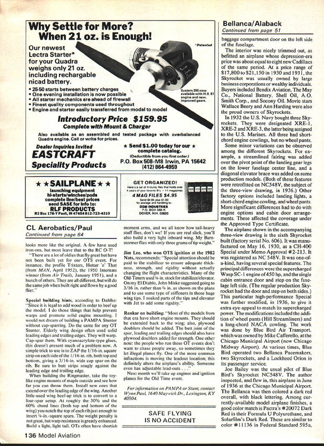 Control Line AEROBA TICS Wynn Paul OLD TIME STUNT popular 1982 Nationals outdrew Senior Junior Stunt combined CL FAI Team Race RC Heli copter among others Consequently thought should look some planes engines popular winning sent Out questionnaires some OTS devotees including John Miske Doug Dahlke Jim Lee Jim Renkar kind enough write backsome great length very informative first request name three good planes Glow-OTS John Miske replied 195152 pattern easy enough multitude designs list Garden State Circle Burners list OTSplanes eligiblesend $100 John 415 Clifton Bled Clifton NJ 07013 WP personal favorite Barn stormer Lou Andrews design although Ive won lot hardware Curtiss Swift El Diablo featured MAN March 1952 p 11 real hot number American Sr sure has winner too light Galloping Comedian Air Trails May 1952 flies just like El Diablo Add Sterling Ringmaster 1st Kit No S-l still available also won OTS last two Nats See what mean depends good flier John has plans OTS planes available contact him further information Continuing John says ships mentioned above popular around New Jersey dont have flaps As may know nonflappers get 20-point bonus did get greatest variety designs competition works Sterling Ringmaster S-l Yak Mustang still available kit form dealers El Diablo plans available ModelAirplane News American Senior other deBolt plans also available Fran Ptaszkiewicz 23 Marlee Drive Tona wanda NY 14150 Doug Dahlke has say plane selection prefer Barnstormer has 470 sq wing full fuselage swept-forward trailing edge flies well 23- 35 engine Easy profile design Frank Ehling good Air Trails Annual 1952 highaspect wing longish aft moment arm constantchord wing has various sizes Plans Easy can obtained John Miske Doug also recommends faithful old Ringmaster Dahlke also talks about flapped planes course first choice original Nobler means have build plans thats really bad will have sub stantially alter Gieseke Nobler kit make fit George Aldrichs articles Nobler May June 1952 Model Airplane News Miske has original plans Dahlke continues second choice Smoothie Veco kit version its pretty elliptical wing Bob Palmer design available Miske Another choice flaps Chief Veco version first model nice wing good moment arms youll get first look genuine pollywog airfoil Miske plans available Jim Renkar Justice IL another 1982 Nats OTS competitor suggests Another good plane Wee Duper Zilch MAN April 1951 also like Go-Devil well good old Ringmaster have noticed above planes 29-3 size engines about 40-in wing think size plane less complicated build easier haul car PAMPA Stunter Miske has following comments building Old Timers main thing beefing up changing outside dimensions Some designs need lot others dont advocate complete structural redesign whats needed add some strength adjustability instance need longer stronger engine mounts plywood doublers perhaps full-depth spar center section sheeting some stronger control system mountings Curtiss Swift example design really needs beef-up original didnt have leading edge just glue joint top bottom sheeting met also like build trim tabs nonflappers gives something tweak get er straight s comment What would Eastern-area Stunt fliers mething tweakprobabhgo intoRC Adjust able lead-outs tip weight box always necessary nice need real purist could always cover up adjustable stuff once trim Foam wings etc no-no Coverings up individual prefer colored silkspan silk clear finish 64 Model Aviation jonn Pond brought Dragon JC MadmanI Yates design San Jose CAto 1982 Nationals Power Orwick 64 ignition engine Its about 1946 design Continued page 136 1eres reaiy Old-Time about 1945-46 have Megow Competitor powered Lucas Smith Bunch Contestorl 60 ignition engine Kit design Matt Kania Settle 21 oz Enough newest Lectra Starter* Quadra weighs 21 oz including rechargable nicad battery 25-50 starts between battery charges evening installation now possible starter mechanics ahead firewall Finest quality components used throughout Engine starter easily transferred model model Also available assembled tested package overbalanced Quadra engine Call write prices Dealer InquirIes Invited EAS TCRAFT Speciality Products * SendSlOOtedaylereur * complete catalog Deductible first order PO Box 508-tM8 Irwin PA 15642 412 864-4959 * *SAILPLANE* *HereGETORGANlZEDloVe launching equIpment4 years yoor t4oO,te 8 11 nlagaZfleS hl-startIwlncheIpeds 4 MAG FILES $495 cemplete Ilnelbest prices send $495 p1w $1 00 send SASE fer Infe te RLF PRODUCTS P0 BOX 388-K ff3 Box 175-Y Pacil IN 47414 512-723-4310 OVER NH 03820 CL Aerobatics/Paul Continued page 64 looks like original few have used Iron-ons leave RC O-T lot oldies fly great have built yet 015 event instance profile Trixters Hotter n MAN April 1952 1950 Internats winner Air Trails January 1951 bunch others different butwilldo same job built right flown good flier Special building hints according Dahlke Since legal add wood order beef up model things help prevent warps promote solid engine mounting would dream building PAMPA Stunter cap-sparring same 01 Stunter Elderly wing design often used solid leading edges trailing edges will warp Cap-spar cyanoacrylate-type glues doesnt present much problem now simple trick use ZAP 1/16-in square strip side 1 / 16-in rib both top bottom giving 3/16-in wide cap spar rib sure butt strips snugly against leading edge trailing edge building Ringmaster take toylike engine mounts maple outside see far can throw Install new ones extend over leading edge wing Another little-used wing beef-up trick convert four-spar setup roughly 30% 60% chord lines both top bottom wing notch top rib just enough insert Vs-in-square spars weight penalty great warp resistance greatly enhanced Build light light tail OTs often have shortish moment arms know tail-heavy stuff flies dont real slick youll also build very light inboard wing Barn stormer flies three grams tip weight Jim Lee won OTS ignition 1982 Nats recommends Special attention should paid st