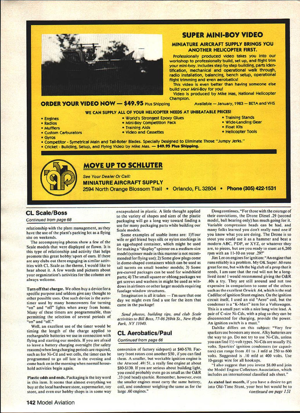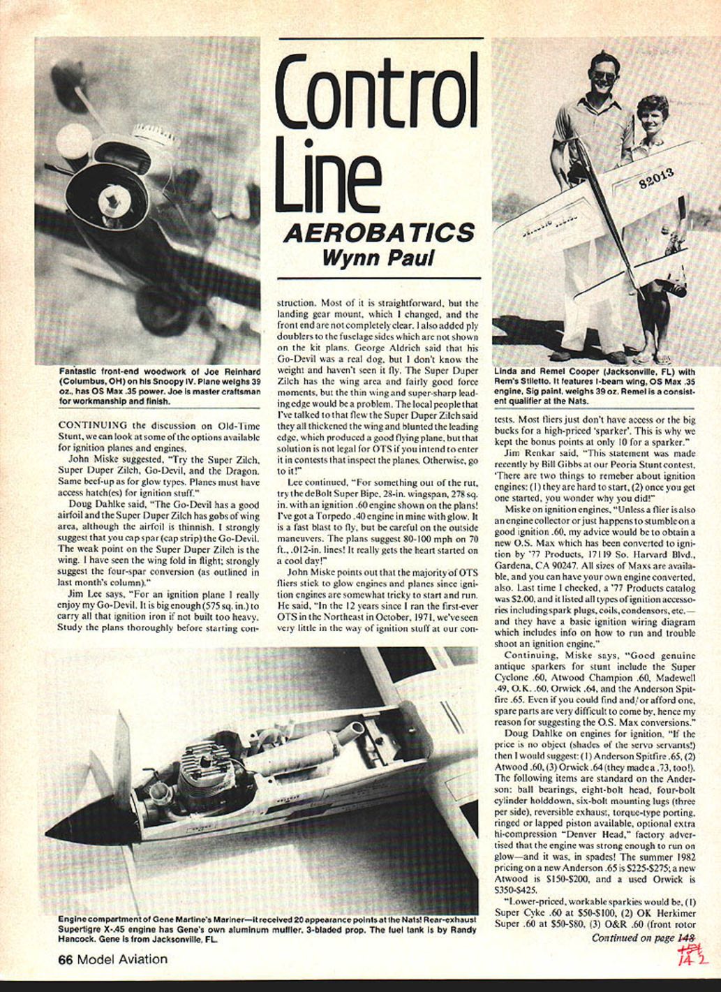 CONTINUING discussion Old-Time Stunt can look some options available ignition planes engines John Miske suggested Try Super Zilch Super Duper Zilch Go-Devil Dragon Same beef-up glow types Planes must have access hatches ignition stuff Doug Dahlke said Go-Devil has good airfoil Super Duper Zilch has gobs wing area although airfoil thinnish strongly suggest cap spar cap strip Go-Devil weak point Super Duper Zilch wing have seen wing fold flight strongly suggest four-spar conversion outlined last months column Jim Lee says ignition plane really enjoy Go-Devil big enough 575 sq carry ignition iron built too heavy Study plans thoroughly before starting conControl Line AEROBA TICS Wynn Paul struction Most straightforward landing gear mount changed front end completely clear also added ply doublers fuselage sides shown kit plans George Aldrich said Go-Devil real dog dont know weight havent seen fly Super Duper Zilch has wing area fairly good force moments thin wing super-sharp lead ing edge would problem local people Ive talked flew Super Duper Zilch said thickened wing blunted leading edge produced good flying plane solution legal OTS intend enter contests inspect planes Otherwise go Lee continued something Out rut try deBolt Super Bipe 28-in wingspan 278 sq ignition 60 engine shown plans Ive got Torpedo 40 engine glow fast blast fly careful outside maneuvers plans suggest 80-100 mph 70 ft 0 12-in lines really gets heart started cool day John Miske points out majority OTS fliers stick glow engines planes since igni tion engines somewhat tricky start run said 12 years since ran first-ever OTS Northeast October 1971 weve seen very little way ignition stuff contests Most fliers just dont have access big bucks high-priced sparker kept bonus points 10 sparker Jim Renkar said statement made recently Bill Gibbs Peoria Stunt contest two things remeber about ignition engines hard start 2 once get started wonder did Miske ignition engines Unless flier also engine collector orjust happens stumble good ignition 60 advice would obtain new OS Max has converted igni tion 77 Products 17119 So Harvard Blvd Gardena CA 90247 sizes Maxs availa ble can have own engine converted also Last time checked 77 Products catalog $200 listed types ignition accesso ries including spark plugs coils condensors etc have basic ignition wiring diagram includes info run trouble shoot ignition engine Continuing Miske says Good genuine antique sparkers stunt include Super Cyclone 60 Atwood Champion 60 Madewell 49 OK 60 Orwick 64 Anderson Spit fire 65 could find and/or afford spare parts very difficult come hence reason suggesting OS Max conversions Doug Dahlke engines ignition price no object shades servo servants would suggest Anderson Spitfire 65 2 Atwood 60 3 Orwick 64 made 73 too following items standard Ander son ball bearings eight-bolt head four-bolt cylinder holddown six-bolt mounting lugs three per side reversible exhaust torque-type porting ringed lapped piston available optional extra hi-compression Denver Head factory adver tised engine strong enough run glowand spades summer 1982 pricing new Anderson 65 $225-$275 new Atwood $1 50-$200 used Orwick $350-$425 Lower-priced workable sparkies would Super Cyke 60 $50-$l00 2 OK Herkimer Super 60 $50-$80 3 O&R 60 front rotor Continued page 14& 66 Model Aviation antastic front-end woodwOrK Joe Reinhard Columbus OH Snoopy IV Plane weighs 39 oz has OS Max 35 power Joe master craftsman workmanship finish Cooper Jacksonville s stiletto features I-beam wing OS Max 35 engine Sig paint weighs 39 oz Remel isa consist ent qualifier Nats ompartment Gene Martines Marinerit received 20 appearance supertlgre X-45 engine has Genes own aluminum muffler 3-bladed prop fuel tank Handy Hancock Gene Jacksonville FL Continued page 68 relationship plant management have use plants parking lot flying site weekends accompanying photos show few Scale models displayed flown type relationship activity helps promote great hobby/sport clubs out engaging similar activ ities CL Scale theme would like hear about few words pictures about organizations activities column always welcome Turn off charger often buy device specific purpose seldom give thought other possible uses such device autotimer used homeowners turning off lights away home timers programmable thus permitting selection several periods off Well excellent use timer would timing length charge applied rechargeable batteries use connection flying starting models afraid leave battery charging overnight safety reasons long charging periods required such Ni-Cd wet cells timer can programmed go off late evening come back morning normal house hold activities begin again Plastic odds ends Packaging key word item seems almost everything buy local hardware store supermarket toy store hobby shops some way encapsulated plastic little thought applied variety shapes sizes plastic packaging will go long way toward finding use packaging parts building Scale models Some examples usable items lYour wife girl friend buys silk nylon stockings egg-shaped container might used making display spinner medium-size model spinner made manner recom mended flying use 2 Some glow plugs come dome-shaped containers can used tail turrets small bomber models 3 Some pre-curved packages can used windshield parts 4 small square oblong packages get screws washers might used win dows airliners other larger models requiring fuselage window structures Imagination takes ure day might find use item came package Send photos building tips club Scale activities Bill Boss 7 7-06 269th St. New Hyde Park NY 11040 CL Aerobatics/Paul Continued page 66 conversion factory sideport $40-$70 Fac tory front rotors cost another $50 find smaller workable ignition engine Atwood 49/51 really fine engine about $80-$ 130 serious about building light could probably go small O&R 33 red head sparkie Remember however smaller engines must carry same battery coil condenser weighing same large 60 engines Doug continues c