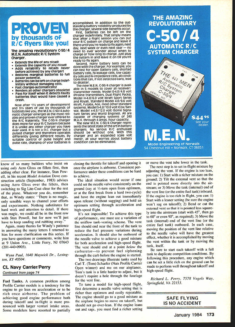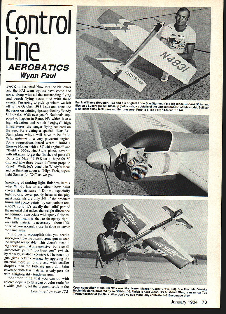 Control Line AEROBA TICS Wynn Paul BACK business Now Nationals FAI team tryouts have come gone along outstanding flying bench-flying associated events Im going pick up left off October 1983 issue conclude series painting tips supplied Windy Urtnowski next years Nationals sup posed happen Reno NV high elevation enjoys high temperatures hangar-flying centered need creating special Nats-84 Stunt plane will have light light lightwith very powerful engine Some suggestions heard Build Gieseke Nobler ST 46 engine Build 650-sq-in Stunt plane cover silkspan forget finish put ST 60 OS Max 45 FSR hope 50 oz take three dozen different props Reno Well lets conclude Windys ideas thinking about High-Tech superlight Stunter 84 go Speaking making light finishes heres what Windy has say about paint covers airframe Dopes especially light colors cover poorly because pig ment materials 5% product Imron epoxy paints comparison 40-50% solid Its usually solid part material makes weight difference commonly associate epoxy finishes What means epoxy right very little material necessaryabout 10% what normally use dope cover same area order accomplish need super-good touch-up paint spray gun keep weight reasonable doesnt mean big spray gun expensive small automobile paint touch-up gun way also expensive touch-up gun gives better coverage applying material uniformly smaller droplets full-size guns Paint coverage less material possible high-quality touch-up gun Another thing can colored dope let can color settle let pigment settle Continued page 172 January 1984 73 Frank Williams Houston TX original Lone Star Stunter Its big modelspans 58 flies Supertigre 60 Closeup below shows details unique front end model Sullivan 8-oz slant clunk tank uses muffler pressure Prop Top Flite 14-6 cut 12-6 Open competitor 83 Nats Mrs Karen Meador Cedar Grove NJ flaw Gieseke Nobler kit-plane powered OS Max 35 FInish Aero Gloss husband Glen annual Top Twenty finisher Nats dont see lady contestants Encourage CESS Perhaps need something bit out-of-the ordinary scale competition Cessna 182 big stable airplane ideal scale trainer 40 engine Put 60 under cowl fly circles around competition semi-symmetrical airfoil makes 182 groove yet its docile kitten total scale realism add optional flaps Trike gear pleasant ground handling kit all-balsa lots hardware molded parts speedy construction clear plans special illustrated construction booklet make kit anyone can build Kit features Span 72 Area 702 Sq 5-7 lbs flying weight 4 channel Power 40 60 182 265 NE 88rS ee Main Fo da3380 Teepoone935 436 WE NOW HAVE COMPLETE LINE OF BROWN TELCO DAVIS CO-2 ENGINES INCLUDING SPARE PARTS SERVICE BROWNTEl CO A-23 PEANUT$2995STANDARD TELCO$2495 cAMPuS BEE$3495TURBO 3095 $3293 cAMPuS TWIN$5995TURBO 9000$3995 SODA CHARGER$1295 02 CONVERSiON TO CO-2$3995 NEW C4TAIOG No 25- $150 DnAhiA.. PHONE 91914424938 UWbflUVyfIUT 91914999970 W BOX 2498-MALA MESA CA 92041 cost sheet belicranks control handles now available write L-R Prod ucts Ltd 77-87 Archdale Ave Detroit MI 48228 Bill Boss 77-06 269th St New Hyde Park NY 11040 CL Aerobatics/Paul Continued oaoe 73 bottom pour off 10% clear off top will make 10% increase solid coverage will improved ac cordingly Caution dont pour off 10% will risk improper adhesion paint surface Windy has say about fillets feel Aero Gloss doesnt go well over fillets because high-shrink product shrinks Sig Randolph both relatively low-shrink dopes Aero Gloss part nitrate dope does adhere well also shrinks lot best both worlds low-shrink nitrate like Randolph fillet technique use tape HalfA prop leave fillets relatively rough would done last step after talc-filler sanded sealed coat clear Next step would air-brushing inch oversprayfive coats auto primer allowed dry hour between coats would sanded-in No 400 paper after coats have dried over night Fine grade 00 steel wool excellent sanding-in fillets youd like try something new use glovesthose splin ters awful' Miscellaneous comments include Low shrink dopes work well Nobler Juno types airframes have large areas silkspan ribs underneath Ran dolph Products puts out some good literature regarding combinations dope products PO Box 67 Carlstadt New Jersey 07072 dopes also come tinted help get coat over large surfaces mean translucent tracer-color clear nitrate butyrate dopes products available tint tint clear crystalclear best spray gun Ive found spraying DeVilbis touch-up gun available places sell auto body supplies will cost about $100 use number two tip about 40 lb air pressure spray Imron about 50 lb pressure spray dope Thinner comes grades expensive called slow rich pen etrating thinner recommended except clean gun Fast non penetrating thinner what wantyou will use thinner mix will loosen paint spraying over DuPont 3608 S good fast thinner Fast thinner cheaper really works best airplanesand wont melt canopies found out hard way conclude basic facts about various types paint characteris tics Imron goes over anything use cheap est lacquer thinner available spray 50 lb let cure eight hours tack total 24 hours Sig Randolph dopes will go over auto primer 2 nitrate 3 Aero Gloss 4 other butyrates 5 acrylics use Randolph dope thinner Sig thinner spray 35-45 lb let dry four hours Randolph nitrate dope will go over bare wood Epoxolite use Randolph dope thinner Sig thinner brush thinned 50% solution let dry hour Aero Gloss suggested cover over Aero Gloss use Aero Gloss thinner spray 35-45 lb let dry four hours normally Acrylic lacquers will go over 1 auto primer 2 nitrate dopes 3 Aero Gloss dope 4 butyrate dopes use rich lacquer thin ner colors cheap thinner clear spray 50 lb let dry least hour Epoxy paints like Hobbypoxy generally will go over dope Imron acrylic paint use special Hobbypoxy thinner spray 50-60 lb let dry eight hours full day Generally speaking about item Windys discourse some modelers may take issue dislike using Aero Gloss clear fillets bare wood 172 Model Aviation INTRODUCING THE NEW FOX 29 BB