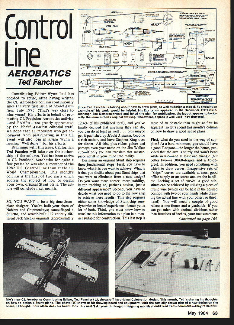Control Line AEROBA TICS Ted Fancher Contributing Editor Wynn Paul has deciled retire after having written ZL Aerobatics column continuously sinai very first issue Model via tiofl July 1975 Thats very close nine years efforts behalf pro mot ng CL Precision Aerobatics activity ai PAMPA greatly appreciated 1 Model Aviation editorial staff aope modelers get en joyitient participating CL evet will also join giving Wynn rouing Well done efforts Beginning issue Californian Ted Fancher will take over author ship column Ted has active CL Precision Aerobatics quite few years also member 198 US Control Line team CL Wor d Championships months cohlmn first two parts addiess subject design own original Stunt plane art icle vill conclude next month SO YOU WANT big-time Stunt plana designer Youve built share Nobers Chipmonkeys camouflaged Stilktto scratch-built 112 entirely dif feret t Jack Sheeks originals approximately Since Ted Fancher talking about draw plans well design model thought example work would helpful Excitation appeared December 1981 issue Although Joe Demarco traced inked plan publication layout appears ex actly same Teds original drawing available space well usednot cluttered 124% published total youve finally decided anything can can least well us maybe get published Model Aviation become rich author have Stephen King over dinner plus riches galore perhaps name Jim Walker cupif can translate master piece adrift mind reality Designing original Stunt ship requires three fundamental steps First have know what want achieve What dislike about past Stunt ships want eliminate new design want corner stability better tracking perhaps easiest just different appearance Second have decide what need to new ship achieve results step requires either some knowledge Stunt-ship aero dynamics lots experiencebetter yet lot both Third must know translate information plan man ner suitable construction last step obstacle might first apparent lets spend months column draw good set plans First what need way sup plies bare minimum should have good T-squarethe longer better pro vided arm sturdy wont bend useand least triangle better twoa 30/60-degree 45-de gree addition need something draw curves Inexpensive sets ships curves available good office supply art stores handi est Lacking set curves good sub stitute can achieved utilizing piece music wire can held desired position two hands draw ing actual line other third hand will need couple good rulers one-footer yardstick can get rulers decimal divisions rather fractions inches measurements Continued page 169 MA9 new CL Aerobatics Contributing Editor Ted Fancher LI shows off original Celebration design month Tea snaring thoughts 1ow design Stunt plane photo RI shows us drawing board equipment partiallydrawn plan new design boarl Thought often does board look neat Anyone thinking designing models should read Teds commentstheyre helpful May 1984 63 AOJSThdSV SO bTDSY SOAR fWSmTtnS545555 7F- -WINC PLAN 1T --A----Ae S1AA ELEV NII 4550 Technique pulling As other processes certain techniques give bet ter results Once blades properly mounted shims place pass parent strip under blades about foot excess sticking out Push cutting corners blades through rubber wedge Plexiglas Slide strippers movable guide over snugly against rub ber lock down Wedge piece balsa between stripper guide back plane keep rubber flat enters cutting area Anchor stripper solidly loca tion gives about six feet room Pull slowly steadily rubber back ing away stripper until rubber stretched least four feet After reel hand-over-hand still using uniform pull As rubber cuts should move smoothly through blades Make pre liminary cut about two feet long mea sure strips sure have setting like After can probably cut about 50 feet rubber before changing blades last rubber-cutting photos shows closeup rubber after has cut can see edges smooth no major width changes Keep good records Once have sup ply rubber cut will probably make up some motors sure label storage containers both long strips motor giving size source vintage rubber other factor need help decide piece use photo envelopes shows Stan Chil tons storage methodindividual envelopes marked rubber size weight length rating number testing motor really top fliers can come close reproducing good flights time after time keeping good records using formation set up prop/rubber combos new contest Bud Tenny PO Box 545 Richardson TX 75080 CL Aerobatics/Fancher Continued paqe 63 will compatible numbers hand calculator will greatly sim plify transferring airplane design numbers construction drawing items plus some paper pencil eraser youre business soon lady gets dinner dishes off drawing board Things nice have arent essential include drawing board own Mine standard unit office supply store simple metal tube frame board 36 as proven adequate size normal Stunt ship understand Windy Urtnowski has per mission use gym floor local recreation center after basketball practice drawings drafting machine ex tremely helpful rather expensive probably $100 qual ity So unless plan doing lot drawing might choose forego benefits might bor row Bill Fitzgeralds say jest have found lot nice-to-havebut-expensive items help make quality Stunt ships easier achieve can often made financially manageable splitting cost amongst several users Im talking about quality spray equipment drill presses gram scales etc Most such items used occasionally partner conflicts seldom arise ve some thought good compass essential drawing wheels arcs circular bellcranks use circular bellcranks dont set dividers makes repetitive measure ments easier simple protractor will allow accurate measurement several critical gles important successful design Specialty items round out col lection would include erasing mask thin steel template device protects parts drawing allowing areas im mediately adjacent to erased lettering guide make lettering neat uniform sure use minimum A-in height intend have drawing published bec