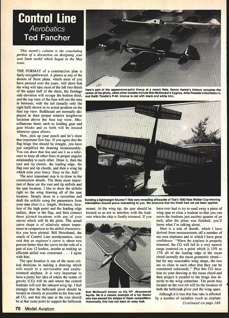 THE FORMAT construction plan fairly straightforward glance dozens Stunt plans have perused over years will show wing will take left two-thirds upper half sheet fuselage side elevation will occupy bottom third top view fuse will use area between tail usually right half shown its actual position fuse top view Bulkheads normally dis played proper relative lengthwise location above fuse top view Mis cellaneous items such landing gear gear blocks forth will located wherever space allows Now pick up pencil lets draw important first line agree flap hinge line should straight have just simplified drawing immeasurably can draw line use refer ence keep other lines proper angular relationship other Draw root tip chords leading edge flap root tip chords wing tip suits fancy Easy far huh next important step draw construction details three impor tant root tip airfoils spar location like draw airfoils right wing drawing aft spar location Simply draw centerline draft airfoils using parameters data sheet ie length thickness loca tion high point leading edge radius draw flap connect plotted locations curves will fit plots actual curve shape relatively minor impor tance comparison airfoil characteris tics have plotted Bill Netzeband oracle Control Line aerodynamics once said engineers curve about two percent better curve sole pair size 12 loafers insofar making efficient airfoil concerned ree him spar location crit ical decisions making drawing will result serviceable easilytrimmed airplane very important have pretty fair idea center gravity CG will control leadouts will exit inboard wing tip feel strongly bellcrank pivot should located closely possible fore-andaft CU spar root should same point support bellcrank mount wing tip spar should located interfere leadouts ship finally trimmed 70 Model Aviation have ever try sand away piece wing spar clear leadout can move leadouts just another quarter inch after plane finished youll know what Im talking about rule thumb have derived measurements off number own airplanes have great confidence airplane properly trimmed CU will fall very narrow range centered point 15% 17% aft leading edge mean chord actually mean geometric chord reasonable wing shape two close other can considered colocated Plot CU loca tion drawing mean chord project parallel hinge line di rectly wing centerline point thus located root rib will location both bellcrank pivot wing spars Although true line rake affected number variables such airplane Continued page 166 months column concluding portion discussion designing own Stunt model began May issue Hems part appearance-point lineup recent Nate Denny Harkaia Uranua occupies center photo other models Include Bob McDonalds Cygnus Arlie Preaziers Excitation II Keith Trostles P40 Uranus red black white trim Building lightweight Stunter Thia very revealing silhouette Teds 1982 Nate Walker Cup-winning intimidation should prove interesting presume finish yet applied Bob McDonald shows us HP 40-powered Aquila ciasaic example top Senior has earned stripes Open competition Historically has easy task THIS FUEL FEATURES ORUST PREVENTION AGENTS ODETERGENTS SLUBRICAllON WITH HIGH FLASH POINTS WETTING AGENTS FOR MORE EFFICIENT AND DEPENDABLE FUEL FLOW eANTI-FOAMING AGENTS TO PREVENT LEAN RUNS KEEPS YOUR ENGINE RUNNING COOL OAN ODORLESS HIGHLY REFINED FUEL CHILDPROOF LIDS Available FAI 5 10 15 25 & 40% Nitro-Methane Contents Formulated synthetic lubricants Also cNailade castor DEALERS WANTED DOMESTIC & OVERSEAS WE EXPORT This competition fuel fast becoming THE CHOICE vMh top protesionals first cash product Contact us price structures ordering information Manufacturers Major Brand Distributors Model Engines Kits Rodos Accessories SUPER K Fuels brand KINGS RADIO CONTROL HOBBIES INTERNATIONAL 3960 West 16 Ave HIalech Florida 33012 305 557-2024 can made example need firewall positioned 30 downthrust relative centerline fuselage will need set pointer 30 draw lines along pointer wire top gauge along top gauge pointer wire outward template can cut along two lines used guide mounting firewall Several other variations theme possible course depending upon imagination specific needs Hope fully small implements wiH help become accurate consequently bet ter builder model aircraft really what aboutmost time anyway CL Aerobatics/Fancher Continued page 70 speed weight line length diameter air density etc nonetheless true total affect will negligible remotely normal Stunt ship plane properly trimmed leadouts will exit wingtip point three degrees aft center gravity have just located bellcrank pivot plus minus less degree point spar should located tip rib Allow small amount fore aft adjustability pointbut Im willing bet youll end up both leadouts within / inch plotted location Now just draw wing tip choice construction details feel appropriate lets get fun stuffthe fuselage fuselage fun because best place let creativity run rampant Aside locating important pieces right places body like Spinners rudders cowls canopies grist creative mill Lest get carried away however start plotting following convenient horizontal refer ence line usually use top main fuse side spinner backplate 2 Wing leading edge 3 CG 4 Flap hinge line 5 Wing flap trailing edge 6 Stab leading edge 7 Elevator hinge line 8 Elevator trailing edge vertical reference line plot fol lowing locations Engine thrust line 2 Wing centerline Another hint Try keep thrust line wing centerline within 50% wing thickness other Since wing will primary source drag having large distance thrust line will create substantial pitch trim problems 3 Stab centerline 4 Wheel/ground contact point located vertically allow adequate ground clearance largest prop plan use horizontally located respect center gravity Now draw wing stab cutouts let yourself go Just remember anything draw youre going have figure way build reasonable weight last major component top fuselage stab/elevator ease drawing save room usually half top view shown Critical measu