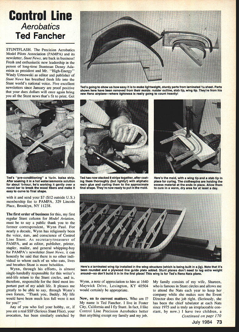 Control Line Aerobatics Ted Fancher STUNTFLASH Precision Aerobatics Model Pilots Association PAMPA its newsletter Stunt News back business Fresh enthusiastic new leadership person long-time Stuntman Denny Ada misin president Mr High-Energy Windy Urtnowski editor publisher Stunt News has breathed fresh life Stunt worlds national voice Five excellent newsletters since January proof positive dues dollars will once again bring Stunt news thats fit print Get send $7 $12 outside US membership fee PAMPA 329 Lincoln Place Brooklyn NY 11238 first order business first regular Stunt column Model Aviation must say public thank former correspondent Wynn Paul nearly decade Wynn has religiously voice ears conscience Control Line Stunt As secretary/treasurer PAMPA editor publisher printer stapler mailer general whipping-boy PAMPAs newsletter Stunt News can honestly said no other indi vidual us eats lives breathes Stunt beholden Wynn through efforts almost single-handedly responsible writers mid-life return Stunt circles therefore responsible third im portant part adult life pleases greatly able say through Wynns own forum Thank Buddy life would have much less full Any feel hobby real SSF Serious Stunt Flier avocation has similarly enriched Wynn note appreciation him 1640 Maywick Drive Lexington KY 40504 would certainly appropriate Now current matters am name Ted Fancher live Foster City California fly Stunt fact like Control Line Precision Aerobatics better anything except family job family consists wife Shareen famous Stunt circles allows attend Nats year keep company makes sure Event Director does job right Seriously has chief tabulator Nats since 1975 truly irreplaceable con stant now have two children Continued page 170 July 1984 73 Teds going show us easy make lightweight sturdy parts laminated 2 sheet Parts shown have removed molds rudder outline stab tip wing tip Theyre new Reno airplanewhere lightness really going count heavily Teds pre-condltioning 1~a-ln balsa strip Ted has now stacked 8 strips together after coat- Heres mold wing tip stab tip After soaking hot water/ammonia solution lng thoroughly lightly aliphatic place curing clothespins holding about -hour hes working gently over resin glue curling approximate excess material ends place Allow round bar break wood fibers make final shape Theyre now ready put mold cure warm dry area least day easy curve final shape Heres laminated wing tip installed wing structure being built hg Note its rounded plywood line guide plate added Stunt planes dont need lug extra weight aroundso dont build first place wing Teds Reno Nats plane system operating 48 volts handle system operates satisfac torily using Sullivan lines 48 volts system does perform well using fishing leader using fishing leader lines 14-18 volts two nine-volt transistor batteries series will fine required good servo operation point failed cover initial article difference resis tance between two types lines need increased voltage using fishing leader Sullivan lines have approximately nine ohms resistance commonly-used lengths control lines 57-60 feetwhile fishing leader has over 30-35 ohms per line same length difference between lines lies fact Sullivan lines have copper core accounts much lower resistance would like thank Ernie Violett College Park MD bringing problem attention hope above information will help others might building system have run same operational problem Send articles CL Scale Bill Boss 77-06 269th St New Hyde Park NY 11040 CL Aerobatics/Fancher Continued page 73 17-year-old daughter Kim just about start college 14-year-old son Jeff neither intrigued planes father both accept fathers idiosyncrasies long dont conflict too much either horses computers track competitions work United Airlines Captain Boeing 727s flying out San Francisco job Stunt ships share almost equal parts heart ever United pays better sooooo learned fly Stunt early Fifties through thoughtful much-appreci ated tutelage good friend Bob Em mett still pillar Northwest Stunt community although pillar salt acting judge very competitive Seattle/Portland-area meets ac cording reports some victims Bob always flew fairly fast outgrowth RADIO EQUIPMENT EXCHANGE Sex 561 Dept MA Put Forest IL 60466 LIST YOUR USED RADIO EQUIPMENT FOR SALE No fee listing ow available Send SASE details USED RADIO EQUIPMENT WE HAVE LISTiNGS OF USED RADIO EQUIPMENT FOR SALE Minimum fees Escrows available Send SASE details RADIO EQUIPMENT EXCHANGE Sex 561 Dept MA Pmlc latest 1160466 own apprenticeship New England likes Lou Andrews designer Barnstormer preference faster flashier pattern has become characteristic own style attended 1959 Navy-sponsored Nats Los Alamitos Junior placed sixth flying black Ruffy powered Fox 35 ew up night before Junior finals yes Junior Senior entries days qualifying finals engine break down required rebuilt other Mr Fox himself highlights first Nats other highlight has influenced day watching young kid Ohio blow soeks off hero Bob Palmer Walker Flyoff Billy Wer wage day great influence everything Stunt handful fliers country would personally classify Masters spori Bill believe write more columns others will become obvious After lengthy layoff competition college marriage career again attracted Wynns regular coverage Stunt MA meeting couple n Check Stamps 32 Page Tabloid size illustrated DISCOUNT Catalog Sent 1st Class Mail COMET COX FLYLENE FQX GOLDBERG GUILLOWS JTC K&B- PACTRA PECK POLYMER PERFECT- SIG STERLING SULLIVAN TOP FLITE & OTHERS IENN VALLEY HOBBY CENTER 837 1 KNIt St LIDIdIl Va 19446 other pilots similar desires rekin dle youthful modeling endeavors Gary McClellan Bill Fitzgerald Together jumped fray six feet some combination families has Walker Cup flyoff year since 1976 personal record shows two Concours dElegance Awards 1977 1981 two fifth places third place two second places National Championship 1982 addition 1982 US FAI Team World Champion ships finished fourth final biographical note have pub 