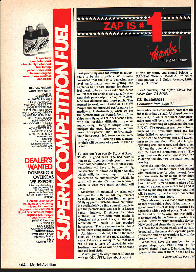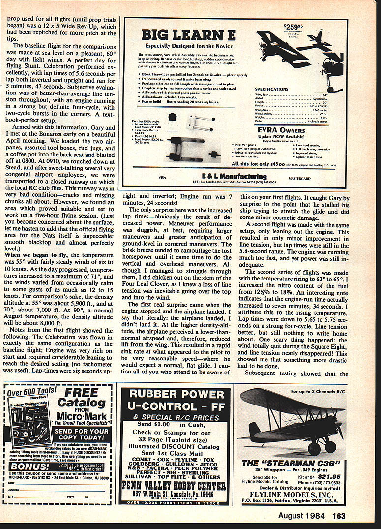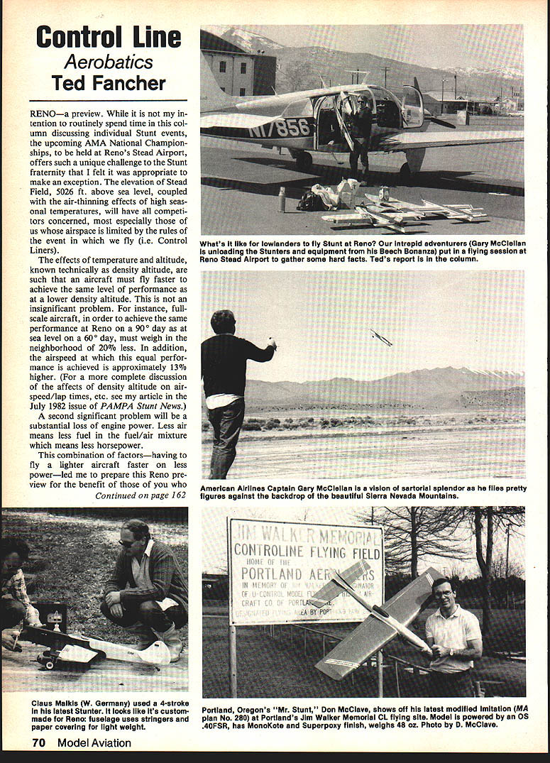 Control Line eroba tics Ted Fancher RENOa preview tention routinely spend time col umn discussing individual Stunt events upcoming AMA National Champion ships held Renos Stead Airport offers such unique challenge Stunt fraternity felt appropriate make exception elevation Stead Field 5026 ft above sea level coupled air-thinning effects high seas onal temperatures will have competi tors concerned especially us airspace limited rules event fly ie Control Liners effects temperature altitude known technically density altitude such alrcraft must fly faster achieve same level performance lower density altitude insignificant problem instance fullscale aircraft order achieve same performance Reno 900 day sea level 600 day must weigh neighborhood 2Oo less addition airspeed equal perfor mance achieved approximately 13% higher complete discussion affects density altitude air speed/lap times etc see article July 1982 issue PAMPA Stunt News second significant problem will substantial loss engine power Less air means less fuel fuel/air mixture means less horsepower combination factorshaving fly lighter aircraft faster less powerled prepare Reno pre view benefit Continued page 162 Claus Maikis W Germany used 4-stroke latest Stunter looks like Its custom- Portland Oregons Mr Stunt Don McClave shows off latest modified Imitation MA made Reno fuselage uses stringers plan No 280 Portlands Jim Walker Memorial CL flying site Model powered OS paper covering light weight 4OFSR has Monoote Superpoxy finish weighs 48 oz Photo D McClave 70 Model Aviation Whats like lowianders fly Stunt Reno intrepid adventurers Gary McClellan unloading Stunters equipment Beech Bonanza put flying session Reno Stead Airport gather some hard facts Teds report column American Airlines Captain Gary McClellan vision sartorial splendor flies pretty figures agaInst backdrop beautiful Sierra Nevada Mountains Kraft RIC Electronics PERSONAL SERVICE BY —-pMILT ERB SPECIAL LOW PRICESService charge repair andior checkup system four servos $2975 maximum Extra servos$25O Parts return shipment extra FREQUENCY CONVERSIONS-$2500 per system 50% off repair checkup SPECIALIZINGin competition systems frequency conversions FM equipment CUSTOM REPAIRSAll systems given personal attention test report comments careful cost control effort made return system likenew better operating condition HEATHKIT CUSTOMERSNew frequency conversions now available plugin systems$3500 per system AUTHORIZED FACTORY SERViCE FOR 1685 BeCkwith Dr Hudson OH 44236216 655-2278 pressures Im trying escape remembering takes kinds ac cept approach So Warner 1 Have invented several new words accompany breaking motor model Golly gee dingbunglers b murf c Gosh maybe shoulda stopped turn ago 2 Lomcevak Invented models long before tried real plane 3 Stomping model relieve stresses plane Mooney Well perhaps design landing gear uses music wire mounted external landing gear legs thus free flex absorb shock exactly innovations feel typically use plastic props almost everything probably put CG forward people mod els usually fly point Walts wife Carol interjected opinion Walts best innovations childrens names craft oriented Curtiss Ryan Douglas Martin Chrislea Bee Mooney Hannan That about does gang Any questions might wish asked Stark Yes about best Peanut models duration times 1 Heinkel 119 80 sec outdoors 60 sec indoors 2 Cessna Turbo Centurian 51 sec indoors plastic prop 3 Nakajima C6N Myrt 60 outdoors 55 sec indoors however difficult fly Martin 1 Does modeling have thing divorce 2 modeling good therapy out-of-touch reality 3 What sociogenic aspects aeromodeling world fraught complex schizo-effective pseudo-craftsmen Thompson The past year Ive busy harrassed hasnt time really concentrate ships endeavors flying mod els mainly concentration guy has two three ships knows well handles well situation go ing get results may build two three planes per year builds carefully superbly Clar ence Mather good example knows equipment wins easily Instead concentrating run around build models rather working what Ive got So poorly Im just too busy new next mountain properly use what already have said slap-happy Hannan rather heavy note seem have run out time Did have final questions Dave Stott $128000000 buried Grants tomb CL AerobaticslFanCher Continued page 70 will actually compete Reno education wish expand fund Stunt wisdom Inasmuch live just across Sierra Nevada Mountains Reno since good flying buddy Gary McClellan owns beautiful six-place Beechcraft Bonanza sometimes fly contests seemed logical should hop up Reno find out just what af fect mysterious forces nature actually going have Stunt ship Since hadnt really flown since Semi Finals day Chicopee Nats last year decided take day local fly ing field establish basic criteria compare Reno data aircraft used very competi tive conventional Stunters Garys OS 45F5R-powered 82 Nats qualifier based low-aspect-ratio Derringer wing own Celebration ST 46-powered derivative Excitation Cele bration 660-sq-in airplane 5975-in span aspect ratio 54 Weighed very accurate triplebeam balance scale weighed 523 ounces line length flights 66 ft 4 measured handle grip aircraft centerline flights made stock ST sprinkler-type venturi enlarged intake diameter 172 standard quantity fuel six ounces added flight NEW BUSY PEOPLE KITS CI TA ARIA STINSON 15 PROO ILL ILYINb MUULL $695 RUBBER POWER LOG $150 019 4424636 P ktMNOr 619 4698675 W Box 2406 -MA LA MESA CA 02041 FREE 1984 Catalog ol tools Hobbyist Miniature lathes Milling/drilling machines Jig & circular saws Styrofoam cutter VJt6all hobby products cc PO Box 07846 Columbus OH 432C 182 Model Aviation 1131 NW 45 Street Ft Liaderdale FL 33309 3051 491-6115 IENGINEERING THE LANDING GEAR PEOPLE Tired 1 kit landing gears dent lIt year Wggie preperty 0 & 0 Eogiaeerieg can solve veer prohiceis * Caste hailt te yanr needs & specs guareoteod lit * Strong & darahie withstand toughest Isedieg * II & 0 Engineering gear will work & keep yea