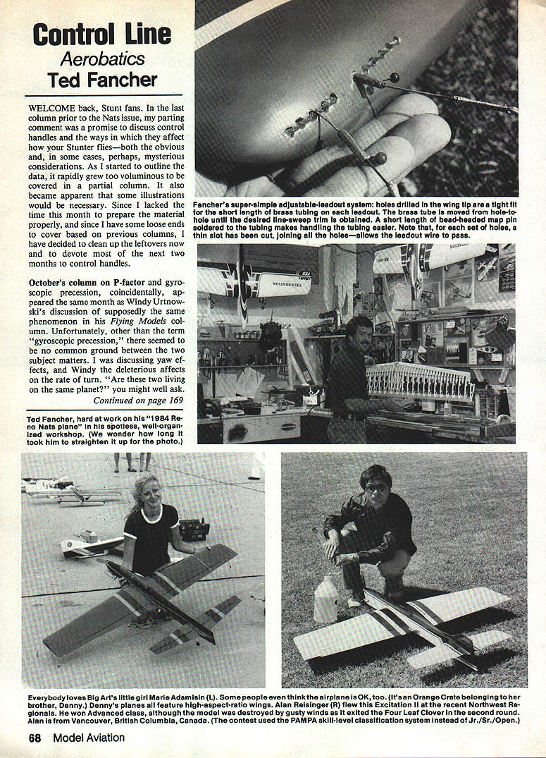 Control Line Aerobatics Ted Fancher WELCOME back Stunt fans last column prior Nats issue parting comment promise discuss control handles ways affect Stunter fliesboth obvious some cases perhaps mysterious considerations As started outline data rapidly grew too voluminous covered partial column also became apparent some illustrations would necessary Since lacked time month prepare material properly since have some loose ends cover based previous columns have decided clean up leftovers now devote next two months control handles Octobers column P-factor gyro scopic precession coincidentally ap peared same month Windy Urtnow skis discussion supposedly same phenomenon Flying Models col umn Unfortunately other term gyroscopic precession seemed no common ground between two subject matters discussing yaw ef fects Windy deleterious affects rate turn Are two living same planet might well ask Continued page 169 Ted Fancher hard work 1984 Reno Nate plane spotless well-organ ized workshop wonder long took him straighten up photo Fanchers super-simple adjustabie-Icadout system holes drilled wing tip area tight fit short length brass tubing leadout brass tube moved hole-tohole untli desired line-sweep trim obtained short length bead-headed map pin soldered tubing makes handling tubing easier Note set holes thin slot has cut joining holesallows leadout wire pass Everybody loves Big Arts little girl MarleAdamisin L Some peopieeven thinkthe airplane 180K too itsan OrangeCrate beionglngto brother Denny Dennys planes feature high-aspect-ratIo wings Alan Reisinger R flew Excitation ii recent Northwest Re glonais won Advanced class although model destroyed gusty winds exited Four Leaf Clover second round Alan Vancouver British Columbia Canada contest used PAMPA skIll-level classification system instead Jr/SrIOpen 68 Model Aviation doors use fine-tooth blade saber law break wood veneer away wood frame scrap piece Thisel wood fragments glue off nd piece test fit opening f main door section Glue place md nail few 1-in paneling nails attach door panels other tart applying white glue 20-inch dge Butt panels together eanis over wax paper protect floor rive corrugated nails inch ront rear edges Have someone help urn doors over drive nails ither side Now set door unit its Larrow edge glue nail wood trim o front edge Use 3 Base Ranch leather Edge molding attach 1 rotruding above shelfs surface erve wheel stop Set shelf flat ie floor allow glue dry installed shelf 1-in gap reen shelf wail allowed run extension cords battery bargers aiso provided enough distance fit largest model between wail nd front trim Test models see depth will enough move e shelf out two inches Secure ielf small screws about inch om rear shelf Drill holes rackets use small angle braces setting up model layout [ternate high- 16w-wing models y different schemes determine what yout will get models ielf An easy-to-change wheel chock can made A- 1-in aluminum angle ock secure small screws ould able easily lift models over ie chocks Next line up chargers ansmitters model run em extension cord power bar ont use shelf flight case ep heavy items floor hope ideas will add pleas e working shop have rtalnly improved enjoyment model iilding next project desk file binet wont misplace letters L AerobaticslFancher ontinued page 68 addition just received very clever d well-thought-out letter Gary kers Riverside CA bemoaning fact iat just installed bellcrank new Stunter Up leadout ont such luminaries Bob aron Al Rabe Tom Dixon S1n owell published very suc ssful designs shocked read ty column suggested rong asked gue cheek ew ship destined failure since one-time Nats Stunt champ ay have natural laws aerody smics altered specifications Im almost sorry brought up lain Almost. quite sub ct aithough interesting assuming oportions far excess its importance event order toI hopeput rest Ill devote just few para graphs short discussion basic properties gyroscope admis sion Yes Gary can trim Stunt ship fly front Up line although will better trimmed built way rear Up line gyroscope exhibits two basic proper ties Gyroscopic Inertia GI Gyro scopic Precession GP GI property makes gyroscope appear defy gravity spinning mass resists efforts outside forces. including gravity. displace its plane rotation heavier mass greater rpm resists GI dominant force used primary stabilizing device airplanes space vehicles ocean liners down-to-earth example inertial affects spinning wheels bicycle faster go stable becomes Come stop falls over eliminate confusion between column Windys GI phenome non inhibits rate turn GP Windys analysis no less correct adding mass prop/spinner unitor increas ing rpmdoes retard rate turn Un fortunately mislabled force Gyroscopic Precession quickly touch base GP lets return briefly bike ride enlightening revelation Remember trying impress pre-teen heartthrob January1985 169 prowess riding Schwinn no hands Anybody could ride straight ahead good old GI work could make turns well Simply lean ing left right two-wheeled gyro obediently predictably followed suit weight created force caused wheels tilt despite iner tial reluctance force applied top wheels propagated movement same direction point 900 further plane rota tion thus turning wheel left leaned left vice versa Voila GP work None foregoing way alters position relative importance P-factor. ie much significant GP satisfy Garys inquiry however must state dealing area subtle trim refinements whole subject being better grist apres-Stunt pizza and-beer-getogether tear airplane apart start over material great very-fine-flying Stunters around world front Up lines Yes Gary did know being done Its just would have wee bit better built tother way As teaser think upcoming discussion control handles will show lot trim problems inveighing evils GP GI P-factor other such esoterica will shown correctable application thorough understanding three basics handie response rate control feel neutrality handle does lot just keep skinny wi