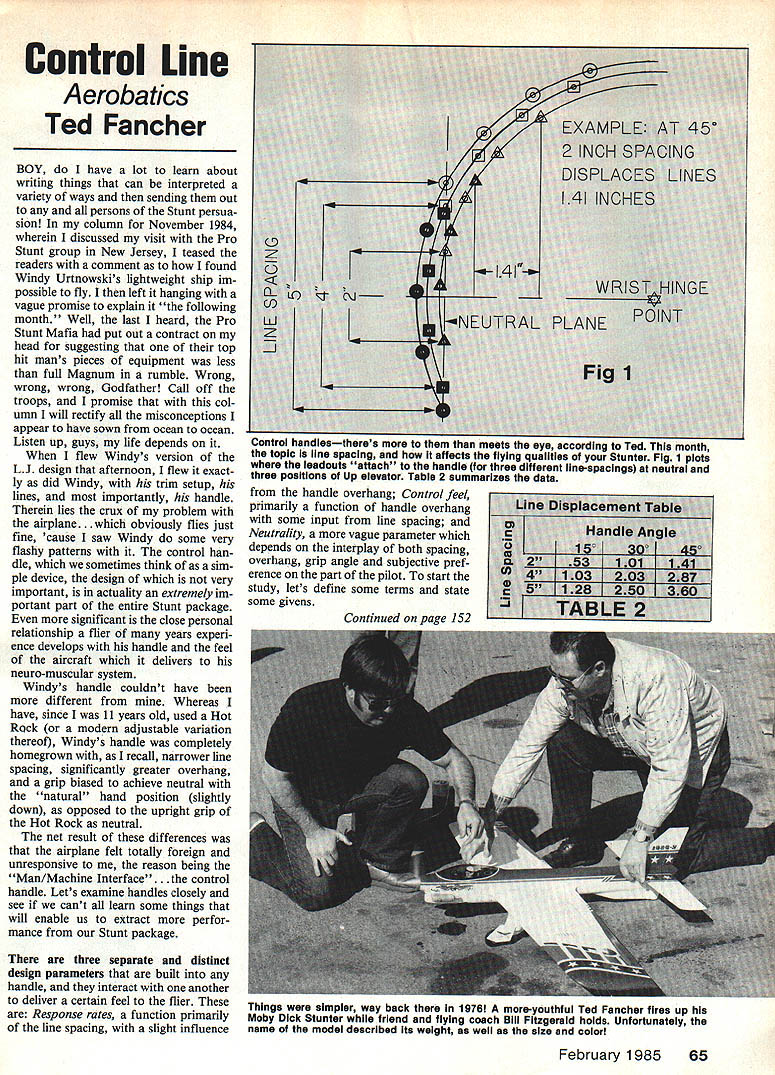 Control Line Aerobatics Ted Fancher BOY have lot learn about writing things can interpreted variety ways sending Out persons Stunt persua sion column November 1984 wherein discussed visit Pro Stunt group New Jersey teased readers comment found Windy Urtnowskis lightweight ship im possible fly left hanging vague promise explain following month Well last heard Pro Stunt Mafia put out contract head suggesting top hit mans pieces equipment less full Magnum rumble Wrong wrong wrong Godfather Call off troops promise col umn will rectify misconceptions appear have sown ocean ocean Listen up guys life depends flew Windys version LJ design afternoon flew exact ly did Windy trim setup lines importantly handle Therein lies crux problem airplane. ously flies just fine cause saw Windy some very flashy patterns control han dle sometimes think sim ple device design very important actuality extremely im portant part entire Stunt package significant close personal relationship flier years experi ence develops handle feel aircraft delivers neuro-muscular system Windys handle couldnt have different Whereas have since 11 years old used Hot Rock modern adjustable variation thereof Windys handle completely homegrown recall narrower line spacing significantly greater overhang grip biased achieve neutral natural hand position slightly down opposed upright grip Hot Rock neutral net result differences airplane felt totally foreign unresponsive reason being Man/Machine Interface.the control handle Lets examine handles closely see cant learn some things will enable us extract perfor mance Stunt package three separate distinct design parameters built handle interact another deliver certain feel flier Response rates function primarily line spacing slight influence Control handlestheres thea~ nien meei eye accoraing i ec mis topic line spacing affects flying qualities Stunter Fig 1 plots leadouts attach handle three different line-spacings neutral three positions Up elevator Table 2 summarizes data handle overhang Control feel primarily function handle overhang some input line spacing Neutrality vague parameter depends interplay both spacing overhang grip angle subjective pref erence part pilot start study lets define some terms state some givens Continued vase 152 Things simpler way back 19761 more-youthful Ted Fancher fires up Moby Dick Stunter friend flying coach Bill Fitzgerald holds Unfortunately name model described its weight well size color MARINE & CAR ENGINE SPECIALS P-21Car SE $6500 P21 Marine SE$6500 P65 Marine $9000 P21 Car RE $6500 P-21 Marine RE $6500 P80 Marine $11000 P21 Buggy SE $6500 P-45 Mar-Drum RV $7800 P-21Delta$7500 P-45 Mar-Disc RV $8500 P90 Marine $13000 AERO ENGINE SPECIALS P-21 SE$5000P-45 SE$6000P-SO SE$9000 P21 RE$5500P60 SE$8500P80 RE$9500 P40 v $6500 P-60 RE $9000 P80 Duct Fan $10000 P-40 SE $5800 P-45 luct Fan $7500 P-65 Duct Fan $9500 Packing & Handling $400 COD Cash Only $165 Pay UPS Charge through ribs wing tip guides little extra care thought during building models control system will produce smooth-working wellbalanced system Send items CL Scale Bill Boss 77-06 269th St New Hyde Park NY 11040 CL Aerobatics/Fancher Continued page 65 Line spacing will defined ver tical distance Up line Down line handle neutral Specific examples addressed will handles spacing two four five inches will assume handles designed such manner regardless grip angle neutral Down line will attach handle directly below Up line addition horizontal line wrist hinge-point through vertical center handle will considered plane above forces will algebraically positive below will negative Dont let last bit throw simply basis some very simple math well doing discussion handle feel will become clear discuss overhang probably next month However Id better least mention what overhang everyone will PICCO GLO PLUGS $1500 Dozen aware what Im talking about Over hang distance wrist hingepoint outermost point con trol handle leadout wires emerge confinement han dle structure have assumed dis tance wrist hinge-point front handle grip 3 inches various tables calculations will used both March columns values deflection angles forces etc will dervied measurements reasonably-accurate full-scale drawings rather being derived mathematically force meas urements will assume total line tension pull 30 lb divided equally between Up Down hues ie 15 lb per line concept may very enlightening some havent taken opportunity completely think-through control sys tem entire Stunt package true friction-free control system will result load control lines being shared equally between lines throughout control deflectionsbut holds true up point maximum control deflection reached hang airplane single line condition sure sign poorly-trimmed plane radius rotation handle de flection control inputs will measured wrist hinge-point line-attach points described discussion overhang Thus greater line spacing overhang greater radius rotation sake keeping discussion reasonable length handle positions rotationsof 0 150 300 450 will used No consideration will taken pilots ability use arm body inputs modify handles mechanically-achiev able capabilities Well assume inputs would apply equally handle can therefore reasonably ignored Finally although function handle deflect flaps eleva tors would require full study airborne control system well han dle encompass findings thereof such study beyond scope ar ticle Therefore will accept func tion handle moving leadouts wing tip Therefore lin ear measurement movement will re flect effects inputs handle set Lets discuss response rate rela tive sensitivity first Take look Figure its accom panying table figure locates posi tion Up Down lines four dif ferent rotation angles 00 150 300 450 three different line spacings two four five inches solid sym bols indicate Down line position open symbols Up llne plot Up elevator assumed Down ele vator would produce identical plots reverse figure line-attach-point differential between Up Down li