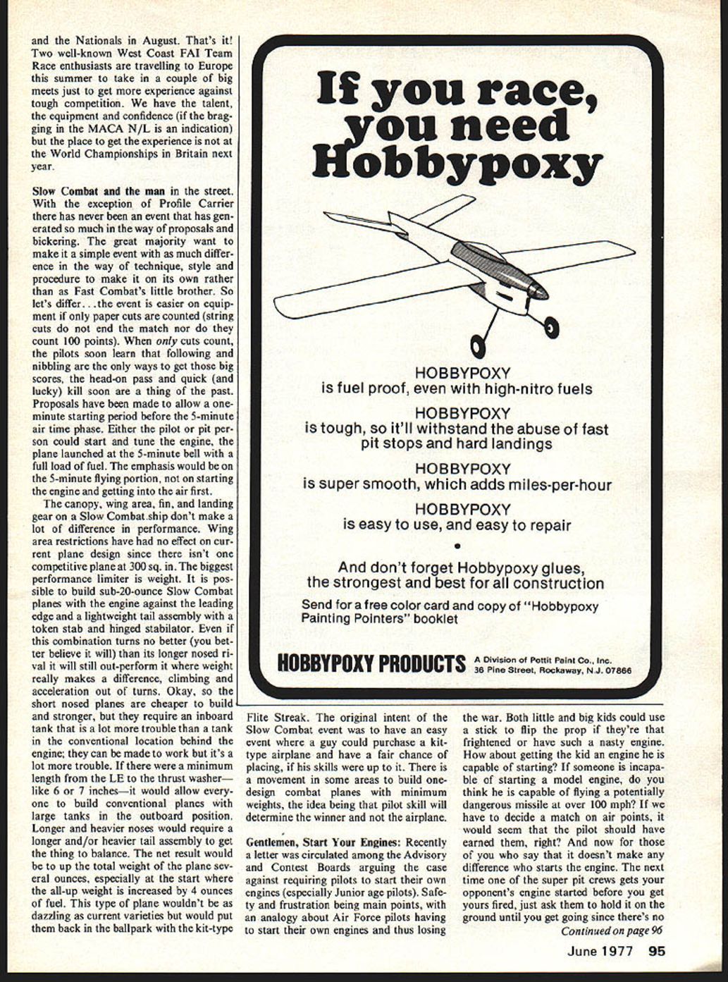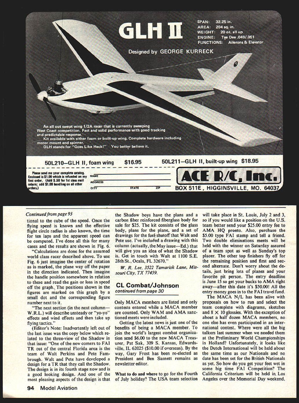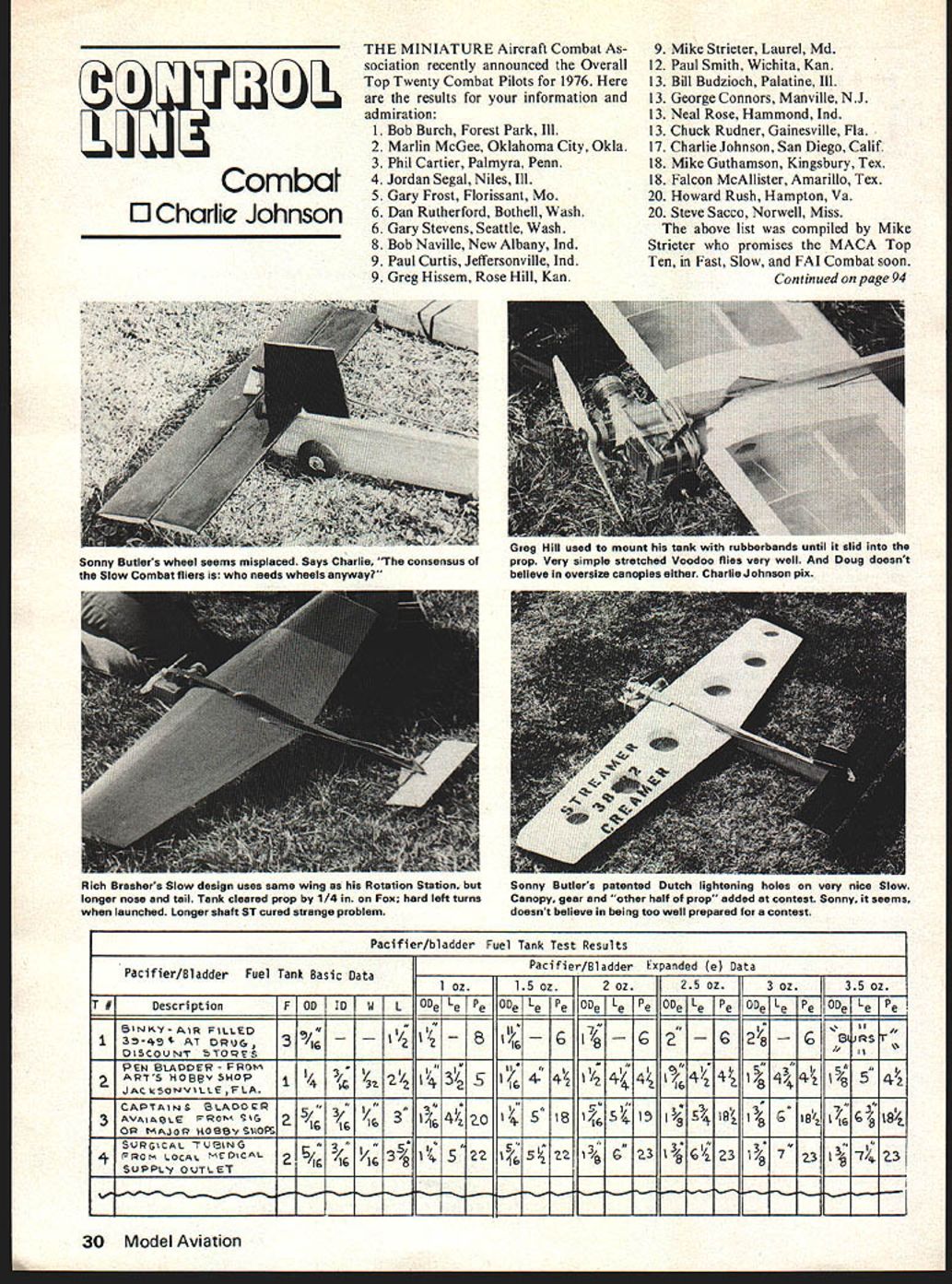 Combat 0 Charlie Johnson THE MINIATURE Aircraft Combat As sociation recently announced Overall Top Twenty Combat Pilots 1976 results information admiration 1 Bob Burch Forest Park Ill 2 Marlin McGee Oklahoma City Okla 3 Phil Cartier Palmyra Penn 4 Jordan Segal Niles Ill 5 Gary Frost Florissant Mo 6 Dan Rutherford Bothell Wash 6 Gary Stevens Seattle Wash 8 Bob Naville New Albany md 9 Paul Curtis Jeffersonville md 9 Greg Hissem Rose Hill Kan 9 Mike Strieter Laurel Md 12 Paul Smith Wichita Kan 13 Bill Budzioch Palatine Ill 13 George Connors Manville NJ 13 Neal Rose Hammond md 13 Chuck Rudner Gainesville Fla 17 Charlie Johnson San Diego Calif 18 Mike Guthamson Kingsbury Tex 18 Falcon McAllister Amarillo Tex 20 Howard Rush Hampton Va 20 Steve Sacco Norwell Miss above list compiled Mike Strieter promises MACA Top Ten Fast Slow FAI Combat soon Continued page 94 Pacifier/bladder Fuel Tank Test Results Pacifier/Bladder Fuel Tank Basic DataPacifier/Bladder Expanded Ce Data 1 oz15 oz2 oz25 oz3 oz35 oz T IDescriptionF OD IDWL t3e LefPe ODe Le e ODe] Le e ODe Le I~Le e JtODe BISJKY-AR FILill 4i 1 sSii 13-I AT DRUG~ i4G i8—G 2GG , lSCOUNT TOS SHOBv SHOPj 14 l 4- 4 1/- 44 JACkSONVLL5FLA4 Z6 APTANS LAOOR~ SI/ 7 7 3 AVAIAL FROt l44ZO ~ IJ4 l I/ G lB OR MAJOR 4OBB SO1iGv8lo 4 FRoM LOCAL MEDICAL 2/ 3 / 3l 5 ZZ 23 7/14 23 SURGCAt 1UBN% l4 5I SUFPLy OUTLET16 16 30 Model Aviation Sonny Butlers wheel seems misplaced Says Charlie consensus Slow Combat fliers needs wheels anyway Greg Hill used mount tank rubberbands until slid prop Very simple stretched Voodoo flies very well Doug doesnt believe oversize canopies either Charlie Johnson pix Rich Brashers Slow design uses same wing Rotation Station longer nose tail Tank cleared prop 1/4 Fox herd left turns launched Longer shaft ST cured strange problem Sonny Butlers patented Dutch lightening holes very nice Slow Canopy gear other half prop added contest Sonny seems doesnt believe being too well prepared contest I 50L210GLH II foam wing$169550L211GLH II built-up wing $1895 Plamms mnd complete atulog refunded NAME lit class mailADDRESS nanuling eli other CITY STATE LIE tinued page 93 tional cube speed Once flying speed known effective flight circle radius also known time ten laps apparent speed can computed Ive done cases results shown Fig 6 Calculations done assumed world class racer described above use Fig 6 just imagine center rotation marked plane way off paper direction indicated imagine handle position somewhere relation read gain loss speed off graph positions shown figures marked graph small dot corresponding figure number next next section next column WRL will describe unsteady yo-yo effects wind effects take up flying tactics Editors Note Inadvertently left out last issue copy below re lated three-view Shadow issue new comers FAT TR out central Florida area team Walt Perkins Pete Fain brough Walt Pete have developed design TR call Shadow design its fourth stage now good looking design pleasing aspects design Shadow boys have plans carbon fiber reinforced fiberglass body sale $25 kit consists glass body plans plane set drawings fuel shutoff Walt Pete use Ive included drawing column actually May issueEd will give idea what Shadow Get touch Walt 1100 SE 28th St Ocala FL 32670 W R Lee 3522 Tamarisk Lane Mis souri City TX 77459 CL Combat/Johnson continued page 30 Only MACA members listed contests entered MACA member counted Only WAM AMA sanc tioned meets included Getting latest news just benefits being MACA member join worlds largest combat organiza tion send $600 new MACA Treas urer Pat Sak 309 5 Kansas Edwards ville IL 62025 $1000 overseas way Gary Frost has re-elected President Ben Sasnett remains newsletter editor What go Fourth July holiday USA team selection will take place St Louis July 2 3 would like position US team better send $2500 entry fee AMA HQ pronto Also purchase $500 type FAT stamp tell friend Two double eliminations meets will held winner Saturday assured team spot well Sundays top placer other top finishers fly off remaining position first sec ond alternate Dont worry about de tails just bring lots planes favorite pit person entry deadline June 15 get bucks AMA right awayafter date its $5000 entry money goes FAI travel fund MACA N/L has alive proposals run select team complete diagrams sketches 8 X 10 glossies exception about half dozen MACA members no else has participated inter national contest big talkers last summer needed Preliminary World Championships Holland Unfortunately looks like Dutch International will held about same time Nationals no date has set British Nationals yet So get feet wet some big time FAT Competition California Criterium will held Los Angeles over Memorial Day weekend 94 Model Aviation urn coo len Nationals August Thats Two well-known West Coast FAI Team Race enthusiasts travelling Europe summer take couple big meets just get experience against tough competition have talent equipment confidence brag ging MACA N/L indication place get experience World Championships Britain next year Slow Combat man street exception Profile Carrier has never event has gen erated much way proposals bickering great majority want make simple event much differ ence way technique style procedure make its own rather Fast Combats little brother So lets differ. event easier equip ment paper cuts counted string cuts end match nor count 100 points cuts count pilots soon learn following nibbling ways get big scores head-on pass quick lucky kill soon thing past Proposals have made allow oneminute starting period before 5-minute air time phase Either pilot pit per son could start tune engine plane launched 5-minute bell full load fuel emphasis would 5-minute flying portion starting engine getting air first canopy wing area fin landing gear Slow Combatship dont make lot difference performance Wing area restrictions have no effect cur rent plane design since isnt competitive plane 300 sq biggest performance limiter weight pos sible build sub-20-