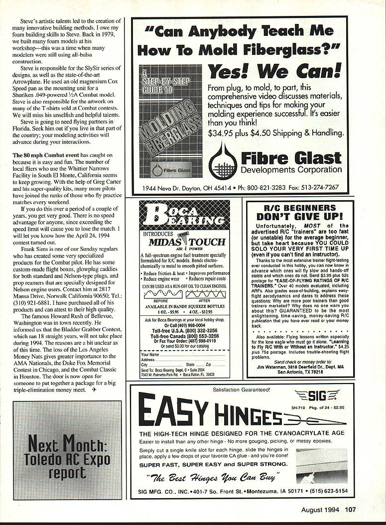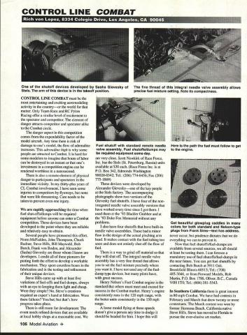 CONTROL LINE COMBAT CONTROL LINE COMBAT must entertaining exciting aeromodeling activity countryor world matter Only Team Race RC Pylon Racing offer similar level excitement spectator competitor element danger attracts competitor spectator alike Combat circle danger aspect competition comes expendability factor model aircraft Any time risk damage ones model flow adrenaline increases adrenaline high some people attracted Combat hard some modelers imagine hours labor can destroyed instant ones investment competition engine can rendered worthless nanosecond also remote element physical danger participants spectators immediate vicinity thirty-plus years CL Combat involvement have seen some injuries competitors flyaways life threatening Care needs taken prevent injury rapidly approaching time fuel shut-offs/dumps will required equipment before anyone can enter Combat competition devices have developed point reliable relatively easy obtain Several people have pioneered effort Norm McFadden John Thompson Chuck Rudner Steve Hills Bill Maywald Bob Burch Frank von Boden Alexander Sasha Gievesky know developers credit pioneers putting forth effort develop workable mechanism spent countless hours fabrication testing refinement unique devices Steve Hills came up least five variations fuel-offs fuel dumps always eye keeping light cheap simple No Steves creations required experts hand fabrication failures bet thats progress takes place still room development event needs refined devices available local hobby shops reasonable cost Fuel shutoff standard remote needle valve assembly Fuel shutoffs/dumps may required equipment some day very close Scott Newkirk Race Force Inc has Stels St Petersburg Russia units available $30 Race Force Inc PO Box 342 Edmonds Washington 98020-0342 Tel 206 774-6456 Fax 206 775-1869 devices developed Alexander Gieveskyone key people Stels factory accompanying photographs show two versions Gievesky fuel shutoffs have four nonintegrated needle valve assembly versions have worked time since got used 93 Bladder Grabber 93 Duke Fox Memorial problems also have four shutoffs have built-in needle valve assemblies minor flaw design actual pinching ann head makes contact fuel tubing too soon does entirely shut off flow fuel way grind off material will shutoff integral needle valve assembly has very fine thread allows set fuel mixture precisely want have used fueldump type devices pilots have great success Henry Nelsons Fast Combat engine standard others must meet exceed success Combat market Henrys engine consistently runs 120 mph range better units consistently 130 mph range loose model flying speeds doesnt give person time dodge should headed him hope will never occur prudence dictates everything can prevent Now fuel shutoffs/fuel-dumps available several sources should least testing can foresee mandatory use fuel shutoffs/fuel-dumps near future can get fuel shutoffs contacting Bob Burch 3911 Oak Brookfield Illinois 60513 Tel 708 485-3046 Forward Models Rob Martin PO Box 1786 Oliver BC Canada VOH lTO Tel 604 381-5543 Southern California great interest 80 mph Combat have contests February March drew twenty contestants March contest won former Hermosa Beach California native Steve Hills Steve has moved Florida pursue ever-elusive art market 106 Model Aviation off devices developed Sasha Gievesky fine thread integral needle valve assembly allows Stels arm device takeoff position precise fuel mixture setting Note its compactness path fuel must follow get engine Get beautiful glowplug caddies colors both standard Nelson-type plugs Frank Simstext has address Steves artistic talents led creation innovative building methods owe foam building skills Steve Back 1979 built foam models workshopthis time modelers still using all-balsa construction Steve responsible SlySir series designs well state-of-the-art Arrowplane used old magnesium Cox Speed pan mounting unit Shuriken 049-powered Combat model Steve also responsible artwork T-shirts sold Combat contests will miss unselfish helpful talents Steve going need flying partners florida Seek him out live part country modeling activities will advance during interactions 80 mph Combat event has caught because easy fun number local fliers use Whittier Narrows Facility South El Monte California seems keep growing help Greg Carter super-quality kits pilots have joined ranks fly practice matches weekend over period couple years get very good no speed advantage anyone since exceeding speed limit will cause lose match will let know April 24 1994 contest tamed out Frank Sims Sunday regulars has created some very specialized products Combat pilot has some custom-made flight boxes glowplug caddies both standard Nelson-type plugs prop reamers specially designed Nelson engine users Contact him 2817 Mansa Drive Norwalk California 90650 Tel 310 921-6881 have purchased products can attest high quality famous Howard Rush Bellevue Washington town recently informed us Bladder Grabber Contest ran 18 straight years will take place during 1994 reasons bit unclear time loss Los Angeles Money Nats gives greater importance AMA Nationals Duke Fox Memorial Contest Chicago Combat Classic Houston door now open someone put together package big triple-elimination money meet 4Can Anybody Teach Mold Fiberglass Yes Can plug mold part comprehensive video discusses materials techniques tips making molding experience successful Its easier think $3495 plus $450 Shipping & Handling e Glast Developments Corporation 1944 Neva Dr Dayton OH 45414 00-821-3283 Fax 513-274-7267 AIM fullspectrum engine fuel treatment specially fonnulated R/C models Bonds electro chemically metal smooth pitted surfaces Reduce friction & heat Improves perfonnanci Reduce engine wear ces repair costs CAN BE USED AS RUN-OFF OIL TO CLEAN ENGINES - ,., BEFOREAFTER AVAILABLE tN HANDY SQUEEZE BOTTLES OZ -$595 51295 Ask Boca Bearings local hobby shop Call 4071 998-0004 Toll-free USA 800 332-3256 Toll-free Canada 800 553-3256