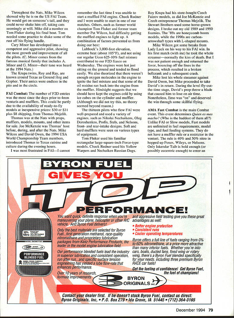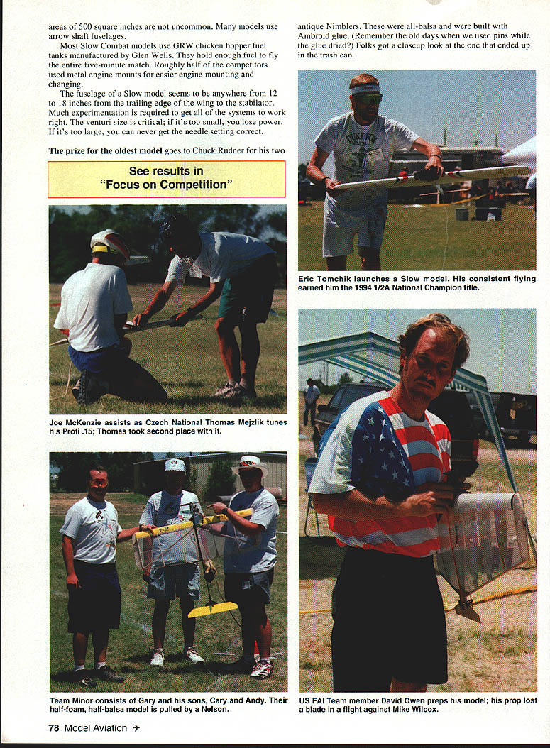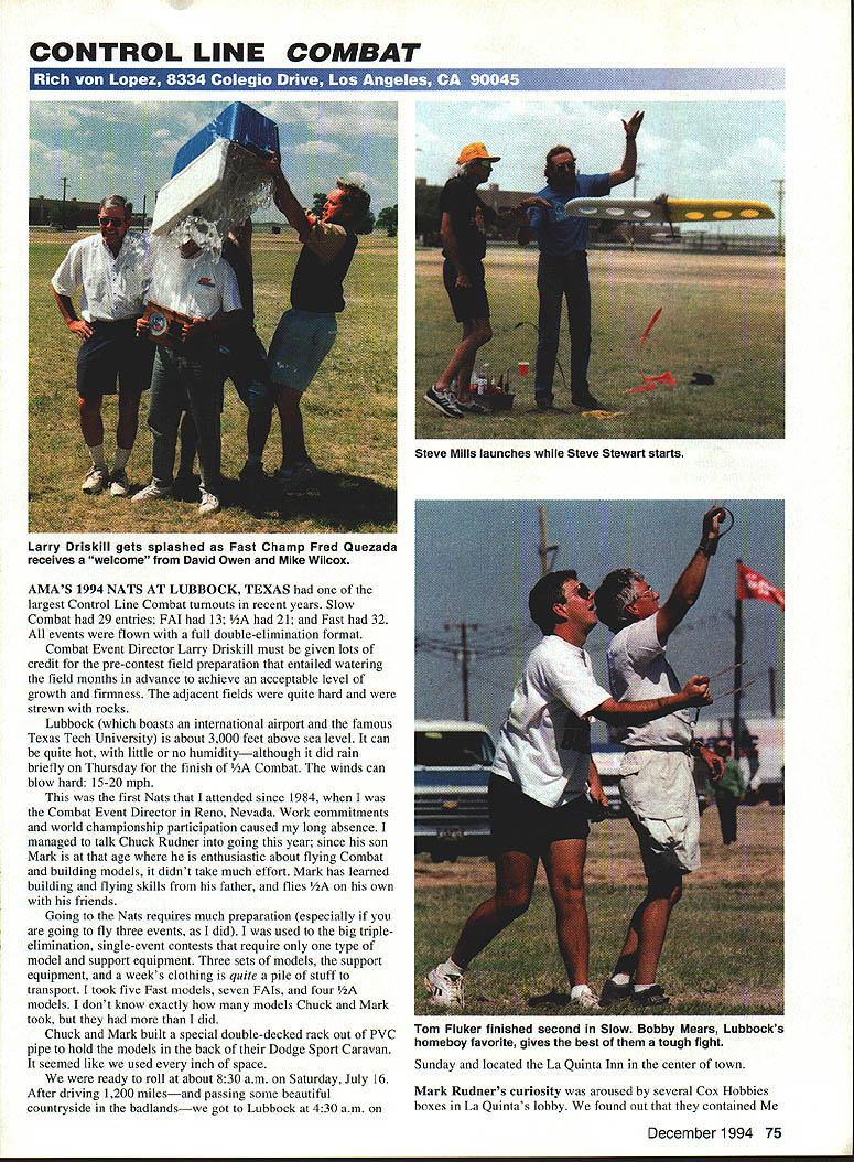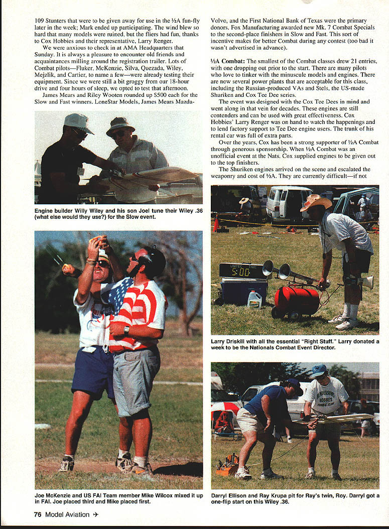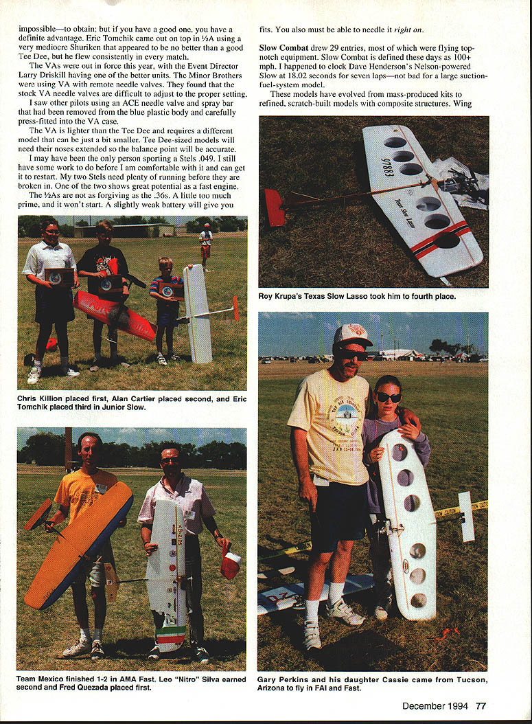 CONTROL LINE COMBAT AMAS 1994 NATS AT LUBBOCK TEXAS largest Control Line Combat turnouts recent years Slow Combat 29 entries FAI 13 21 Fast 32 All events flown full double-elimination format Combat Event Director Larry Driskill must given lots credit pre-contest field preparation entailed watering field months advance achieve acceptable level growth firmness adjacent fields quite hard strewn rocks Lubbock boasts international airport famous Texas Tech University about 3000 feet above sea level can quite hot little no humidityalthough did rain briefly Thursday finish Combat winds can blow hard 15-20 mph first Nats attended since 1984 Combat Event Director Reno Nevada Work commitments world championship participation caused long absence managed talk Chuck Rudner going year since son Mark age enthusiastic about flying Combat building models didnt take much effort Mark has learned building flying skills father flies /2A own friends Going Nats requires much preparation especially going fly three events did used big tripleelimination single-event contests require type model support equipment Three sets models support equipment weeks clothing quite pile stuff transport took five Fast models seven FAIs four 1/zA models dont know exactly models Chuck Mark took did Chuck Mark built special double-decked rack out PVC pipe hold models back Dodge Sport Caravan seemed like used inch space ready roll about 830 am Saturday July 16 After driving 1200 milesand passing some beautiful countryside badlandswe got Lubbock 430 am Sunday located La Quinta Inn center town Mark Rudners curiosity aroused several Cox Hobbies boxes La Quintas lobby found out contained December 1994 75 Steve Mills launches Steve Stewart starts Larry Driskill gets splashed Fast Champ Fred Quezada receives welcome David Owen Mike Wilcox Tom Fluker finished second Slow Bobby Mears Lubbocks homeboy favorite gives best tough fight 109 Stunters given away use 1/2A fun-fly later week Mark ended up participating wind blew hard models ruined fliers fun thanks Cox Hobbies representative Larry Renger anxious check AMA Headquarters Sunday always pleasure encounter old friends acquaintances milling around registration trailer Lots Combat pilotsFluker McKenzie Silva Quezada Wiley Mejzlik Cartier name fewwere already testing equipment Since still bit groggy 18-hour drive four hours sleep opted test afternoon James Mears Riley Wooten rounded up $500 Slow Fast winners LoneStar Models James Mears MazdaVolvo First National Bank Texas primary donors Fox Manufacturing awarded new Mk 7 Combat Specials second-place finishers Slow Fast sort incentive makes better Combat during contest too bad wasnt advertised advance Combat smallest Combat classes drew 21 entries dropping out prior start pilots love tinker minuscule models engines now several power plants acceptable class including Russian-produced VAs Stels US-made Shuriken Cox Tee Dee series event designed Cox Tee Dees mind went along vein decades engines still contenders can used great effectiveness Cox Hobbies Larry Renger hand watch happenings lend factory support Tee Dee engine users trunk rental car full extra parts Over years Cox has strong supporter 1/2A Combat through generous sponsorship Combat unofficial event Nats Cox supplied engines given out top finishers Shuriken engines arrived scene escalated weaponry cost 1/2A currently difficultif 76 Model Aviation ne builder Willy Wiley son Joel tune Wiley 36 what else would use Slow event Larry Driskill essential Right Stuff Larry donated week Nationals Combat Event Director Joe McKenzie US FAI Team member Mike Wilcox mixed up FAI Joe placed third Mike placed first Darryl Ellison Ray Krupa pit Rays twin Roy Darryl got one-flip start Wiley 36 impossibleto obtain have good have definite advantage Eric Tomchik came out top /2A using very mediocre Shuriken appeared no better good Tee Dee flew consistently match VAs out force year Event Director Larry Driskill having better units Minor Brothers using VA remote needle valves found stock VA needle valves difficult adjust proper setting saw other pilots using ACE needle valve spray bar removed blue plastic body carefully press-fitted VA case VA lighter Tee Dee requires different model can just bit smaller Tee Dee-sized models will need noses extended balance point will accurate may have person sporting Stels 049 still have some work before am comfortable can get restart two Stels need plenty running before broken two shows great potential fast engine /2As forgiving 36s little too much prime wont start slightly weak battery will give fits also must able needle right Slow Combat drew 29 entries flying top notch equipment Slow Combat defined days 100 mph happened clock Dave Hendersons Nelson-powered Slow 1802 seconds seven lapsnot bad large suctionfuel-system model models have evolved mass-produced kits refined scratch-built models composite structures Wing December 1994 77 Roy Krupas Texas Slow Lasso took him fourth place Chris Killion placed first Alan Cartier placed second Eric Tomchik placed third Junior Slow Team Mexico finished 1-2 AMA Fast Leo Nitro Silva earned second Fred Quezada placed first Gary Perkins daughter Cassie came Tucson Arizona fly FAI Fast areas 500 square inches uncommon models use arrow shaft fuselages Most Slow Combat models use GRW chicken hopper fuel tanks manufactured Glen Wells hold enough fuel fly entire five-minute match Roughly half competitors used metal engine mounts easier engine mounting changing fuselage Slow model seems anywhere 12 18 inches trailing edge wing stabilator Much experimentation required get systems work right venturi size critical its too small lose power its too large can never get needle setting correct prize oldest model goes Chuck Rudner two See results Focus Competition antique Nimblers all-balsa built Ambroid glue Remember old days used pins glue dried Folks got closeup look ended up trash can 78 Model Aviation Tomchik launches Slow model consistent flyin