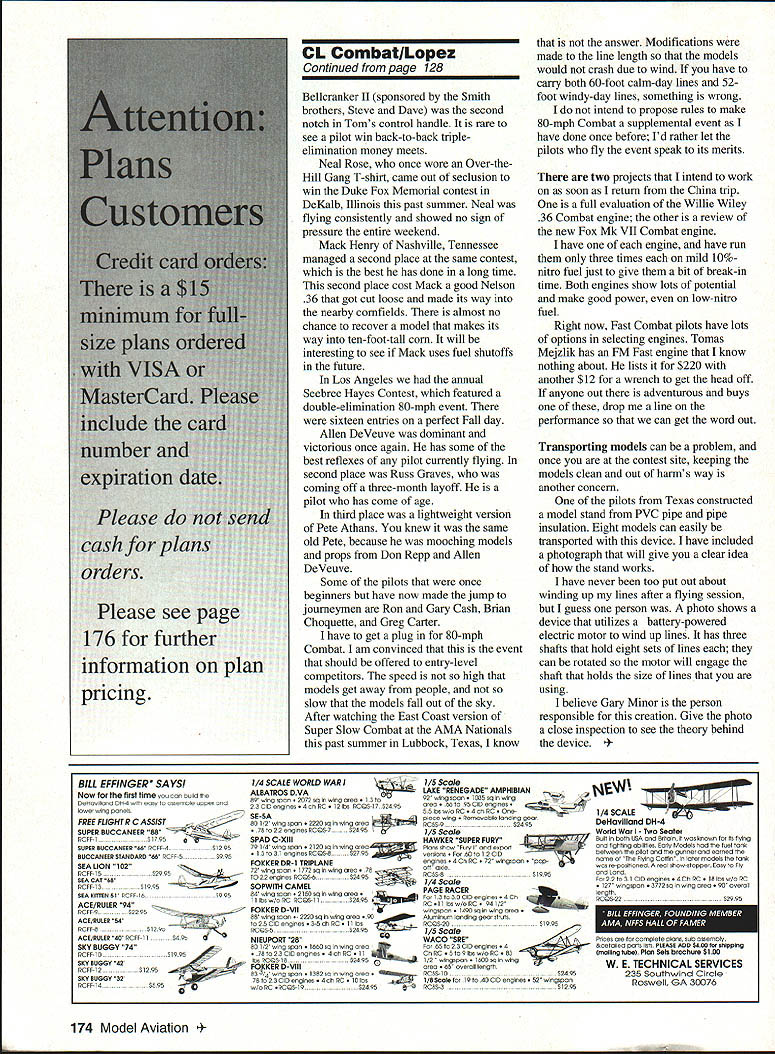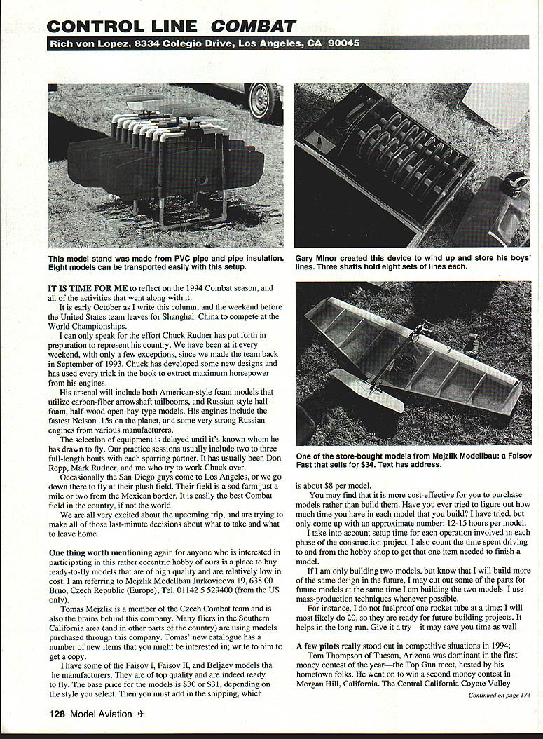 CONTROL LINE COMBAT U 4 r uvr1 n 1 rx i ru IT IS TIME FOR ME reflect 1994 Combat season activities went along early October write column weekend before United States team leaves Shanghai China compete World Championships can speak effort Chuck Rudner has put forth preparation represent country have weekend few exceptions since made team back September 1993 Chuck has developed some new designs has used trick book extract maximum horsepower engines arsenal will include both American-style foam models utilize carbon-fiber arrowshaft tailbooms Russian-style halffoam half-wood open-bay-type models engines include fastest Nelson 15s planet some very strong Russian engines various manufacturers selection equipment delayed until its known has drawn fly practice sessions usually include two three full-length bouts sparring partner has usually Don Repp Mark Rudner try work Chuck over Occasionally San Diego guys come Los Angeles go down fly plush field field sod farm just mile two Mexican border easily best Combat field country world very excited about upcoming trip trying make last-minute decisions about what take what leave home thing worth mentioning again anyone interested participating rather eccentric hobby place buy ready-to-fly models high quality relatively low cost am referring Mejzlik Modellbau Jurkovicova 19 638 00 Brno Czech Republic Europe Tel 01142 5 529400 US Tomas Mejzlik member Czech Combat team also bralns behind company fliers Southern California area other parts country using models purchased through company Tomas new catalogue has number new items might interested write him get copy have some Faisov Falsov II Beljaev models tha manufacturers top quality indeed ready fly base price models $30 $31 depending style select must add shipping about $8 per model may find cost-effective purchase models rather build Have ever tried figure out much time have model build have tried come up approximate number 12-15 hours per model take account setup time operation involved phase construction project also count time spent driving hobby shop get item needed finish model am building two models know will build same design future may cut out some parts future models same time am building two models use mass-production techniques whenever possible instance fuelproof rocket tube time will likely 20 ready future building projects helps long run Give tryit may save time well few pilots really stood out competitive situations 1994 Tom Thompson Tucson Arizona dominant first money contest yearthe Top Gun meet hosted hometown folks went win second money contest Morgan Hill California Central California Coyote Valley Continued page 174 128 Model Aviation l stand made PVC pipe pipe insulation Eight models can transported easily setup Gary Minor created device wind up store boys lines Three shafts hold eight sets lines store-bought models Mejzlik Modellbau Falsov Fast sells $34 Text has address CL CombatlLopez Continued page 128 Belicranker II sponsored Smith brothers Steve Dave second notch Toms control handle rare see pilot win back-to-back tripleelimination money meets Neal Rose once wore Over-theHill Gang T-shirt came out seclusion win Duke Fox Memorial contest DeKaIb Illinois past summer Neal flying consistently showed no sign pressure entire weekend Mack Henry Nashville Tennessee managed second place same contest best has done long time second place cost Mack good Nelson 36 got cut loose made its way nearby cornfields almost no chance recover model makes its way ten-foot-tall corn will interesting see Mack uses fuel shutoffs future Los Angeles annual Seebree Hayes Contest featured double-elimination 80-mph event sixteen entries perfect Fall day Allen DeVeuve dominant victorious once again has some best reflexes pilot currently flying second place Russ Craves coming off three-month layoff pilot has come age third place lightweight version Pete Athans knew same old Pete because mooching models props Don Repp Allen DeVeuve Some pilots once beginners have now made jump journeymen Ron Gary Cash Brian Choquette Greg Carter have get plug 80-mph Combat am convinced event should offered entry-level competitors speed high models get away people slow models fall out sky After watching East Coast version Super Slow Combat AMA Nationals past summer Lubbock Texas know BILL EFFINGER SAYS1/4 SCALE WORLD WARI Now first time can no roeALBATROS OVA OnHavilano 04-4 wrrh ensy ossewbie upper ana89 wing span sq wing area ower wing pone23 OrD engines Ach 190 5 8C43S-l7 S2495 SE 5A FREE FLIGHT R C ASSIST ~r-"80 2 wwg span sq wing oreo SUPER BUCCANEER 88 373778 1022 errgines $C43S-7S2495 80FF-i$1795SPAD C-XIli SUPER RUCCANEER66 80FF-A5 29579 4 wngspon 59 nwngoreo BUCCANEER STANDARD 66 80FF 5 31031 engees9C43S-8 2795 SEA LION 102POKKER DR-i TRIPLANE 80FF-iS 99972 wing span sq wreg area 78 SEA CAT 68TO 22 engines 80430-8 5 8OFF-i3 995SOPWITH CAMEL SEAKIITRNSI 90FF-iS$99584wrngspan sqinnwngarea ACE/RULER 94ii bs wOo 90 90435-li52495 FOKKER 0-ViI ROFF-9$22 9$-88 wing span 2220 sq wing area CROESLER 54 -089ro2SOlDengnes CF 80 90FF-SS129o80435-552495ACE/EStEE 40 90FF-liS4 95NIBUPORT 28 SKY BUGGY 7480172 wing span sq wing area 80FF-ic51995-781022010 engees 4on80 KY RUGGY 42 080435-18 495 9OFF-12 295 R D-VIII 78io2300engines 4on 90 BUGGY 3283 /4 wing span sq wing area 80FF-lA$595wOo 90 RC43S-i9 5 answer Modifications made line length models would crash due wind have carry both 60-foot calm-day lines 52foot windy-day lines something wrong intend propose rules make 80-mph Combat supplemental event have done once before Id rather let pilots fly event speak its merits two projects intend work soon return China trip full evaluation Willie Wiley 36 Combat engine other review new Fox Mk VII Combat engine have engine have run three times mild 10%nitro fuel just give bit break-in time Both engines show lots potential make good power low-nitro fuel Right now Fast Combat pilots have lots options selecting engines Tomas Mejzlik has FM Fast engi