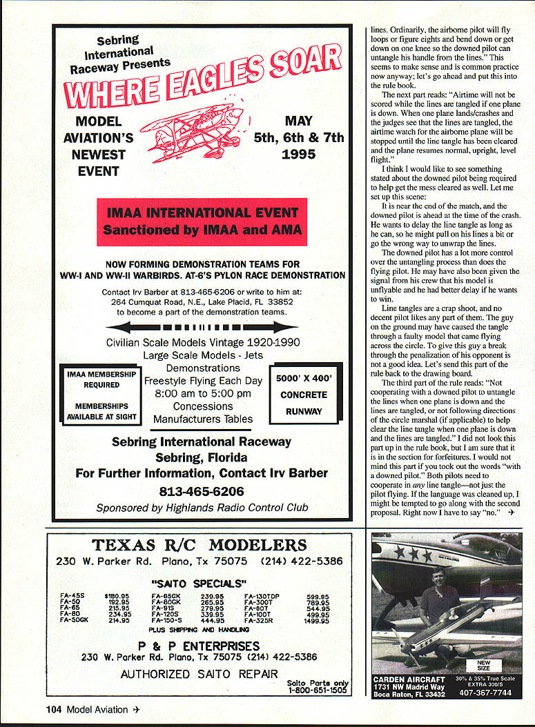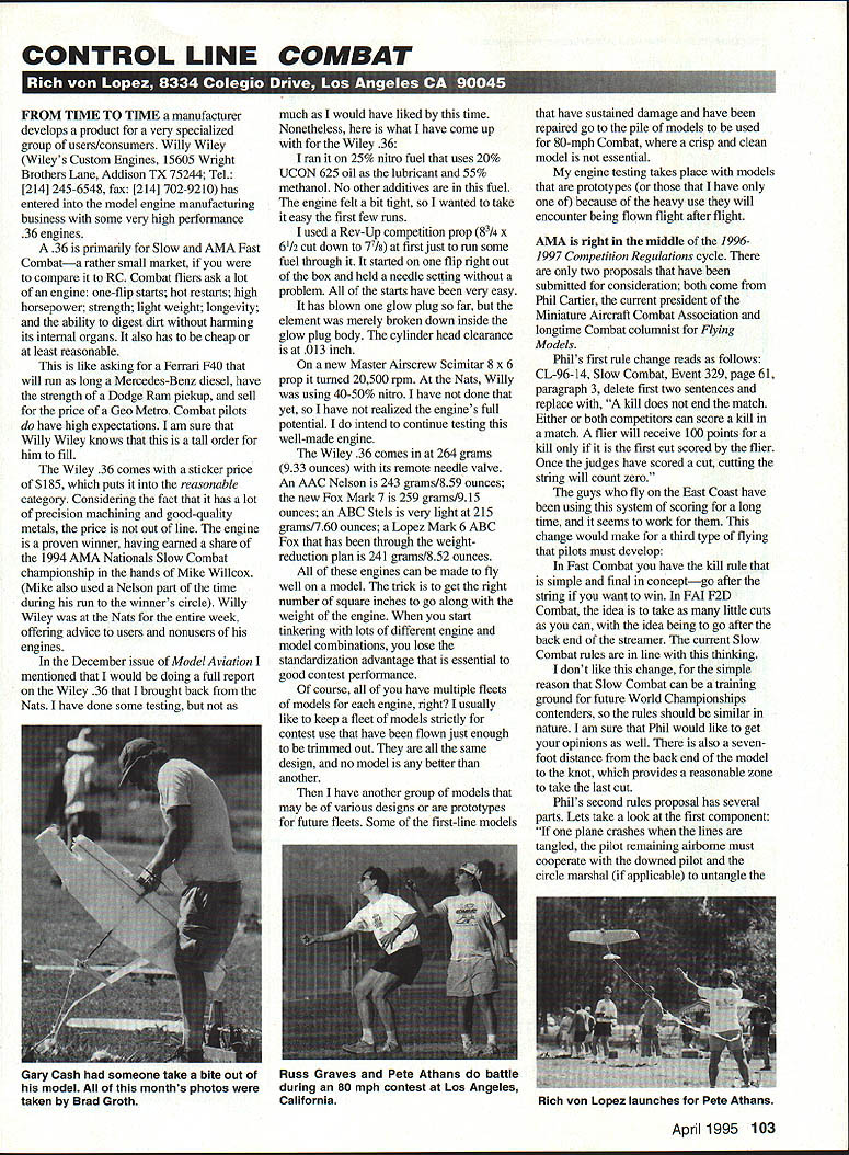 CONTROL LINE COMBAT FROM TIME TO TIME manufacturer develops product very specialized group users/consumers Willy Wiley Wileys Custom Engines 15605 Wright Brothers Lane Addison TX 75244 Tel [214] 245-6548 fax [214] 702-9210 has entered model engine manufacturing business some very high performance 36 engines 36 primarily Slow AMA Fast Combata rather small market compare RC Combat fliers ask lot engine one-flip starts hot restarts high horsepower strength light weight longevity ability digest dirt harming its internal organs also has cheap least reasonable like asking Ferrari F40 will run long Mercedes-Benz diesel have strength Dodge Ram pickup sell price Geo Metro Combat pilots have high expectations am sure Willy Wiley knows tall order him fill Wiley 36 comes sticker price $185 puts reasonable category Considering fact has lot precision machining good-quality metals price out line engine proven winner having earned share 1994 AMA Nationals Slow Combat championship hands Mike Willcox Mike also used Nelson part time during run winners circle Willy Wiley Nats entire week offering advice users nonusers engines December issue Model Aviation mentioned would doing full report Wiley 36 brought back Nats have done some testing much would have liked time Nonetheless what have come up Wiley 36 ran 25% nitro fuel uses 20% UCON 625 oil lubricant 55% methanol No other additives fuel engine felt bit tight wanted take easy first few runs used Rev-Up competition prop 8/4 x 61/2 cut down 7/i first just run some fuel through started flip right out box held needle setting problem starts have very easy has blown glow plug far element merely broken down inside glow plug body cylinder head clearance 013 inch new Master Airscrew Scimitar 8 x 6 prop turned 20500 rpm Nats Willy using 40-50% nitro have done yet have realized engines full potential intend continue testing well-made engine Wiley 36 comes 264 grams 933 ounces its remote needle valve An AAC Nelson 243 grams/859 ounces new Fox Mark 7 259 grams/915 ounces ABC Stels very light 215 gramsl760 ounces Lopez Mark 6 ABC Fox has through weightreduction plan 241 grams/852 ounces engines can made fly well model trick get right number square inches go along weight engine start tinkering lots different engine model combinations lose standardization advantage essential good contest performance course have multiple fleets models engine right usually like keep fleet models strictly contest use have flown just enough trimmed out same design no model better another have another group models may various designs prototypes future fleets Some first-line models have sustained damage have repaired go pile models used 80-mph Combat crisp clean model essential engine testing takes place models prototypes have because heavy use will encounter being flown flight after flight AMA right middle 19961997 Competition Regulations cycle two proposals have submitted consideration both come Phil Cartier current president Miniature Aircraft Combat Association longtime Combat columnist Flying Models Phils first rule change reads follows CL-96-14 Slow Combat Event 329 page 61 paragraph 3 delete first two sentences replace kill does end match Either both competitors can score kill match flier will receive 100 points kill first cut scored flier Once judges have scored cut cutting string will count zero guys fly East Coast have using system scoring long time seems work change would make third type flying pilots must develop Fast Combat have kill rule simple final conceptgo after string want win FM F2D Combat idea take little cuts can idea being go after back end streamer current Slow Combat rules line thinking dont like change simple reason Slow Combat can training ground future World Championships contenders rules should similar nature am sure Phil would like get opinions well also sevenfoot distance back end model knot provides reasonable zone take last cut Phils second rules proposal has several parts Lets take look first component plane crashes lines tangled pilot remaining airborne must cooperate downed pilot circle marshal applicable untangle April 1995 103 Gary Cash someone take bite out model months photos taken Brad Groth Russ Graves Pete Athans battle during 80 mph contest Los Angeles California Rich von Lopez launches Pete Athans Sebring International Raceway PresentS AVIATIONS-5th 6th & 7th NEWEST1995 EVENT NOW FORMING DEMONSTRATION TEAMS FOR WW-I AND WW-lI WARBIRDS AT-6S PYLON RACE DEMONSTRATION Contact Irv Barber 813-465-6206 write him 264 Cumquat Road NE Lake Placid FL 33852 become part demonstration teams mm 11111 EU Civilian Scale Models Vintage 1920-1990 Large Scale Models Jets Demonstrations1• Freestyle Flying Day 15000x 400fl 800 am 500 pmCONCRETE Concessions i RUNWAY Manufacturers Tables Sebring International Raceway Sebring Florida Further Information Contact Irv Barber 813465-6206 Sponsored Highlands Radio Control Club 104 Model Aviation s Ordinarily airborne pilot will fly loops figure eights bend down get down knee downed pilot can untangle handle lines seems make sense common practice now anyway lets go ahead put rule book next part reads Airtime will scored lines tangled plane down plane lands/crashes judges see lines tangled airtinie watch airborne plane will stopped until line tangle has cleared plane resumes normal upright level flight think would like see something stated about downed pilot being required help get mess cleared well Let set up scene near end match downed pilot ahead time crash wants delay line tangle long can might pull lines bit go wrong way unwrap lines downed pilot has lot control over untangling process does flying pilot may have also given signal crew model unflyable better delay wants win Line tangles crap shoot no decent pilot likes part guy ground may have caused tangle through faulty model came flying across circle give guy break through penalization opponent good idea Lets send part rule back drawing board third part rule reads coopera