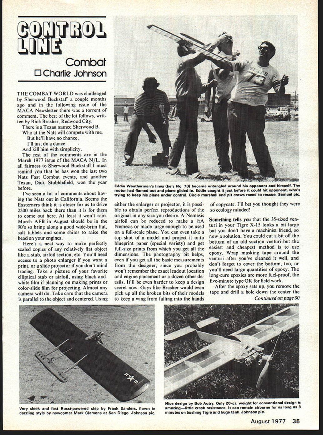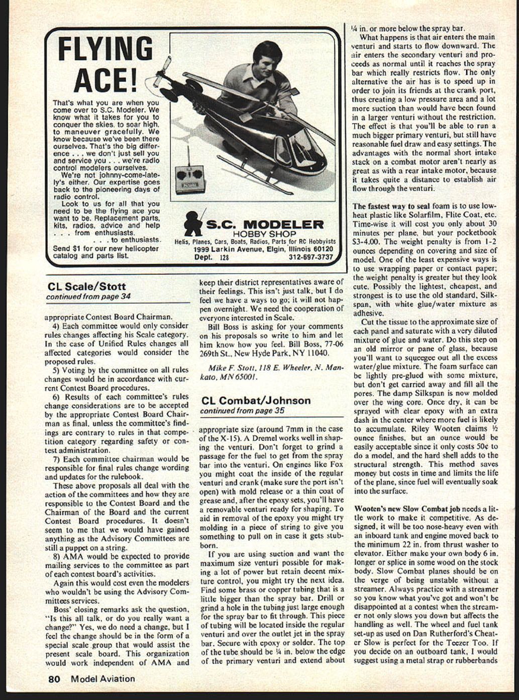Combat 0 Charlie Johnson THE COMBAT WORLD challenged Sherwood Buckstaff couple months ago following issue MACA Newsletter torrent comment best lot follows writ ten Rich Brasher Redwood City Texan named Sherwood B Nats will compete hell have no chance Ill just dance kill him simplicity rest comments March 1977 issue MACA N/L fairness Sherwood Buckstaff must remind has won last two Nats Fast Combat events another Texan Dick Stubblefield won year before Ive seen lot comments about hav ing Nats out California Seems Easterners think closer us drive 2200 miles back come out least wont rain March AFB August should 90s bring along good wide-brim hat salt tablets some shims raise head engines Heres neat way make perfectly scaled copies relatively flat object like stab airfoil section etc Youll need access photo enlarger want print slide projector dont mind tracing Take picture favorite elliptical stab airfoil using black-andwhite film planning making prints color-slide film projecting Almost camera will Take care camera parallel object centered Using either enlarger projector possi ble obtain perfect reproductions original size desire Nemesis airfoil can reduced make /2A Nemesis made large enough used full-scale plane can take top shot model project onto blueprint paper special variety get full-size prints get dimensions photography bit helps get basic measurements designer since probably wont remember exact leadout location engine placement dozen other de tails Itll harder keep design secret now Guys like Brasber would pick up broken bits models keep wing falling hands copycats Ill bet thought ecology minded Something tells 35-sized ven turi Tigre X-15 looks bit large dont have machinist friend now solution could cut bit off bottom old suction venturi easiest cheapest method use epoxy Wrap masking tape around venturi after youve cleaned well dont forget cover bottom too youll need large quantities epoxy long-cure epoxies fuel-proof five-minute type OK field work After epoxy sets up remove tape drill hole down center Continued page 80 August1977 35 Eddie Weathermans lines hes No 73 became entangled around opponent himself motor hed flamed Out plane glided Eddie caught just before could hit opponent whos trying keep plane under control Circle marshall pit crews raced rescue Samuel pic Very sleek fast Rossi-powered ship Frank Sanders flown dazzling style newcomer Mark Clemens San Diego Johnson pic Nice design Bob Autry Only 20-oz weight conventional design amazinglittle crash resistance can remain airborne long 8 minutes bushing Tigre huge tank Johnson pic FLYING ACE Thats what you come over SC Modeler know what takes conquer skies soar high maneuver gracefully know because weve ourselves Thats big differ ence nt just sell service dio control modelers ourselves johnny-come-late lys either expertise goes back pioneering days radio control Look us need flying ace want Replacement parts kits radios advice help husiasts enthusiasts Send $1 new helicopter catalog parts list CL ScalelStott continued page 34 appropriate Contest Board Chairman 4 Each committee would consider rules changes affecting Scale category case Unified Rules changes affected categories would consider proposed rules 5 Voting committee rules changes would accordance cur rent Contest Board procedures 6 Results committees rules change considerations accepted appropriate Contest Board Chair man final unless committees find ings contrary rules compe tition category regarding safety con test administration 7 Each committee chairman would responsible final rules change wording updates rulebook above proposals deal action committees responsible Contest Board Chairman Board current Contest Board procedures doesnt seem would have gained anything Advisory Committees still puppet string 8 AMA would expected provide mailing services committee part contest boards activities Again would cost modelers wouldnt using Advisory Com mittees services Boss closing remarks ask question talk really want change Yes need change feel change should form special scale group would assist present scale board organization would work independent AMA SC MODELER HOBBY SHOP Helis Planes Cars Boats Radios Parts RC Hobbyists 1999 Larkin Avenue Elgin Illinois 60120 Dept 128312-697-3737 keep district representatives aware feelings isnt just talk feel have ways go will hap pen overnight need cooperation everyone interested Scale Bill Boss asking comments proposals write him let him know feel Bill Boss 77-06 269th St New Hyde Park NY 11040 Mike F Stoti 118 E Wheeler N Man kato MN 65001 CL Combat/Johnson continued page 35 appropriate size around 7mm case X- 15 Dremel works well shap ing venturi Dont forget grind passage fuel get spray bar venturi engines like Fox might coat inside regular venturi crank make sure port isnt open mold release thin coat grease after epoxy sets youll have removable venturi ready shaping aid removal epoxy might try molding piece string give something pull case gets stub born using suction want maximum size venturi possible mak ing lot power retain decent mix ture control might try next idea Find some brass copper tubing little bigger spray bar Drill grind hole tubing just large enough spray bar fit through piece tubing will located inside regular venturi over outlet jet spray bar Secure epoxy solder top tube should w edge primary venturi extend about below spray bar What happens air enters main venturi starts flow downward air enters secondary venturi pro zeeds normal until reaches spray bar really restricts flow alternative air has speed up order join its friends crank port thus creating low pressure area lot suction would have found larger venturi restriction effect youll able run much bigger primary venturi still have reasonable fuel draw easy settings advantages normal short intake stack combat motor arent nearly great rear intake motor because takes quite distance establish air flow through venturi fastest way seal foam use lowheat plastic like