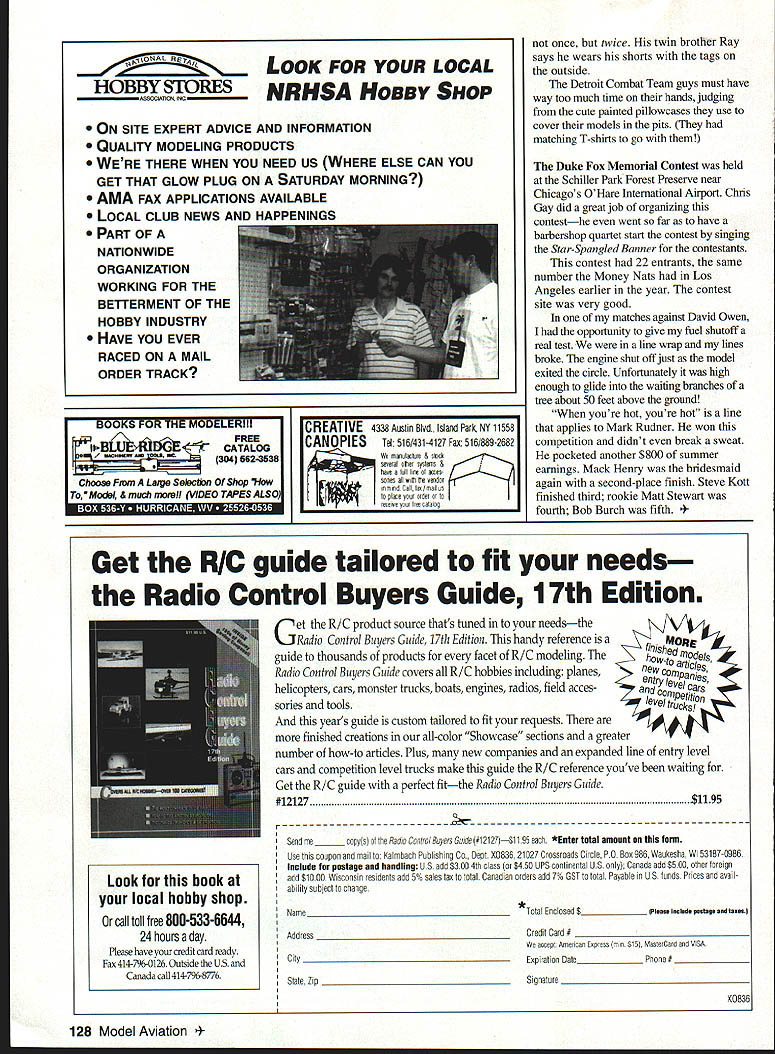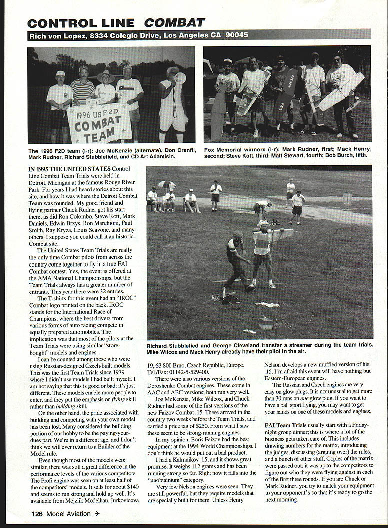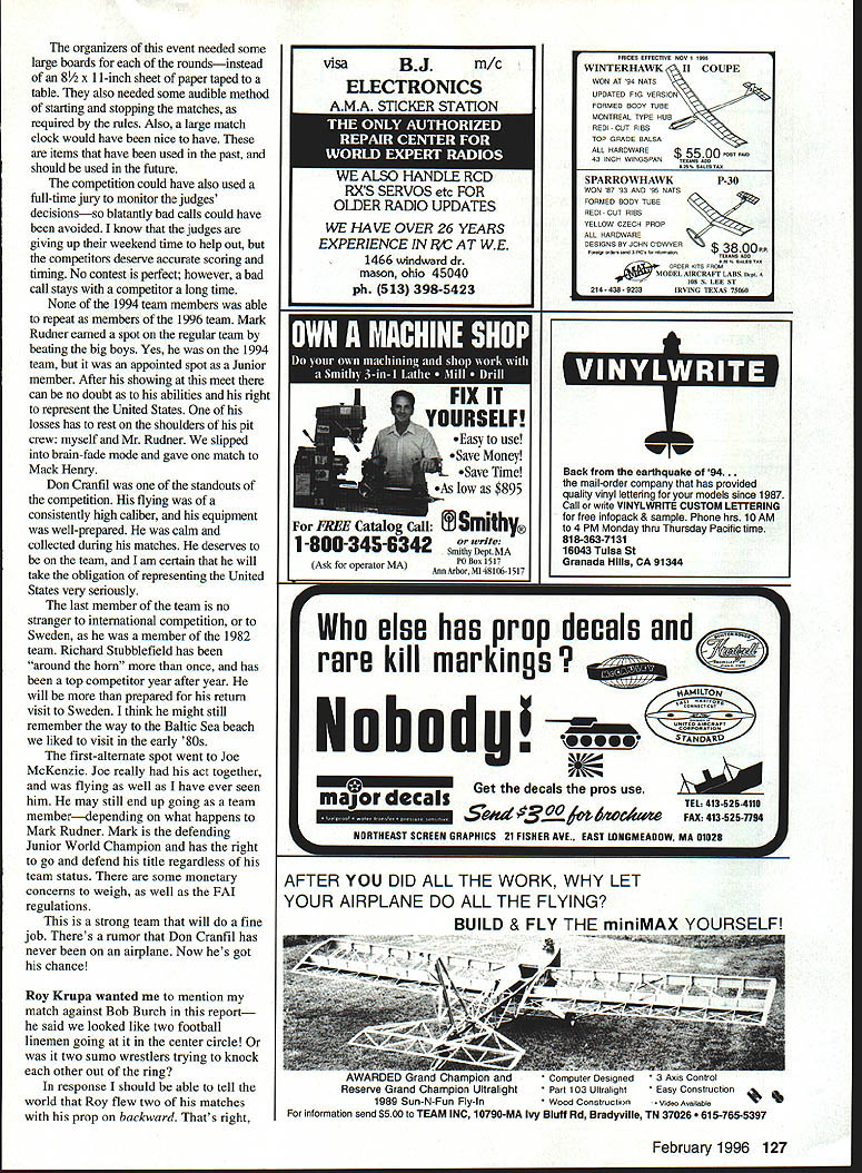 CONTROL LINE COMBAT 1 [e4aUIigu @I 995 THE UNITED STATES Control Line Combat Team Trials held Detroit Michigan famous Rouge River Park years heard stories about site Detroit Combat Team founded good friend flying partner Chuck Rudner got start did Ron Colombo Steve Kott Mark Daniels Edwin Brzys Ron Marchioni Paul Smith Ray Kryza Louis Scavone others suppose could call historic Combat site United States Team Trials really time Combat pilots across country come together fly true FAI Combat contest Yes event offered AMA National Championships Team Trials always has greater number entrants year 32 entries T-shirts event IROC Combat logo printed back IROC stands International Race Champions best drivers various forms auto racing compete equally prepared automobiles implication pilots Team Trials using similar store bought models engines can counted among using Russian-designed Czech-built models first Team Trials since 1979 didnt use models built myself am saying good bad its just different models enable people enter put emphasis flying skill rather building skill other hand pride associated building competing own model has lost considered building portion hobby paying-yourdues part different age dont think will ever return Builder Model rule though models similar still great difference performance levels various competitors Profi engine seen least half competitors models sells about $140 seems run strong hold up well Its available Mejzlik Modelbau Jurkovicova 1963 800 Brno Czech Republic Europe Tel/Fax 01142-5-529400 also various versions Doroshenko Combat engines come AAC ABC versions both run very well Joe McKenzie Mike Wilcox Chuck Rudner some first versions new Faizov Combat 15 arrived country two weeks before Team Trials carried price tag $250 what saw seem strong-running engines opinion Boris Faizov best equipment 1994 World Championships dont think would put out bad product Kalmnikov 15 shows great promise weighs 112 grams has running strong far Right now falls unobtainium category Very few Nelson engines seen still powerful require models specially built Unless Henry Nelson develops new muffled version 15 Im afraid event will have nothing Eastern-European engines Russian Czech engines very easy glow plugs unusual get 30 runs glow plug want have ball sport flying may want get hands models engines FAI Team Trials usually start Friday aight group dinner lot business gets taken care includes drawing numbers matrix introducing judges discussing arguing over rules bunch other stuff Copies matrix passed out up competitors figure out flying against first three rounds Chuck Mark Rudner try match equipment opponents its ready go next morning 126 Model Aviation 96 F2D team l-r Joe McKenzie alternate Don Cranfil Mark Rudner Richard Stubblefield CD Art Adamisin Fox Memorial winners l-r Mark Rudner first Mack Henry second Steve Kott third Matt Stewart fourth Bob Burch fifth Richard Stubblefied George Cleveland transfer streamer during team trials Mike Wilcox Mack Henry already have pilot air organizers event needed some large boards roundsinstead 81/2 X 11-inch sheet paper taped table also needed some audible method starting stopping matches required rules Also large match clock would have nice have items have used past should used future competition could have also used full-time jury monitor judges decisionsso blatantly bad calls could have avoided know judges giving up weekend time help out competitors deserve accurate scoring timing No contest perfect however bad call stays competitor long time None 1994 team members able repeat members 1996 team Mark Rudner earned spot regular team beating big boys Yes 1994 team appointed spot Junior member After showing meet can no doubt abilities right represent United States losses has rest shoulders pit crew myself Mr Rudner slipped brain-fade mode gave match Mack Hemy Don Cranfil standouts competition flying consistenfly high caliber equipment well-prepared calm collected during matches deserves team am certain will take obligation representing United States very seriously last member team no stranger international competition Sweden member 1982 team Richard Stubblefield has around horn once has top competitor year after year will prepared return visit Sweden think might still remember way Baltic Sea beach liked visit early 80s first-alternate spot went Joe McKenzie Joe really act together flying well have ever seen him may still end up going team memberdepending what happens Mark Rudner Mark defending Junior World Champion has right go defend title regardless team status some monetary concerns weigh well FAI regulations strong team will fine job Theres rumor Don Cranfil has never airplane Now hes got chance Roy Krupa wanted mention match against Bob Burch report said looked like two football linemen going center circle two sumo wrestlers trying knock other out ring response should able tell world Roy flew two matches prop backward Thats right visaBJrn/c ELECTRONICS ATtCi1d February 1996 127 LktVU etc i-UK OLDER RADIO UPDATES WE HAVE OVER 26 YEARS EXPERIENCE IN IiC AT WE 1466 windward dr mason ohio 45040 ph 513 398-5423 PRICES EFFECTIVE Nov lOSS WINTERHAWK II COUPE WON AT 94 NATS UPDATED FiG VERSION FORMED BODY TUBE MONTREAL TYPE HUB REDI CUT RIBS TOP GRADE BALSA ALL HARDWARE 43 INCH WINGSPANOECSIIS MOO SPARROWHAWKP-30 WON 57 03 AND RN NATE FORMED BODY TUBE REDI CUT RIBS YELLOW CZECH PROP ALL HARDWARE DESIGNS BY JOHN ODWYER FOW 00000 00AS RCA COCOORCPP S OTS FROM AIRCRAFT LABS 11050 11 IRS S LEE ST ISO TEXAS 75R6B FREE Catalog Call J Smithy write 1 -uuu-q-j4 5mvthY Dept MA Ask operator MA Box 1517 Ann Arbor MI 48106 1517 Back earthquake of94. mail-order company has provided quality vinyl lettering models since 1987 Call write VINYLWRITE CUSTOM LETTERING free infopack & sample Phone hrs 10 AM 4 PM Monday thru Thursday Pacific time 818-363-7131 16043 Tulsa St Granada Hills CA 91344 else has prop decals rare kill markings No bed USTANDARD major decalsGet de
