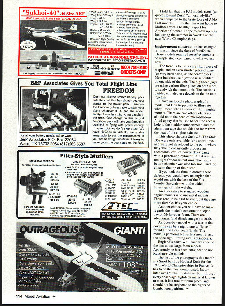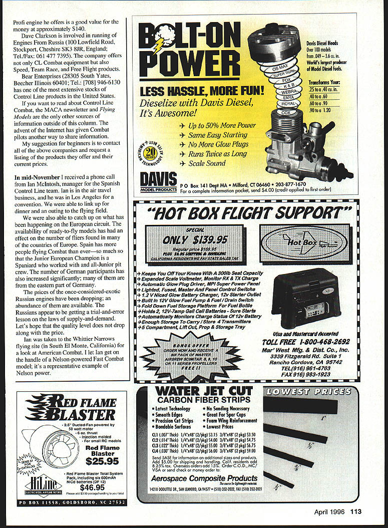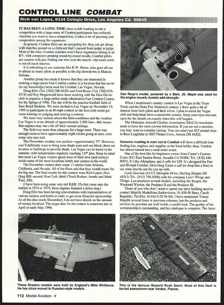 CONTROL LINE COMBAT IT HAS BEEN LONG TIME since club wanting run competition large entry Combat participants has surfaced Anytime want run competition takes lot planning cooperation among organizers general Combat fliers easygoing lot can get along matches posted clipboard thats passed judge judge Most time Combat matches wont have organizers sitting RV computers printing round-by-round results Combat pilots content just finding out won matchthe exact score much interest refreshing see someone like RW Howe goes all-out attract pilots possible big showdown Muncie Indiana Another group has made known interested running large-purse Fast Combat contest location has never knowledge used Combat Las Vegas Nevada Doug Ellis Tel [702] 368-6328 Fred Reese Tel [702] 8764718 Roy Heppenstall have working Dust Devils club organize large-dollar triple-elimination Fast Combat Contest Spring 1996 site will practice football field Sam Boyd Stadium invited Las Vegas November 19 1995 participate 80-mph contest host club could get some training judging running contest very curious about field conditions weather Las Vegas altitude approximately 2500 feetthis means engines may run bit off normal settings field adequate large meet enough room have approximately eight circles going once over some very nice turf November weather perfectapproximately 750 However youll definitely want bring shade tents sun block no trees buildings provide shade Las Vegas can brutal summer temperatures regularly reaching 1150 plus Keep mind Las Vegas visitors spend time money inside some luxurious hotels casinos world November contest drew some 17 entries Arizona California Nevada fliers said would return big final results contest Rich Lopez first Greg Hill second Ron Cash third Chuck Rudner fourth Mark Tiret fifth have using some very old K&B 35s came onto market 1974 1975 engines featured dykes ring Doug Ellis has having conversations representatives various casinos hotels order get some financial sponsorship As date early December have details amount money involved target date contest sometime late April early May 1996 mentioned money contest Las Vegas Team Trials Duke Fox Memorial contest drew quite bit interest both pilots wives plan assist Vegas club help have successful contest Keep eyes ears open details exactly will happen Miniature Aircraft Combat Association MACA newsletter tends have current information member may want consider joining can send $15 annual dues Ross Leighliter 3007 Pirates Cove Aurora OH 44202 Someone wanting start out Combat will have difficult time finding kits engines supplies local hobby shop Combat has almost turned mail-order event best kits beginners comes Carters Custom Cores 912 East Sandra Street Arcadia CA 91006 Tel [818] 4460097 Its Allenplane sells $29 Its designed Fast 80-mph Combat Give Greg Carter call drop him line see what else can fix up Louis Scavone 41312 Memphis Drive Sterling Heights MI 48313 Tel [313] 739-3058 calls company Lous Wings Things Lou produces several models including Reaper Weekend Warrior Predator II Predator III dont want spend time building need contact Mejzlik Modellbau Jurkovicova 19 638 00 Brno Czech Republic TelIFax 01142-5-529400 have mentioned Tomas Mejzlik several times previous columns products services provides well worth careful look quality workmanship outstanding catalogue complete latest 112 Model Aviation Repps model powered Stels 35 Maple used engine mount dowels add strength Shadow models built Englands Mike Whillance has since moved Russian-style models famous Howard Rush Snort Most fleet buried somewhere near Verdun France Profi engine offers good value money approximately $140 Dave Clarkson involved running Engines Russia 100 Lowfield Road Stockport Cheshire SK3 SIR England TelIFax 061 477 7395 company offers CL Combat equipment also Speed Team Race Free Flight products Bear Enterprises 28305 South Yates Beecher Illinois 60401 Tel [708] 946-6130 has extensive stocks Control Line products United States want read about Control Line Combat MACA newsletter Flying Models other sources information outside column advent Internet has given Combat pilots another way share information suggestion beginners contact above companies request listing products offer current prices mid-November received phone call Ian McIntosh manager Spanish Control Line team Ian air travel business Los Angeles convention able link up dinner outing flying field also able catch up what has happening European circuit avallability ready-to-fly models has effect number fliers found countries Europe Spaln has people flying Combat everso much Junior European Champion Spaniard worked all-Junior pit crew number German participants has also increased significantly eastern part Germany prices once-considered-exotic Russian engines have dropping abundance avallable Russians appear getting trial-and-error lesson laws supply-and-demand Lets hope quality level does drop along price Ian taken Whittier Narrows flying site South El Monte California look American Combat let Ian get handle Nelson-powered Fast Combat model its representative example Nelson power T-ON OWEN LESS HIISSLEMUERIN Dieselize Davis Diesel Its Awesome 0% Power Easy Starting iS4 No Glow Plugs Runs Twice Long e Sound DAVIS P0 Box141 De1MAMilfordCTQ646O MODEL S complete rmation packet send $400 cr WATER JET CUT CARBON FIBER STRIPS Latest Technology No Sanding Necessary Smooth Edges Great Far Spar Caps Predsion Cut Strips Foam Wing Reinforcement Bondable Surfaces Lowest Prices CLi 1007 Thick 1/4s48 12/pkgl S315 3/8x48 2 pkgl $350 CL2 014 Thick 1/4x4F 2Ipkgl S40l 3/8x48 12 pkgl $475 CU 122 Thick 1/4x4F 12/pkgl $500 3/8x48 2 pkgl $615 CL4 130 Thick 1/4x48 12/pkgl $600 3/8x48 2 pkg $900 Send SASE br inbormotion additional sizes roducts Add $500 shipping cod handlina calif resicFents add 825% tax Overseas orders add 15% OrdercOD MCI VISA send check money order Aerospace CompositeProducts 14210 DOOLIIILE OR SAN LEANDRO 94577 3522022 FAX