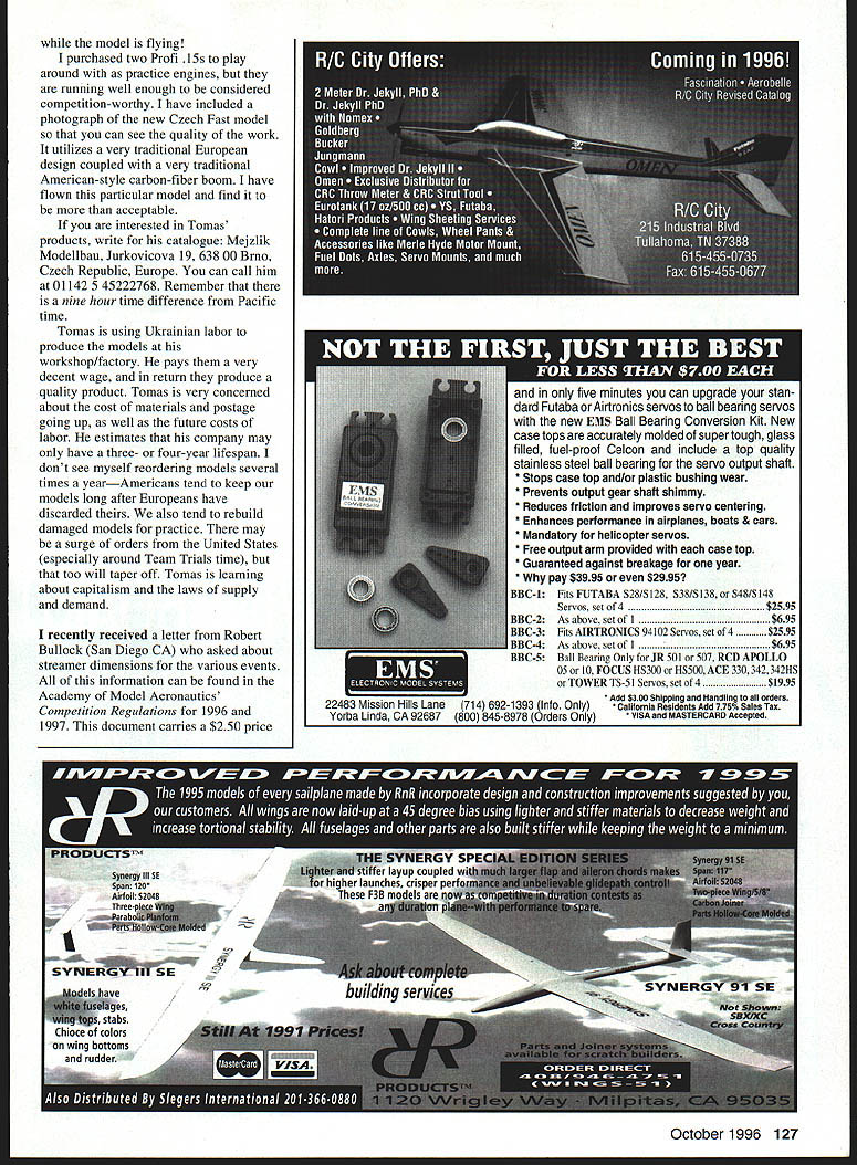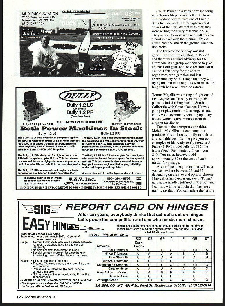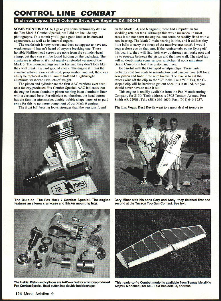 CONTROL LINE COMBAT i [1 uI1 U We] z ru 11 LI SOME MONTHS BACK gave some preliminary data Fox Mark 7 Combat Special did include photographs month youll get good look its outward appearance well its internal organs crankshaft very robust does appear have weaknessesI havent heard anyone breaking horrible Phillips-head screws gone cylinder-bead clamp can still found holding backplate crankcase all-new its merely retooled version Mark 6 mounting lugs thicker dont look like will break hard ground check engine still has standard all-steel crankshaft stud prop washer nut can easily replaced titanium bolt lightweight aluminum washer save lots weight piston cylinder first AAC versions ever seen factory-produced Fox Combat Special AAC indicates engine has aluminum piston running aluminum liner chromed bore efficient combustion head button has familiar aftermarket double-bubble shape us paid extra get oomph out Mark 6 engines front ball bearing looks stronger versions found Mark 3 4 6 engines reputation shedding retainer tabs Although nuisance cases did harm engine could readily fixed new bearing Mark 7 main bearing thin utilizes tiny little balls carry stress massive crankshaft would keep close eye part retainer tabs come flying off bearing will find way up through intake port try squeeze between piston liner wall steel tab will no doubt make some serious scratches miniature Grand Canyon both piston liner careful G-shaped wristpin clips parts probably cost two cents manufacture can cost $60 new piston liner wire breaks cure cut excess wire off clip G looks like C Yes Cshaped clip will harder get out once installed should never have take out engine readily available Fox Manufacturing Company $150 address 5305 Towson Avenue Fort Smith AR 72901 Tel 501 646-1656 Fax 501 646-1757 Las Vegas Dust Devils went great deal trouble 124 Model Aviation ide Fox Mark 7 Combat Special engine Gary Minor sons Gary Andy finished first features all-new crankcase thicker mounting lugs second Tucson Top Gun Contest See text Inside Piston cylinder AACa first factory-produced Fox Combat Special Head button has double-bubble shape ready-to-fly Combat model available Tomas Mejzliks Meizilk Modellbau $40 Text has details address prepare major-league Fast Combat contest May 18-19 1996 Both Contest Manager Doug Ellis Contest Director Fred Reese did tremendous amount work get field Sam Boyds Silver Bowl Stadium paid prepared competition local Boy Scouts set cook up hot lunch competitors field cost club $150 per day also postage printing trophy miscellaneous costs take account morning 18th approximately 25 pilots over country attendance pilot Tomas Mejzlik came way Czech Republic participate competition wind blowing fairly good rate forecast indicated wind would get stronger day wore few bolder pilots decided put up some test flights see models would respond high winds locals Roy Heppenstall proceeded yank bellcrank out model due extra strain wind David Owen put up flight Nelson-powered Czech models tethered 021 lines ended up breaking lines rekitting model process pilots talked about waiting several hours see wind would die down never happened decided wait until Sunday morning hold double-elimination contest weather permitted Things could have deadly Las Vegas Las Vegas affords lot entertainment some hightech hotels face earth quickly changed competition Combat pilots tourists Diamond Jim Bradys WEVE GOT THE CURE. WHETHER YOURE TORN RIPPED SHREDDED FRAZZLED SMASHED CRUSHED CRACKED CHIPPED FRAC TURED SPLIT SNAPPED SHAITERED OR JUST LIITEL BIT STRESSED Sheldons epoxy products have long known strength flexibility reliability reasonable prices Whether choose quick setting 5minute field repair just hurry extremely strong 30minute can confident using best price 27625 MIX EPOXY 8oz596 276312 MIX EPOXY 8oz596 276430 MIX EPOXY 8oz596 27595 MIX EPOXY 9oz749 276015 MIN EPOXY Ooz749 276130 MIN EPOXY 9ez749 have marketing POSI-CURE since 1984 have always best product avail able modeler absolute lowest possi ble price always assured finest adhesives available POSI-CURE products specially formulated very best avalable raw materials use no second grade stock warehouse inventory stored refriger ated maintain very best quality possible Lots imitators good POSI-CURE modelers choice 2752 POSI-CURE THIN 2oz 539 2753POSI-CURE GAP-FILLING 2oz539 2754P051-CURE THIN loz349 2755P051-CURE GAP FILLING Ioz 349 2756INSTA-SET SPRAY 2oz349 2757INSTA-SET REFILL lOoz796 2758IJNCtJRE DEBONDER Ioz296 SHELDONS HOBBIES 2135 OLD OAKLAND ROAD SAN JOSE CA 95131 SHIPPING UPS Ground Continental USA $595 UPS 2nd DAY AIR & UPS NEXT DAY AIR available COO OK add $550 COD fee October1996 125 Bully 12 LS Long stroke Bully 12 PR7 PresoisIon Race CALL NOW ON OUR 800 LINE Bully 1215 e S398BullY 12 PR Price $298 Both Power Machines Stock Bully 12 LSBully 12 PR Bully 1215 Has thrust compared against Bully 12 PR has thrust compared against newest major four stroke using 15 35 percent WEBRA Speed sIx different propellers nitro fuel cases Bully out performed 14X10 16X12 ail cases Bully out other engine 5 20 Percent thrust did performed WEBRA 5 18 percent best 16X14 ends 16X16 APO Propeller thrust IOXS ends 16X10 APC propeller Bully 121515 designed high torque low RPM propellers up 18 Inch two stroke ow maintenance Ngh performance engine dual plug reliability end bulit pump regulator Bully 12 IS rear exheust engine available accessories header tuned pipe muffler Bully 12 PR isa full moe engine flyers want fastest fotwerd speed special airoreft two stroke also low maIntenance high performance engine duel plug reliability buiit pump end regulator Accessories 4 muffler types end soft mount BULLY engines limited production end may crderedU AV Inc800 -294- 9506Z 8OOAM-6OOPM Mon-Sat direct UAV IncPacific Time PO Box 1548 BEND OREGON 97709 * PHONE 541-382-5409 FAX 541-335-0117 Chuck Rudner has corresponding Tomas Mejzlik effort have him produce several versions old Stels fuel shut-offs broug