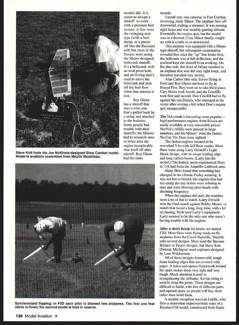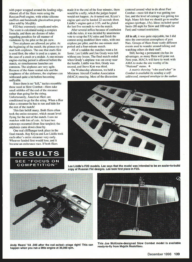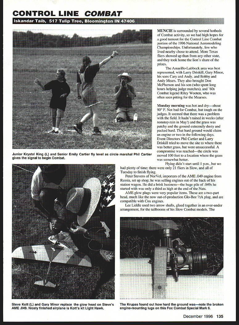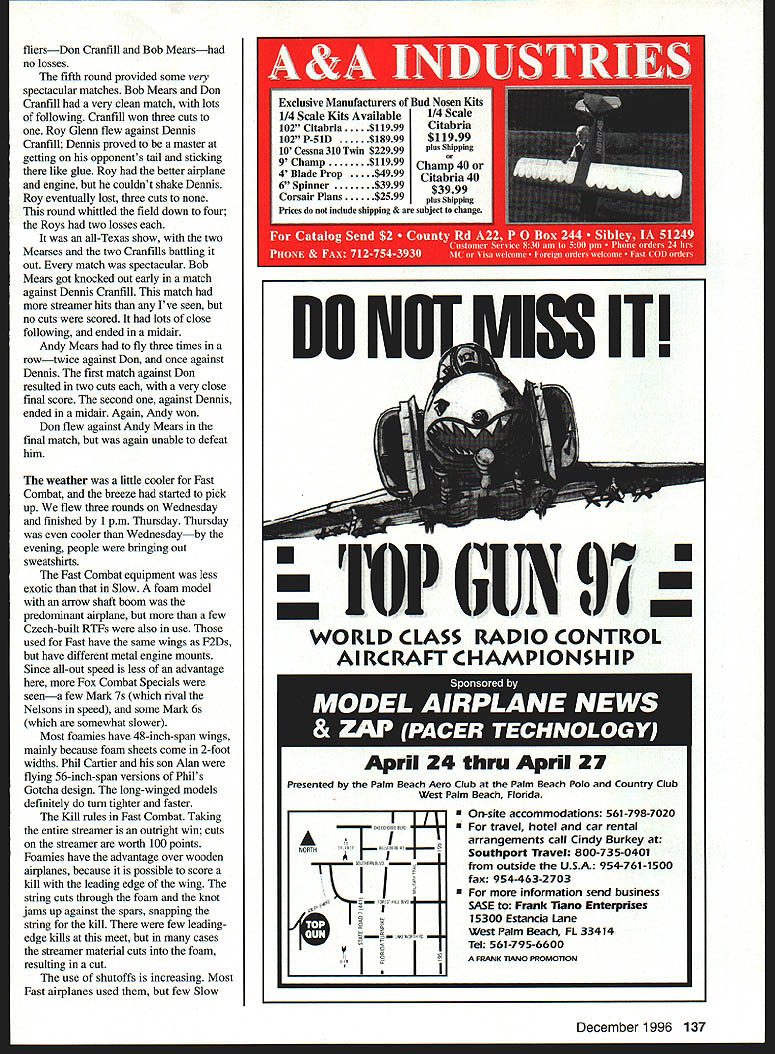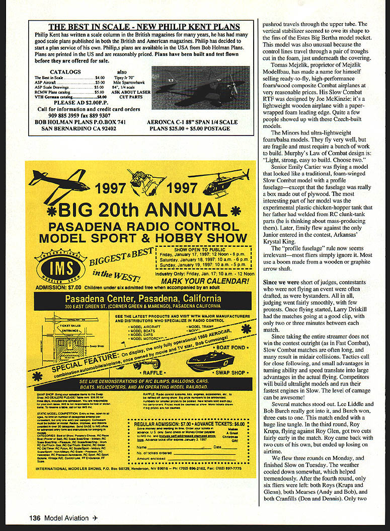 CONTROL LINE COMBAT MUNCIE surrounded several hotbeds Combat activity high hopes good turnout Control Line Combat portion 1996 National Aeromodeling Championships Unfortunately few lived nearby chose attend Texas fliers showed up other state took home lions share pnzes Amarillo-Lubbock area best represented Larry Driskill Gary Minor sons Cary Andy Bobby Andy Mears also brought Don McPherson son spent long hours helping judge matches 60s Combat legend Riley Wooten often seen pitting Mearses Monday morning hot dryabout 900 F bad Combat tough judges seemed problem field hadnt rained weeks after nonstop rain May grass patchy ground extremely dusty packed hard hard ground would claim engine two following days Event Directors Phil Cartier Larry Driskill tried move site better grass unsuccessful compromise reachedthe circle moved 100 feet location grass somewhat better Flying didnt start until 1 pm plenty time 21 fliers Slow Tuesday finish flying Peter Stevens NorVel importers AME 049 engine Russia set up shop selling engines out back station wagon did brisk businessthe huge pile 049s started third high end Nats AME glow plugs very popular items two-part head much like now out-of-production Gb-Bee 1/2A plug compatible Cox engines Lee Liddle used two arrow shafts glued together over-under arrangement tailbooms Slow Combat models December 1996 135 Junior Krystal King L Senior Emily Cartier fly level circle marshal Phil Cartier gives signal begin Combat Steve Kott L Gary Minor replace glow head Steves AME 049 Nicely finished airplane Kotts kit Light Hawk Krupas found out hard ground wasnote broken engine-mounting lugs Fox Combat Special Mark 6 THE BEST IN SCALE NEW PHILIP KENT PLANS Philip Kent has written scale column British magazines years has good scale plans published both British American magazines Philip has decided start plan service own Philips plans available USA Bob Holman Plans Plans printed US reasonably priced Plans have built test flown before offered sale CATALOGS TheBestmScale$400 ASP Aircraft55 00 ASP Scale Drawings5500 RCMW Plans catalog$500 VIII Gcrmaa catalogSICO PLEASE AD S2OOPP Call for information credit card orders 909 885 3959 fax 889 9307 BOB HOLMAN PLANS POBOX 741 SAN BERNARDINO CA 92402 also Tipsy Jr 70 Mile Sparrowhawk 84 1/4 scale ASK ABOUT LASES CUT PARTS *BIG 20th ANNUAL* PASADENA RADIO CONTROL MODEL SPORT & HOBBY SHOW ~0~~ fl 8140W OPEN TO PUBLICI &PL Friday January 17 1W7 12 Noon -6pm Saturday January16 1997 10am -6pm Sunday January 19 1997 10am -5 pm inIndustry Only Friday Jan 17 10am- 12 Noon MARK VOUP tAI1ENDARI pushrod travels through upper tube vertical stabilizer seemed owe its shape fins Estes Big Bertha model rocket model also unusual because control lines travel through pair troughs cut foam just underneath covering Tomas Mejzlik proprietor Mejzlik Modellbau has made name himself selling ready-to-fly high-performance foam/wood composite Combat airplanes very reasonable prices Slow Combat RTF designed Joe McKinzie its lightweight wooden airplane paperwrapped foam leading edge Quite few people showed up Czech-built models Minors ultra-lightweight foam/balsa models fly very well fragile must require bunch work build Murphys Law Combat design Light strong easy build Choose two Senior Emily Cartier flying model looked like traditional foam-winged Slow Combat model profile fuselageexcept fuselage really box made out plywood interesting part model experimental plastic chicken-hopper tank father welded RC clunk-tank parts thinking about mass-producing Later Emily flew against Junior entered contest Arkansas Krystal King profile fuselage rule now seems irrelevantmost fliers simply ignore Most use boom made wooden graphite arrow shaft Since short judges contestants flying event often drafted bystanders judging went fairly smoothly few protests Once flying started Larry Driskili matches going good clip two three minutes between match Since taking entire streamer does win contest outright Fast Combat Slow Combat matches often long result midair collisions Tactics call close following small advantages turning ability speed translate large advantages actual flying Competitors will build ultralight models run fastest engines Slow level carnage can awesome Several matches stood out Lee Liddle Bob Burch really got Burch won three cuts match ended huge line tangle third round Roy Krupa flying against Roy Glen got two cuts fairly early match Roy came back two cuts own ended up losing airtime flew three rounds Monday finished Slow Tuesday weather cooled down somewhat helped tremendously After fourth round six fliers left both Roys Krupa Glenn both Mearses Andy Bob both Cranfills Don Dennis Only two 136 Model Aviation NCA C-I 88 SPAN 1/4 SCALE PLANS S2500 POSTAGE SEE TIE LATEST PRODUCTS AND VISIT WITH MAJOR MANUFACTURERS AND DISTRIBUTORS HO SPECIALIZE 54 RADIO CONTROL - * POND Uan aarm MmsLeImoI& aoysaaa.amaw aptrdinaomwaUbW ..ad0*wovpwapwOa080wi 000000OO @@OSOOOO@OOOO9000000 REGULAR ADMISSION 570O ADVANCE TICKETS seAl Itmoamyb.wdaeaaeuuaals U UiIWV w0U NU Miin O US 055 GMd 0~W MWOMIII Otast 0 W1DSUIIUWPb5CIinU flO oe SM n0 beSt stlar SMaus Jaiaoy3 1097a OaSOStI*Uaek 0 Naritay0t0... ACOUmWAC P1rna ACaI80 Ssab*i- hRC 05 PmRC ___________________________________ 0 ci StIsOIS OrO0i ________________________ OSMO tuapRICCaL*s PP Inn. PP 0 Amount onclosod ______________________________ Sal. 0000000 a0... 0000000000 0000009 000 INTERNATIONAL MODELER SHOWS PO Boa 50729 Nndman NV 81016 PIt 7021 aaS-2162 Faa 7151817-7775 fliersDon Cranfill Bob Mearshad no losses fifth round provided some very spectacular matches Bob Mears Don Cranfihl very clean match lots following Cranfill won three cuts Roy Glenn flew against Dennis Cranfill Dennis proved master getting opponents tail sticking like glue Roy better airplane engine couldnt shake Dennis Roy eventually lost three cuts round whittled field down four Roys two losses all-Texas show two Mearses two Cranfills battling out match spectacular B