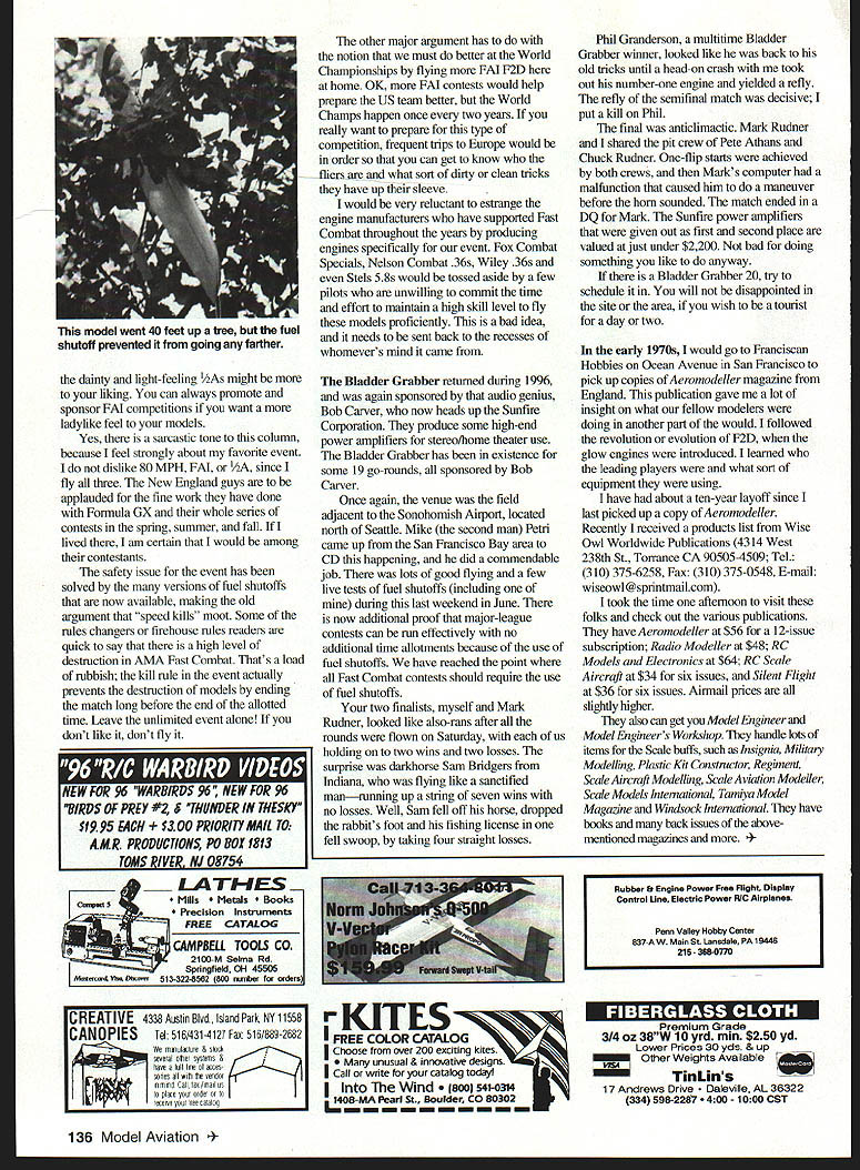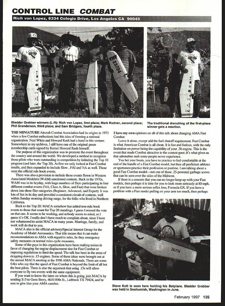 CONTROL LINE COMBAT THE MINIATuRE Aircraft Combat Association its origins 1973 few Combat enthusiasts idea fonmng national organization Neal White Howard Rush hand venture Somewhere archives still have original green membership cards signed Kernel Howard Rush himself purpose organization promote event throughout countty around world developed method recognize pilots outstanding competition initiating Top 10 program later Top 20 first oaly looked Fast Combat results expanded include Slow well official rule book events also provision include events flown Western Associated Modelers WAM sanctioned contests Back 1970s WAM its heyday huge numbers fliers participating four different combat events Class Slow Fast broken down three flier categories Beginner Advaneed Expert lots fun its day provided consistent circuit contests well within Sunday morning driving range folks lived Northern California Back Top 20 MACA somehow has added non-rule book events count Top 20 standings guess missed vote seems working nobody seems mind guess its OK Ireally dont have much complain about since have volunteered assist MACA years Marriage family work will MACA also official advisory/Special Interest Group Academy Model Aeronautics title means can make recommendations AMA regard rules emergency safety measures normal rules-cycle measures Some guys organization have making noises favor changing engine displaeement size Fast Combat imposing regulations limit speed talk has areas dropping down 15 engines Some ideas brought out annual MACA meeting 1996 AMA Nationals some folks say speed Fast Combat beyond limit best pilots also argument using 15s will allow everyone fly two events same equipment want know latest going join MACA sending $15 Gene Berry 4610 89th St Lubbock TX 79424 sure give him AMA number have own opinions talk about changing AMA Fast Combat Leave alone except add fuel shutoff requirement Fast Combat what American Combat about fast furious limitation power being capability 36 engine event made Combat attractive contest-goer its what gives us adrenaline rush some people never experience bet boots have practice feel comfortable end handle Fast Combat model proficient athietes sportsmen practice profession pastime am talking about good Fast Combat modelnot 25-powered garbage scows can seen over skies Midwest concern can no longer keep up Fast models perhaps time look seriously 80mph have serious reflex loss Formula GX have problem Fast model pulling arm too much perhaps February 1997 135 Bladder Grabber winners L-R Rich von Lopez first place Mark Rudner second place Phil Granderson third place Sam Bridgers fourth place traditional drenching first-place winner gets reaction Steve Kott seen holding Batplane Bladder Grabber held Snohomish Washington June dainty light-feeling As might liking can always promote sponsor FM competitions want ladylike feel models Yes sarcastic tone column because feel strongly about favorite event dislike 80 MPH FAI /2A since fly three New England guys applauded fine work have done Formula GX whole series contests spring summer fall lived am certain would among contestants safety issue event has solved versions fuel shutoffs now available making old argument speed kills moot Some rules changers firehouse rules readers quick say high level destruction AMA Fast Combat Thats load rubbish kill rule event actually prevents destruction models ending match long before end allotted time Leave unlimited event alone dont like dont fly _LA TI-f ES Mills ls s Precision Instruments FREE CATALOG CAMPBELL TOOLS Co 2100-M Selma Rd Spnngfield Oil 45505 Meserer4 Y DIer 513-3228562 800 emiter orde other major argument has notion must better World Championships flying FAT F2D home OK FM contests would help prepare US team better World Champs happen once two years really want prepare type competition frequent trips Europe would order can get know -fliers what sort dirty clean tricks have up sleeve would very reluctant estrange engine manufacturers have supported Fast Combat throughout years producing engines specifically event Fox Combat Specials Nelson Combat 36s Wiley 36s Stels 58s would tossed aside few pilots unwilling commit time effort maintain high skill level fly models proficienfly bad idea needs sent back recesses whomevers mind came Bladder Grabber returned during 1996 again sponsored audio genius Bob Carver now heads up Sunfire Corporation produce some high-end power amplifiers stereo/home theater use Bladder Grabber has existence some 19 go-rounds sponsored Bob Carver Once again venue field adjacent Sonohomish Airport located north Seattle Mike second man Petri came up San Francisco Bay area CD happening did commendable job lots good flying few live tests fuel shutoffs including during last weekend June now additional proof major-league contests can run effectively no additional time allotments because use fuel shutoffs have reached point Fast Combat contests should require use fuel shutoffs two finalists myself Mark Rudner looked like also-rans after rounds flown Saturday us holding two wins two losses surprise darkhorse Sam Bridgers Indiana flying like sanctified manrunning up string seven wins no losses Well Sam fell off horse dropped rabbits foot fishing license fell swoop taking four straight losses Phil Granderson multitime Bladder Grabber winner looked like back old tricks until head-on crash took out number-one engine yielded refly refly semifinal match decisive put kill Phil final anticlimactic Mark Rudner shared pit crew Pete Athans Chuck Rudner One-flip starts achieved both crews Marks computer malfunction caused him maneuver before horn sounded match ended DQ Mark Sunfire power amplifiers given out first second place valued just under $2200 bad doing something like anyway Bladder Grabber 20 try schedule will disappointed site area wish tourist day two early 1970s would go Franciscan Hobbies Ocean Avenue San Francisco pick up copies Aeromodeller magazine England publication 