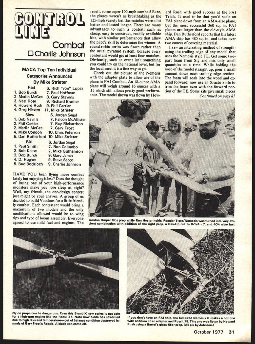 Fast 1 Bob Burch 2 Marlin McGee 3 Neal Rose 4 Howard Rush 4 Greg Hissem Slow 1 Bob Naville 2 Phil Cartier 2 Marlin McGee 4 Mike Condon 5 Dan Rutherford FAt 1 Paul Smith 2 Bob Keese 2 Bob Burch 4 D Hughes 5 Bud Bodzioch 6 Rich von Lopez 7 Paul Hoffman 8 Gary Stevens 9 Richard Brasher 9 Phil Cartier 11 Mike Strieter 6 Jordan Segal 7 Falcon McAllister 7 Ray Richardson 7 Gary Frost 10 Chris Peterson 10 Mike Strieter 6 Jordan Segal 7 Ron Columbo 7 Mike Guthamson 9 Gary James 9 Steve Sacco 9 Charlie Johnson HAVE YOU flying combat lately enjoying less Does thought losing high-performance monsters make lose sleep night Well friends one-design contest just might answer group us decided build Voodoos little friend ly combat contestant would bring maximum two models modifications allowed would wing tips type boom assembly Everyone agreed use mild fuel engines result some super 100-mph combat Sure planes werent breathtaking 125-mph variety matches lot better lasted longer advantages such contest such cheap easy-to-construct readily available kits similar performances allow pilots skill determine winner round-robin series flown rather usual pyramid system because contestant would get least four matches Obviously such event isnt something could try national level local meet fine way go Check out picture Nemesis adaptor plate allow use plane FAI Combat An 18-ounce AMA plane will weigh around 16 ounces 15 still allows pretty good perform ance model shown flown Howard Rush good success FAI Trials used youd scale FAI plane down AMA-size plane successful 360 sq FAI planes larger old-style AMA ship Dan Rutherford reports latest AMA ship has 480 sq takes over two ounces covering material saw interesting method strength ening trailing edge model uses Nemesis style TE Get some twopart foam Sig mix small quantities time holding nose model straight up pour small amount down trailing edge section foam will soak wood ex pand forward now use X-acto knife trim foam forward por tion TE Some kits give small pieces Continued page 87 October1977 31 Combat 0 Charlie Johnson MACA Top Ten Individual Categories Announced Mike Strieter Gordon Harper flips prop Ron Hester holds Popular Tigre/Nemesis turned very effi cient combination addition right prop Rev-up cut 8-1/4 7 40% nitro fuel Nylon props can dangerous Brand-X new series safe high-rpm engine like Rossi 15 Note blade has stretched dont have FAI ship full-sized Nemesis II makes hot due high revs temperatureout balance condition destroyed in- addition adaptor Rossi 15 flown Howard nards Gary Frosts Rossie blade can come off Rush using Bartels glass-fiber prop pix byJohnsont RC Pylon/Lane continued page 23 judging Awards given cate gory round Aerobatics Sep arate awards given Awards given top winner three events combined scores Scale round Aerobatic flight occurs same time Contestant may enter events Name EventF-l/l0 cc Kong Rac ing -Scale Racing Whatever -size Little Tony available C B Associates Inc now Shoestring Rivets will available later year Little Mike will follow inter ested call Bob Seigelkoff 21658 Cloud Way Hayward CA 94545 phone 415783-4868 watched demonstration flight Bakersfield contest C Bs Min nows very stable flier weighed over 11 lbs very fast keep planes down 7- 8-lb range should move right along am trying say should go fast Formula 1 have go fast enough make easy han dle make interesting Now two new classes get ting off ground would like pro pose third class /4-scale racing air craft am sure "-scale right phrase think should Formula 800 class because 800 sq wing rule both AT-6 Formula 1 Class es Anyway getting back third class racing about Golden Age Air Racing would really like see Browns Lairds Ikes Mikes Schoenfelts etc 800 sq category aircraft lend themselves very well style model would probably little faster AT-6s Formula jobs due cleaner front-end design in-line engines like round en gines plenty choose thirties would like hear would interested thirties type aircraft racing 800 sq size can get enough interest can probably get Jack Stafford Models pro duce Brown B-3 larger size am going build test prototype new pylon racing manufacturer has come up some nice aircraft glass-and-foam buffs Model Mer chant 2405 Fairview PIano TX 75075 has available following et Formula aircraft Ricky Rat $2495 et Pogo $5995 et Mustang $5995 Q-500 Super Quick $5995 preassembled balsa fuselage F-l Super Midget Mustang II $9995 Thats month Go fast turn left Dave Lane 4477 W 136th St thorne CA 90250 CL Combat/Johnson continued page 31 foam glued TE method lot stronger since everything bonded together unit small sup ply foam will hundreds models News MACA True word Mike Stricter announced top Ten Individual Categories Below results MACA First VP George Mattel going Haw- hot heavy combat recently naming DVPs Districts V VII XI interested becoming DVP District write George let ter address 105 Franklin Rd Hamden CT 06517 over 300 MACA members list grows day havent already joined send $600 MACA Treasurer Pat Sasnett 1443 McKinley Ave Escondido CA 92027 latest issue MA CA Newsletter contained articles engine reworking contest reports complete directory combat fliers throughout USA Europe classified ads specialty parts OCtobeF 1977 87 SoIaFiIm TRY THESE OTHER CONTEST QUALITY PRODUCTS FROM PACTRA ALA HAND SELECTED PRECISION SANDED SHEETS KS DOWELS S TRIANGLES KS PLANKS Aeir GIoh HOT FUEL PROOF DOPE AWARD WINNING HI-GLOSS AND FLAT FINISHES AVAILABLE IN OVER 36 COLORS IN BRUSH AND SPRAY pU11a IncluBtrIes Inc 7060 HOLLYWOOD BLVD LOS ANGELES CA 90028 MORE wi1fld9 same powerYELLOW4 adr G0.sePROPELL Taco e\eeO~ 5 4 304 ~4O-53 54c h trv%o63 64 354 ~ 76 78 504 ~OXI84 86 88 654 94969798 \ 6e-104 10685 11-4 11-6 11-81 lC24 12526150 GRISH BROS ST JOHN INDIANA 46373 available manufacturers interesting item G-2 1 Tigre crank offered Aloise Engineering & De velopment 2314 Loy Ln Los Angeles CA 90041 $2000 get crank 900 rpm faster stock will break B-M cranks still available new Fox Rich Bra
