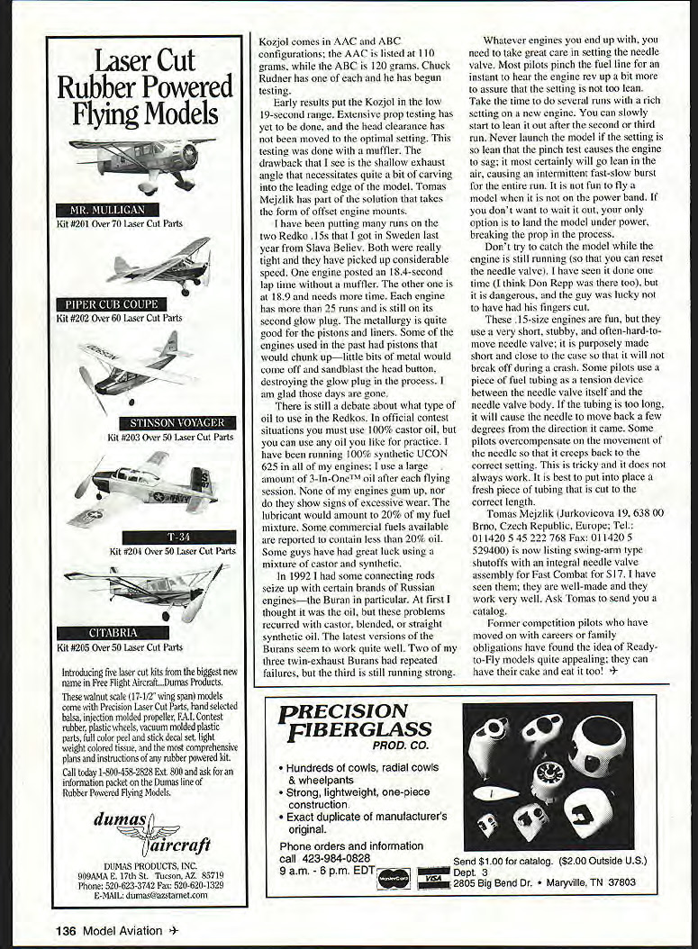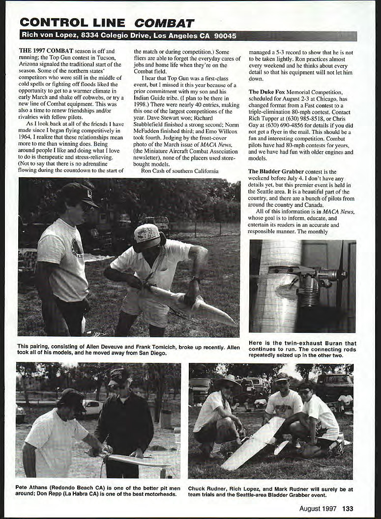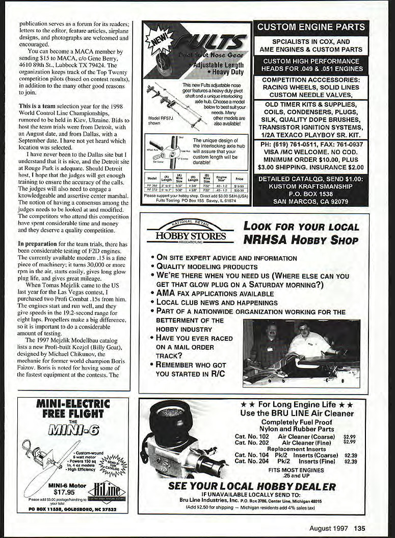 CONTROL LINE COMBAT U 1 THE 1997 COMBAT season off running Top Gun contest Tucson Arizona signaled traditional start season Some northern states competitors still middle cold spells fighting off floods liked opportunity get wanner climate early March shake off cobwebs try new line Combat equipment also time renew friendships and/or rivalries fellow pilots As look back friends have made since began flying competitively 1964 realize relationships mean winning does Being around people like doing what love therapeutic stress-relieving say no adrenaline flowing during countdown start match during competition Some fliers able forget everyday cares jobs home life theyre Combat field hear Top Gun first-class event missed year because prior commitment son Indian Guide tribe plan 1998 nearly 40 entries making largest competitions year Dave Stewart won Richard Stubblefield finished strong second Norm McFadden finished third Emo Willcox took fourth Judging front-cover photo March issue MACA News Miniature Aircraft Combat Association newsletter placers used storebought models Ron Cash southern California managed 5-3 record show taken lightly Ron practices almost weekend thinks about detail equipment will let him down Duke Fox Memorial Competition scheduled August 2-3 Chicago has changed format Fast contest triple-elimination 80-mph contest Contact Rich Tupper 630 985-8518 Chris Gay 630 690-4856 details did get flyer mail should fun interesting competition Combat pilots have 80-mph contests years have fun older engines models Bladder Grabber contest weekend before July 4 dont have details yet premier event held Seattle area beautiful part country bunch pilots around country Canada information MACA News goal inform educate entertain its readers accurate responsible manner monthly August 1997 133 twin-exhaust Buran pairing consisting Allen Deveuve Frank Tomicich broke up recently Allencontinues run connecting rods took models moved away San Diegorepeatedly seized up other two Pete Athans Redondo Beach CA better pit men Chuck Rudner Rich Lopez Mark Rudner will surely around Don Repp La Habra CA best motorheads team trials Seattle-area Bladder Grabber event publication serves forum its readers letters editor feature articles airplane designs photographs welcomed encouraged can become MACA member sending $15 MACA Gene Berry 4610 89th St Lubbock TX 79424 organization keeps track Top Twenty competition pilots based contest results addition other good reasons join team selection year 1998 World Control Line Championships rumored held Kiev Ukraine Bids host team trials Detroit August date Dallas September date have yet heard location selected have never Dallas site understand nice Detroit site Rouge Park adequate Should Detroit host hope judges will get enough training ensure accuracy calls judges will also need engage knowledgeable assertive center marshal notion having consensus among judges needs looked modified competitors attend competition have spent considerable time money deserve quality competition preparation team trials has considerable testing F2D engines currently available modem 15 fine piece machinery turns 30000 rpm air starts easily gives long glow plug life gives great mileage Tomas Mejzlik came US last year Las Vegas contest purchased two Profi Combat him engines start run well give speeds 192-second range eight laps Propellers make big difference important considerable amount testing 1997 Mejzlik Modellbau catalog lists new Profi-built Kozjol Billy Goat designed Michael Chikunov mechanic former world champion Boris Faizov Boris noted having some fastest equipment contests The unique design interlocking axle hub will assure custom length will durable 12$1999 12$2039 ON SITE EXPERT ADVICE AND INFORMATION QUALITY MODELING PRODUCTS WERE THERE WHEN YOU NEED US WHERE ELSE CAN YOU GET THAT GLOW PLUG ON SATURDAY MORNING AMA FAX APPLICATIONS AVAILABLE LOCAL CLUB NEWS AND HAPPENINGS PART OF NATIONWIDE ORGANIZATION WORKING FOR THE BElTERMENT OF THE HOBBY INDUSTRY HAVE YOU EVER RACED ON MAIL ORDER TRACK REMEMBER WHO GOT YOU STARTED IN RIC August1997 135 fr SICIALISTS IN CUX ANDI AME ENGINES & CUSTOM PARTS RACING WHEELS SOLID LINES CUSTOM NEEDLE VALVES OLD TIMER KITS & SUPPLIES COILS CONDENSERS PLUGS SILK QUALITY DOPE BRUSHES TRANSISTOR IGNITION SYSTEMS 112A TEXACO PLAYBOY SR KIT PH 619 761-0511 FAX 761-0937 VISA IMC WELCOME NO COD MINIMUM ORDER $1000 PLUS $300 SHIPPING INSURANCE $200 new Fults adjustable nose gear features heavy duty p#vot shaftandauniqueintertocldng axle hub Choose model below best suit needs Model RF57J ~other models shown also available ModelL4th Si Please support hobby shop Direct add $300 S&H USA Fults Tooling P0 Box 155 Savoy IL 61874 Priee ONA[r~ LOOK FOR YOUR LOCAL HOBBY STORES NRHSA HOBBY SHOP MINIELECTRIC FREE FLIGHT TH Custom-wound e watt motor Powersl5Osq models High Efficiency MINI4 Motor $1 795 Please add $300 postage/handling total P0 Box 11553 GOLOSUORO NC 27532 * * Long Engine Life * * Use BRU LINE Air Cleaner Completely Fuel Proof Nylon Rubber Parts Cat No 102 Air Cleaner Coarse $299 Cat No 202 Air Cleaner Fine $299 Replacement Inserts Cat No 104 Pk/2 Inserts Coarse $239 Cat No 204 Pk/2 Inserts Fine $239 FITS MOST ENGINES 25andUP SEE YOUR LOCAL HOBBY DEALER IF UNAVAILABLE LOCALLY SEND TO Bru Line Industries Inc po Box3786 Cente Line Mchgan48Ol5 Add $2 50 sh pp ng M ch gan res dents add 4% sa es tax Laser Cut Rubber Powered Flying Models Kit #201 Over 70 Laser Cut Parts Kit #202 Over 60 Laser Cut Parts Kit #203 Over 50 Laser Cut Parts Kit #204 Over 50 Laser Cut Parts / Kit #205 Over 50 Laser Cut Parts Introducing five laser cut kits biggest new name Free Flight Aircraft.Dumas Products walnut scale 17-1/2 wing span models come Precision Laser Cut Parts hand selected balsa injection molded propeller FAT Contest rubber plastic wheels vacuum molded plastic parts full color peel stick decal set light weight colored tissue comprehensive plans instructions rubber powered kit 