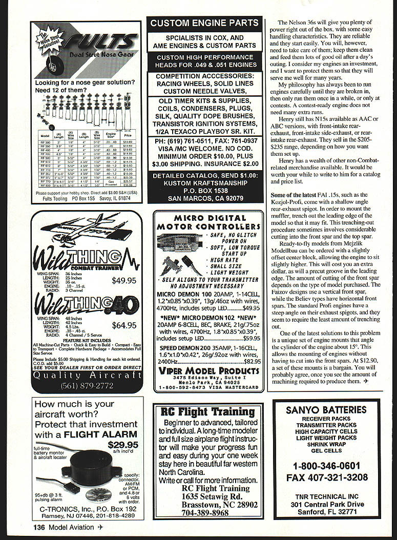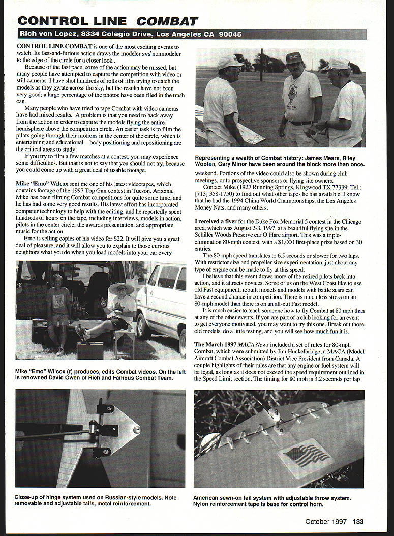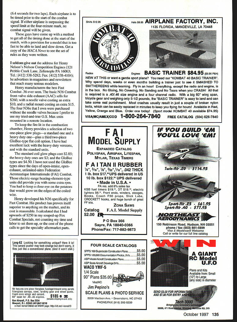 CONTROL LINE COMBAT 1 L1 L1 IN CONTROL LINE COMBAT exciting events watch Its fast-and-furious action draws modeler nonmodeler edge circle closer look Because fast pace some action may missed people have attempted capture competition video still cameras have shot hundreds rolls film trying catch models gyrate across sky results have very good large percentage photos have filed trash can people have tried tape Combat video cameras have mixed results problem need back away action order capture models flying entire hemisphere above competition circle An easier task film pilots going through motions center circle entertaining educationalbody positioning repositioning critical areas study try film few matches contest may experience some difficulties say should try because could come up great deal usable footage Mike Emo Wilcox sent latest videotapes contains footage 1997 Top Gun contest Tucson Arizona Mike has filming Combat competitions quite some time has some very good results latest effort has incorporated computer technology help editing reportedly spent hundreds hours tape including interviews models action pilots center circle awards presentation appropriate music action Emo selling copies video $22 will give great deal pleasure will allow explain curious neighbors what you load models car weekend Portions video could also shown during club meetings prospective sponsors flying site owners Contact Mike 1927 Running Springs Kingwood TX 77339 Tel [713] 358-1750 find out what other tapes has available know 1994 China World Championships Los Angeles Money Nats others received flyer Duke Fox Memorial 5 contest Chicago area August 2-3 1997 beautiful flying site Schiller Woods Preserve ear OHare airport tripleelimination 80-mph contest $1000 first-place prize based 30 entries 80-mph speed translates 65 seconds slower two laps restrictor size propeller size experimentation just about type engine can made fly speed believe event draws retired pilots back action attracts novices Some us West Coast like use old Fast equipment rebuilt models models battle scars can have second chance competition much less stress 80-mph model all-out Fast model much easier teach someone fly Combat 80 mph other events part club looking event get everyone motivated may want try Break out old models little testing will see much fun March 1997 MACA News included set rules 80-mph Combat submitted Jim Huckelbridge MACA Model Aircraft Combat Association District Vice President Canada couple highlights rules engine fuel system will legal long does exceed speed requirement outlined Speed Limit section timing 80 mph 32 seconds per lap October1997 133 Representing wealth Combat history James Mears Riley Wooten Gary Minor have around block once Mike Emo Wilcox r produces edits Combat videos leff renowned David Owen Rich Famous Combat Team Close-up hinge system used Russian-style models NoteAmerican sewn-on tail system adjustable throw system removable adjustable tails metal reinforcementNylon reinforcement tape base control horn 64 seconds two laps airplane timed prior start combat signal either airplane surpassing speed limit four-minute mark no combat signal will given guys have come up method get timing done start match provision model too fast able land slow down Get copy MACA News see set rules written seldom give out address Henry Nelsons Nelson Competition Engines 121 Pebble Creek Lane Zelienople PA 16063 Tel [412] 538-5282 Fax [412] 538-4104 advertises magazines newsletters reach serious modelers Henry manufacturers best Fast Combat 36 ever seen basic N36 Combat front-valve side-exhaust AAC sells $260 needle valve costing extra $10 radial mount costing extra $15 four N36s own purchased needle valves because prefer use tried-and-true 05 Max units mounted remote location keep fire lit combustion chamber Henry provides selection two one-piece glow plugsa standard heavy duty oneplus third two-piece GbBee-type flat coil option have excellent luck heavy duty versions standard units standard coil glow plugs cost $285 heavy duty ones $3 GloBee types $450 have used GloBee types since days open-intake open exhaust unlimited-nitro Federation Aeronautique Intemationale FAI Combat electric-range heating-element-type units did provide some extra rpm keep close eye potatoes would grow edges coiled wire Henry developed N36 specifically Fast Combat product has proven itself superior anything market its cost reasonable calculated upwards $250 souped-up Fox Combat Specials counting time labor set up cost phone calls get specialty aftennarket parts Shirts $129 CD Hats $995 AIRPLANE FACTORY INC 1135 FLORIDA MANDEVILLE LA 70448 RadiosEngines BASIC TRAINER $8495 tss9sP&H NEW AT THIS want gentle sport plane need KOMBAT 40 BASIC TRAINER spend days weeks months building trainer just see SMASHED TO SMITHEREENS learning Fly hour Everything except radio engine box No Gluing No Covering No Sanding No Tears CRASH required 40146 size engine four channel radio big 60 wing span tricycle gear weighing 5-1/2 pounds BASIC TRAINER easy land can take some real punishment Most crashes usually result just couple broken nylon bolts can easily replaced minutes keep flying hours Available Red Yellow Orange Blue Order today Sport model KOMBAT 40 available $7495 VISAIIMCIAMEX/COD 1-800-264-7840 FREE CATALOG 504 626-7840 FAI MODEL Su~i EXPANDED CATALOG POLYSPAN AIRSPAN LITESPAN MYLAR TEXAS TIMERS FAITAN II RUBBER 1A 3/~ /a %2ll/16 042 THICK 1 lb box $1 delivered US 10 lb box $122 UPS delivered Made USA. PA res add 6% sales tax KSB fuel timers 1900 electric lighters $600 Front ends winders stooges Books Czech P30 props Slick Lube CROCKETT hooks huge bunch great FE kits ZONA SAWS CatalogFAI Model Supply $200 Ij P 0 Box 366 Sayre PA 18840-0366 Phone/Fax 717-882-9873 150 Robinson Road Hudson NH 03051 phone fax 603 881-5899 Visa & Mastercard Welcome Call write tor tull line catalog IF YOU BUILD EM YOULL LOVE EM Long-EZ Looking something unique canard pusher may look stran