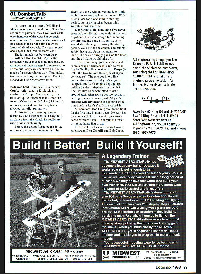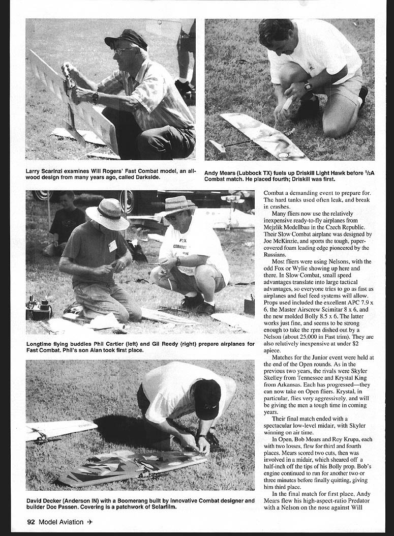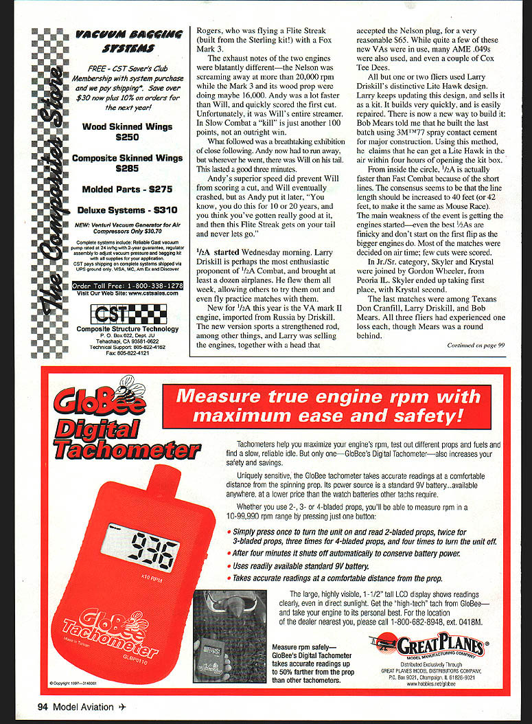 CONTROL LINE COMBAT .aa THOSE WHO DIDNT make out Muncie Nats year missed almost perfect Combat flying weather no rain moderate temperatures toward end week just enough wind keep us cool some surprises spectacular matches third consecutive year Fox sponsored unofficial Super Slow event held Sunday before official events began First prize Fox 35 Stunt 17 entries biggest Combat event Nats Since airplane allowed low-key event manner airplane could attach 35 Stunt usedfoamies Fast Slow old Flite Streaks Czech-built F2D models few midairs matches long highest-scoring match very first Joe Kresnak Jr scored 901 points taking four cuts 200 bonus safety points 50 points winning 251 seconds airtime couple fliers did manage break speed limit notably James Mears Henry Nelson Stock Fox 35 Stunts dont usually fly fast could score two cuts staying out midairs did well final results Henry Nelson 2262 points Krystal King 2197 points Larry Davis 2027 points Charles Abbot 1990 points Official events began Monday morning Slow Combat requires airplanes fiveinch nose moments 24-inch total length suction fuel feed makes Slow 90 Model Aviation Don Cranfills airplane flies through Chuck Clines shedding right wing streamer bladder full fuel Don Cranfill pits airplane easy waysifting down Design former world champion Loet Wakkerman Krystal Kings mother Jeanine pined daughter Note Skyler Skelleys streamer still attached Krystals Driskill Light Hawk variant AME power Something unusual Will Rogers Flite Streak took second place Slow Combat Power Fox Mark 3 Combat Special Mears belicrank fuel shutoff uses length music wire spring Shown armed-for-launch position Wayne McDaniel Texas paired against Muncie native Bob Craig F2D Bob ended up taking first place December 1998 91 Combat demanding event prepare hard tanks used often leak break crashes fliers now use relatively inexpensive ready-to-fly airplanes Mejzlik Modellbau Czech Republic Slow Combat airplane designed Joe McKinzie sports tough papercovered foam leading edge pioneered Russians Most fliers using Nelsons odd Fox Wylie showing up Slow Combat small speed advantages translate large tactical advantages everyone tries go fast airplanes fuel feed systems will allow Props used included excellent APC 79 x 6 Master Airscrew Scimitar 8 x 6 new molded Bolly 85 x 6 latter works just fine seems strong enough take rpm dished out Nelson about 25000 Fast trim also relatively inexpensive under $2 apiece Matches Junior event held end Open rounds As previous two years rivals Skyler Skelley Tennessee Krystal King Arkansas has progressedthey can now take Open fliers Krystal particular flies very aggressively will giving men tough time coming years final match ended spectacular low-level midair Skyler winning air time Open Bob Mears Roy Krupa two losses flew third fourth places Mears scored two cuts involved midair sheared off half-inch off tips Bolly prop Bobs engine continued run another two three minutes before finally quitting giving him third place final match first place Andy Mears flew high-aspect-ratio Predator Nelson nose against Will 92 Model Aviation * b Larry Scarinzi examines Will Rogers Fast Combat model all- Andy Mears Lubbock TX fuels up Driskill Light Hawk before 12A wood design years ago called Darkside Combat match placed fourth Driskill first Longtime flying buddies Phil Cartier left Gil Reedy right prepare airplanes Fast Combat Phils son Alan took first place David Decker Anderson IN Boomerang built innovative Combat designer builder Doc Passen Covering patchwork Solarfilm U FREE CST Savers Club Membership system purchase pay shippit Save over $30 now plus IOZ orders next yearl Wood Skinned Wings 5250 aa DA&V U U Composite Skinned Wings 5285 U Complete systems inctode Reliable Gent vacuum pump rated 24 iWhg 2-year guarantee regulator assemkiy auki vacuum pmssum bagging kit supplies applicatiOn CST pays shipping creoplete systems shipped via UPS groand VtSA MC Am En DiscOver •-ito U U_____________ E Molded Parts 5275 Deluxe Systems 5310 NEW Ventun Vacuum Generator farAir Compressors Only $3070 Visit Web Site wwwcstsalescom U U WW mposite Structure Technology P 0 8ox622DeptJU Tehachapi CA 53581-0622 Technical Support 805-822-4162 Foic 805-822-4121 Rogers flying Flue Streak built Sterling kit Fox Mark 3 exhaust notes two engines blatantly differentthe Nelson screaming away 20000 rpm Mark 3 its wood prop doing maybe 16000 Andy lot faster Will quickly scored first cut Unfortunately Wills entire streamer Slow Combat kill just another 100 points outright win What followed breathtaldng exhibition close following Andy now run away wherever went Will tail lasted good three minutes Andys superior speed did prevent Will scoring cut Will eventually crashed Andy put later know 10 20 years think youve gotten really good Flite Streak gets tail never lets go 1hA started Wednesday morning Larry Driskill perhaps enthusiastic proponent hA Combat brought least dozen airplanes flew week allowing others try out fly practice matches New hA year VA mark II engine imported Russia Driskill new version sports strengthened rod among other things Larry selling engines together head accepted Nelson plug very reasonable $65 quite few new VAs use AME 049s also used couple Cox Tee Dees two fliers used Larry Driskills distinctive Lite Hawk design Larry keeps updating design sells kit builds very quickly easily repaired now new way build Bob Mears told built last batch using 3MTM77 spray contact cement major construction Using method claims can get Lite Hawk air within four hours opening kit box inside circle /2A actually faster Fast Combat because short lines consensus seems line length should increased 40 feet 42 feet make same Mouse Race main weakness event getting engines startedeven best Y2As finicky dont start first flip bigger engines Most matches decided air time few cuts scored Jr/Sr category Skyler Krystal joined Gordon Wheeler Peoria IL Skyler ended up taking first place Krystal sec